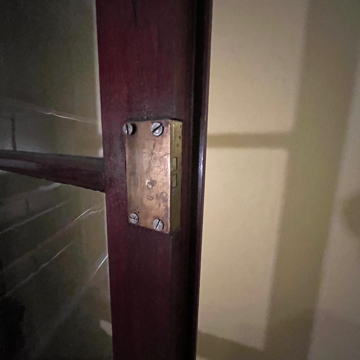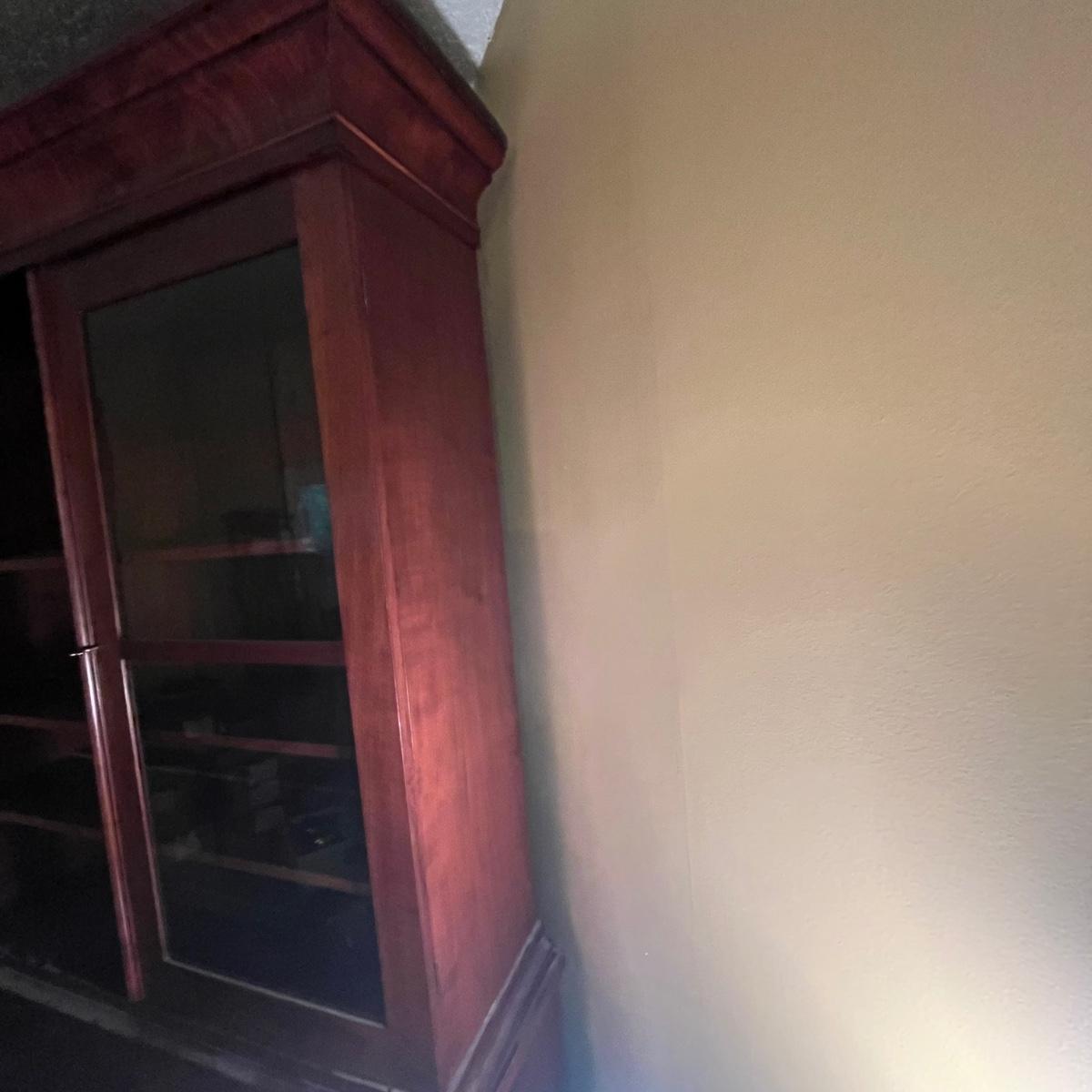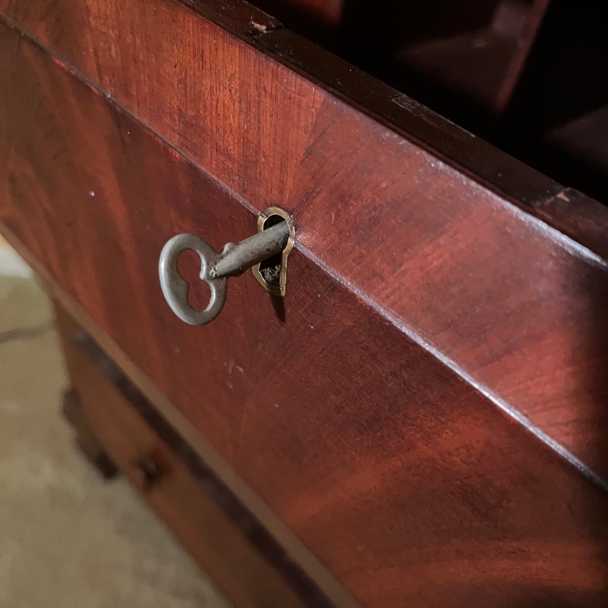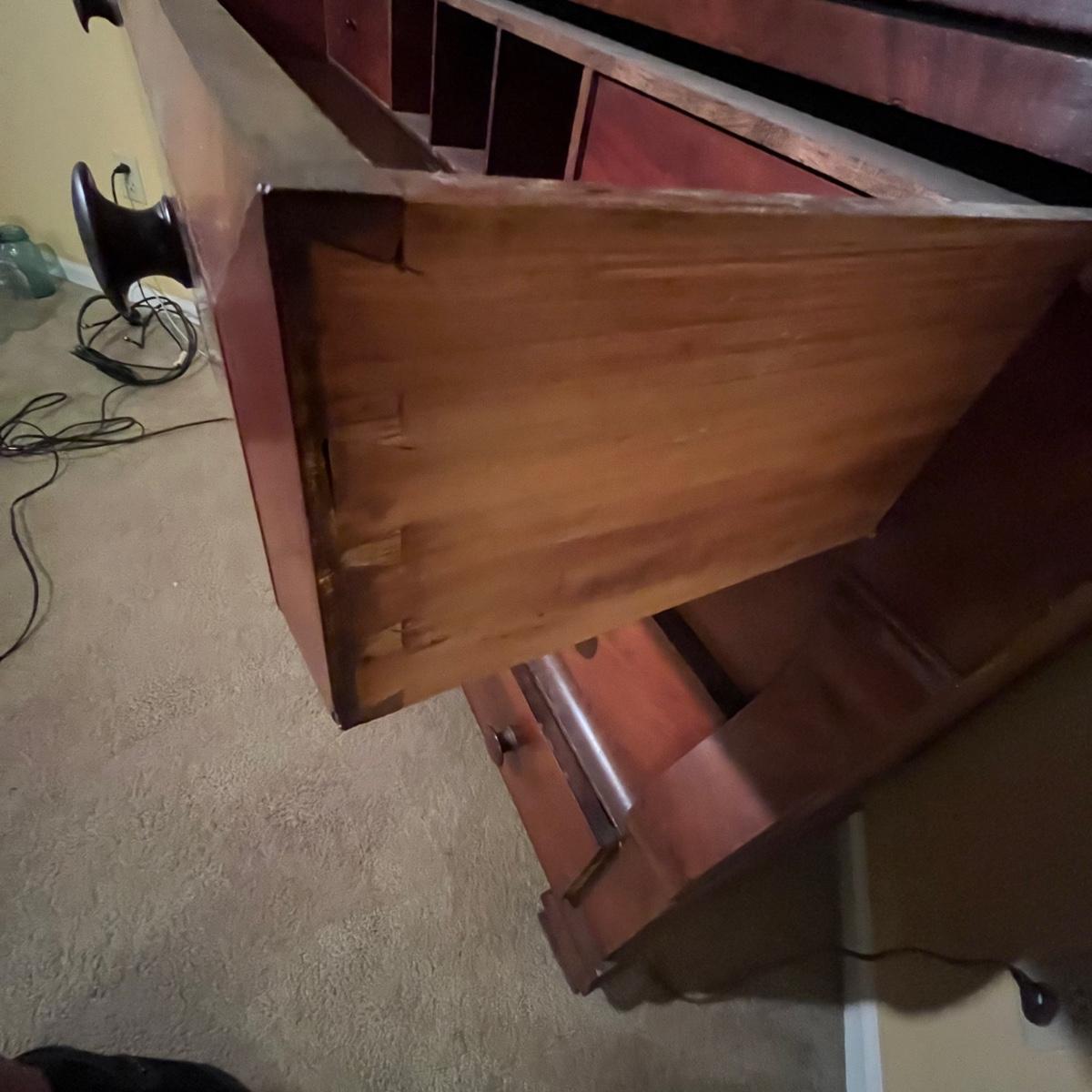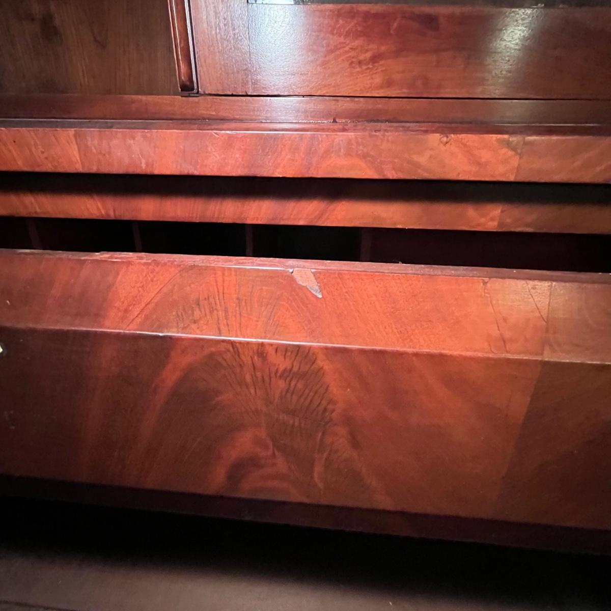 Lot includes an antique display hutch that is in two pieces. The top piece has glass doors with three adjustable wooden shelves and includes key. The bottom piece has four dovetailed drawers; top drawer has cubby holes and also includes the key. Bottom piece measures 20.5” x 44” x 39.5” and top piece measures 13” x 43” x 49.5”. Pictures do not do this piece justice, come check it out at preview. This piece is in great condition with a nick in one drawer, see image.