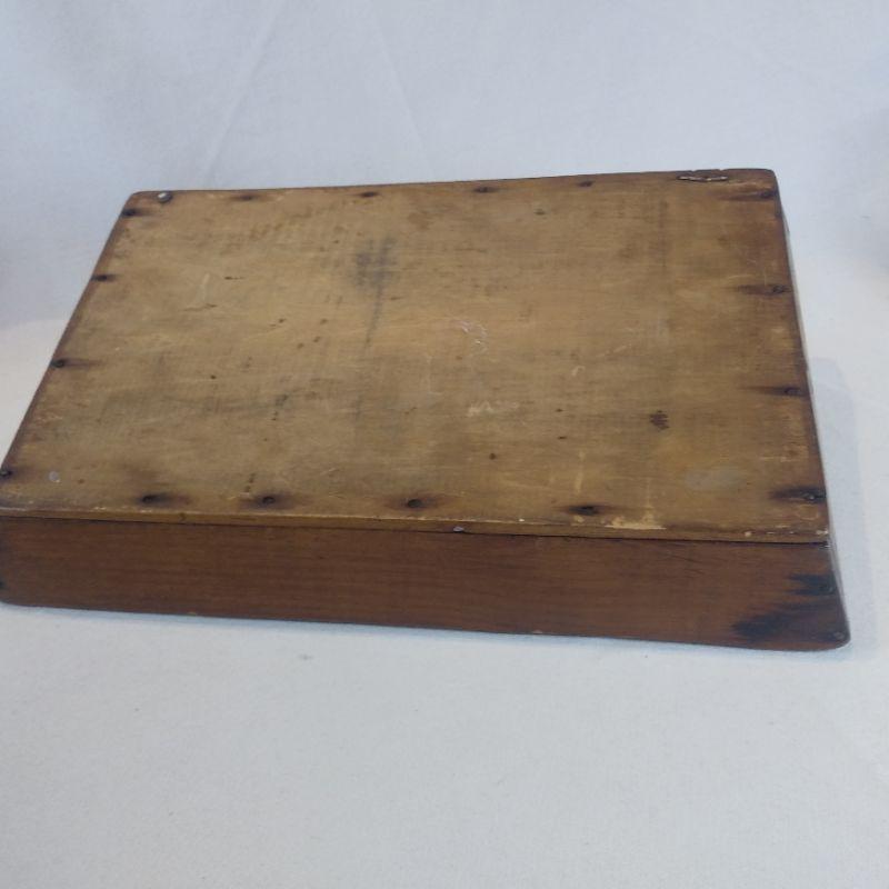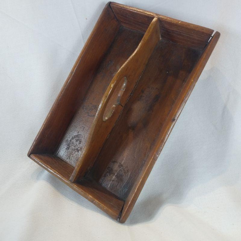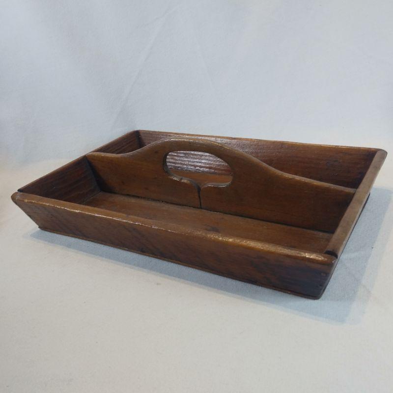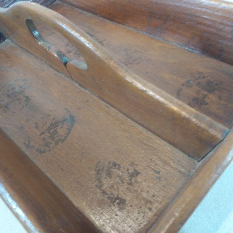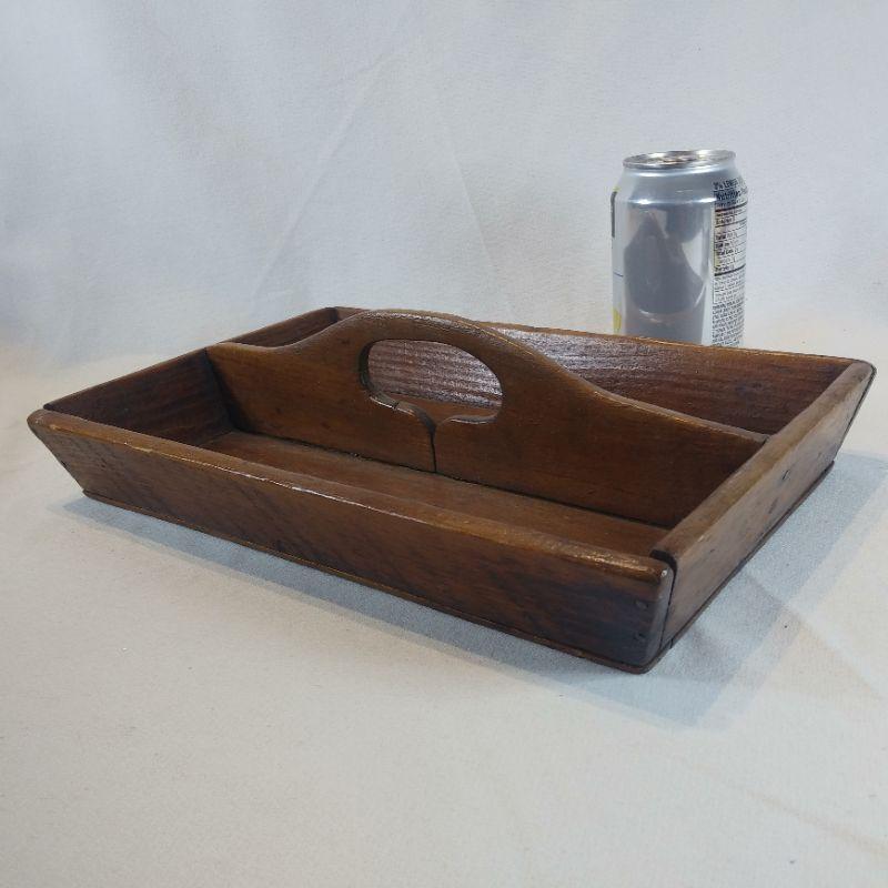 This offering is for an authentic old wood divided carry tray with handle. It is made of solid pine and has slightly warped over the years. It has several water stain marks in its bottom which gives the piece that wonderful antique look. It measures 12-inches long X 8 1/2-inches wide. Very usable.