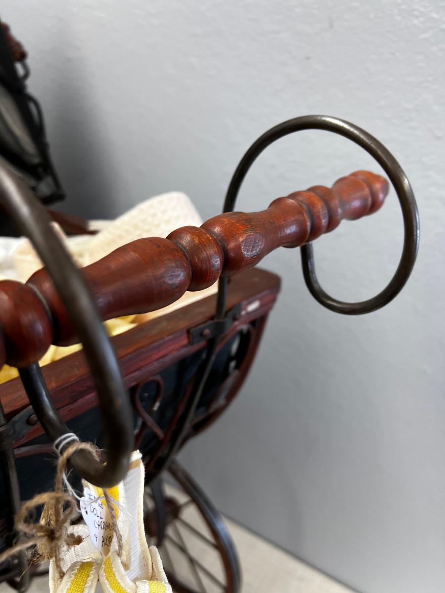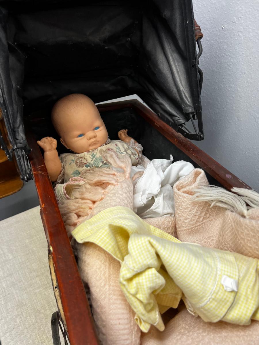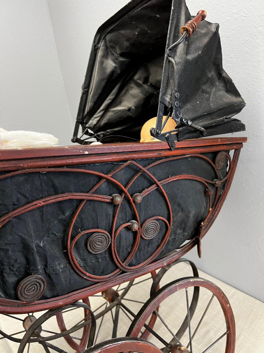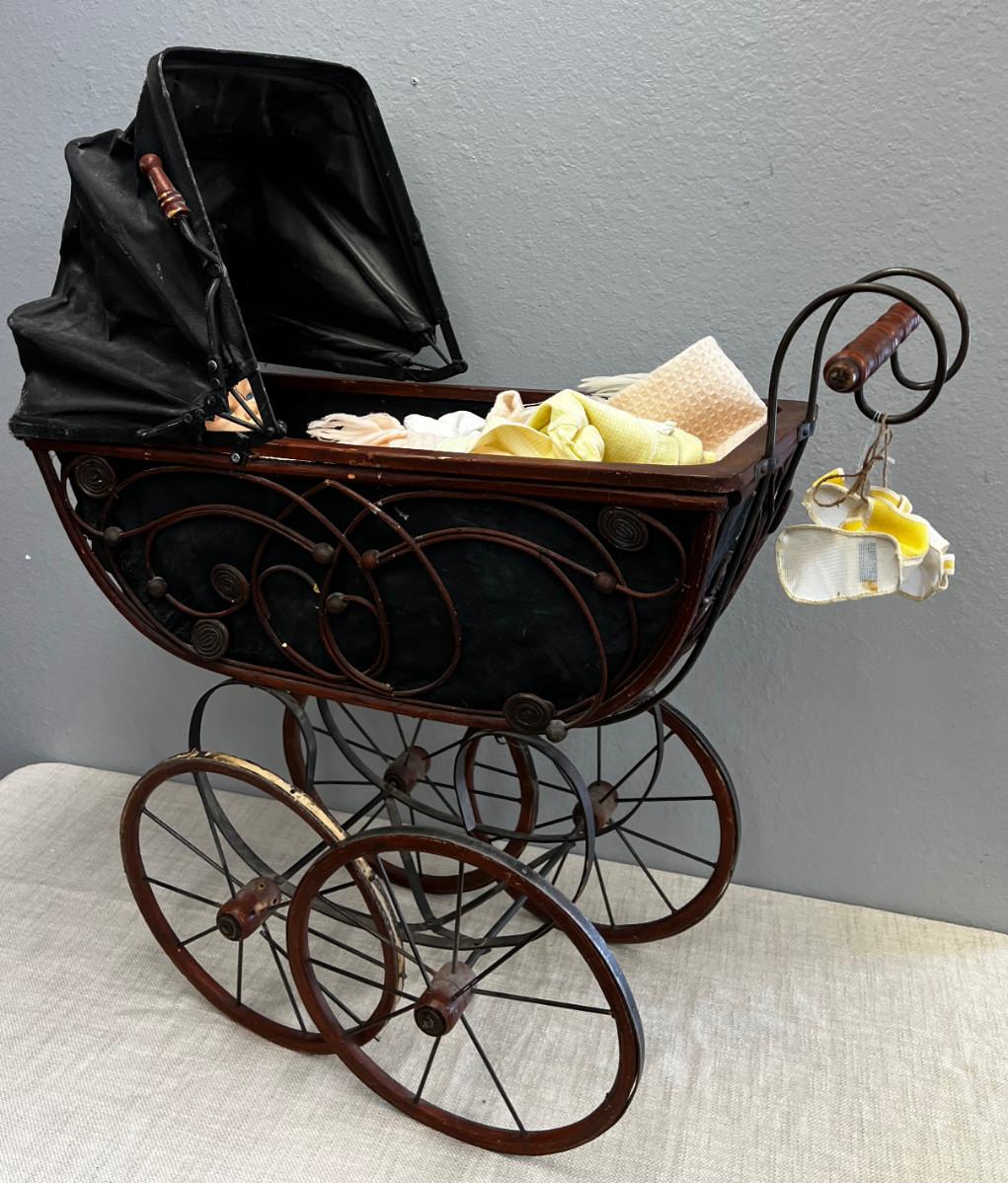 Wheels are rickety! A bit of damage. Doll in is included. 32" Long X 35" Tall