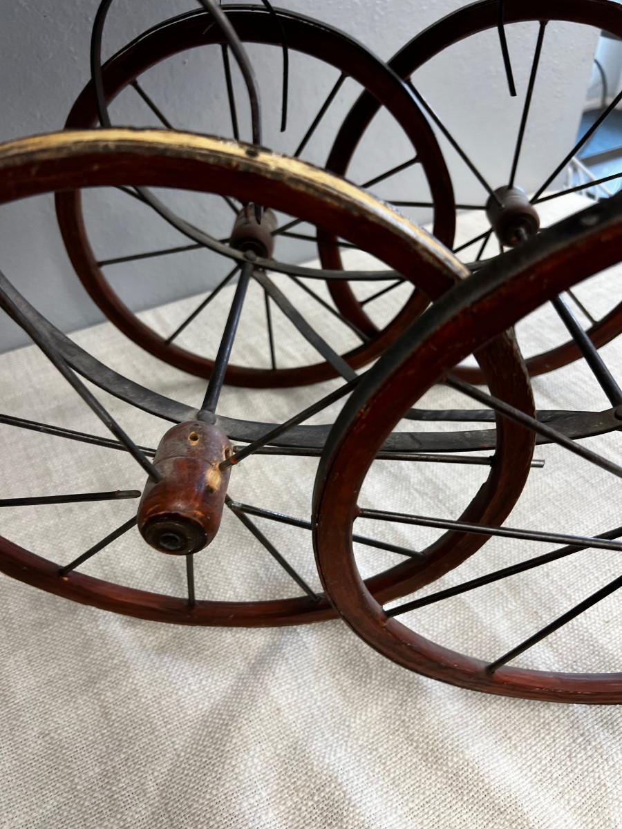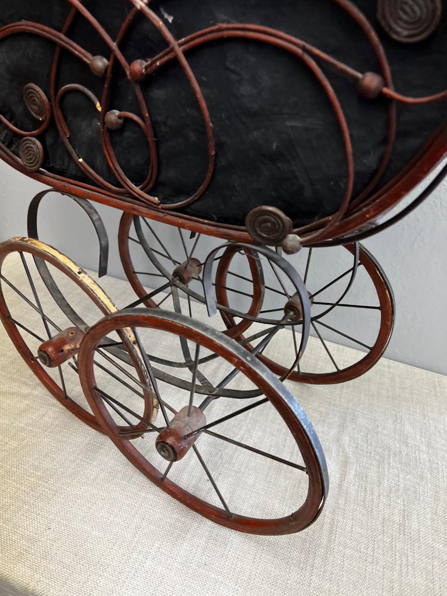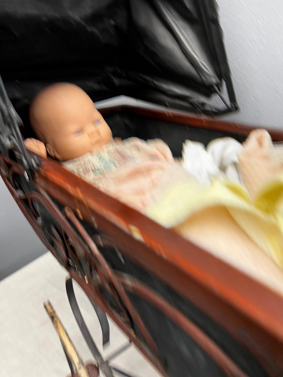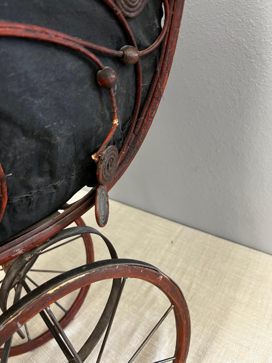 Wheels are rickety! A bit of damage. Doll in is included. 32" Long X 35" Tall