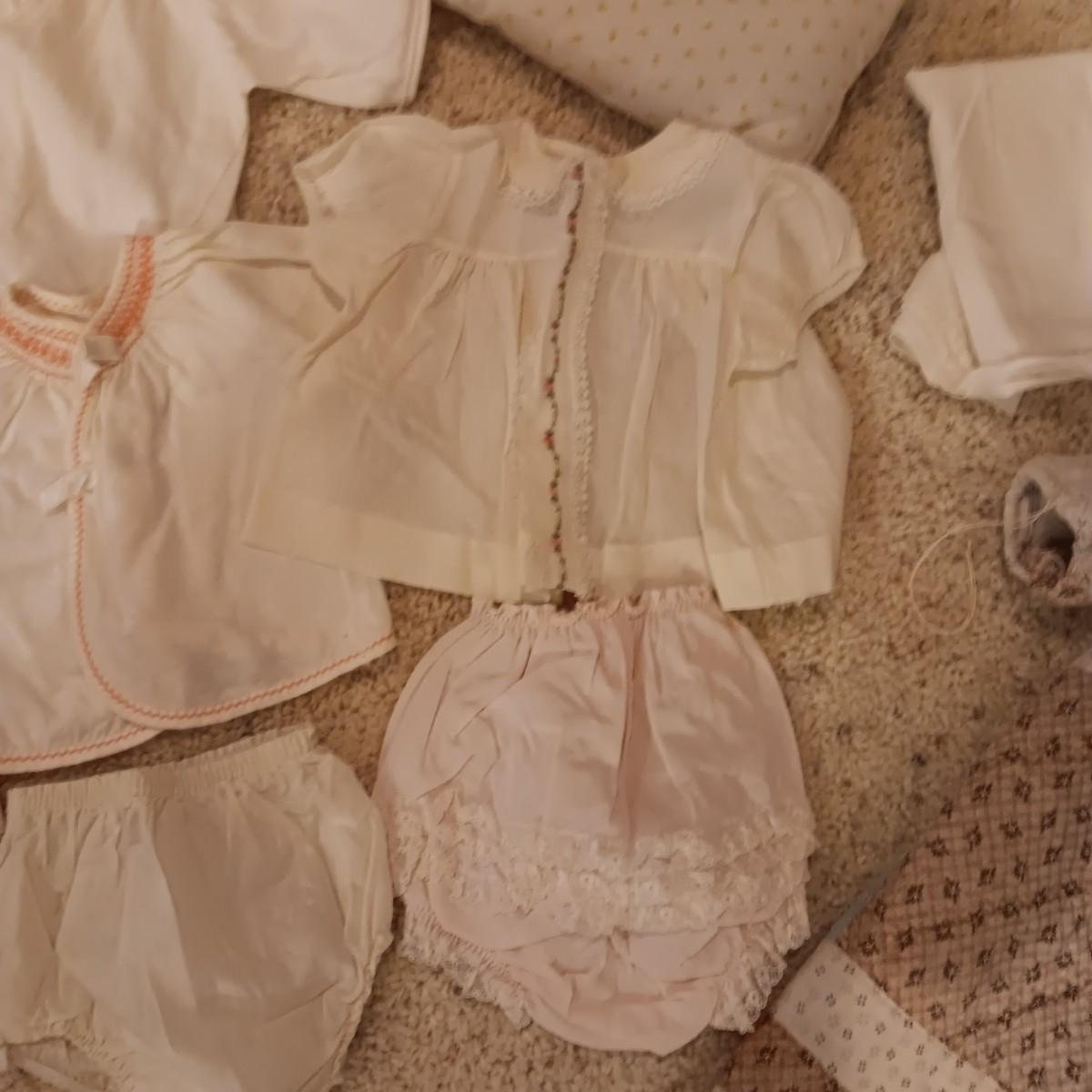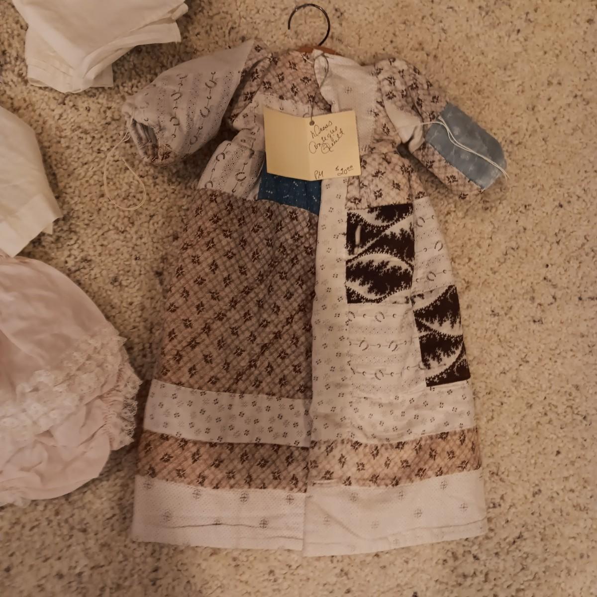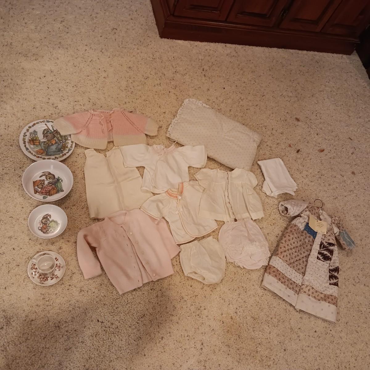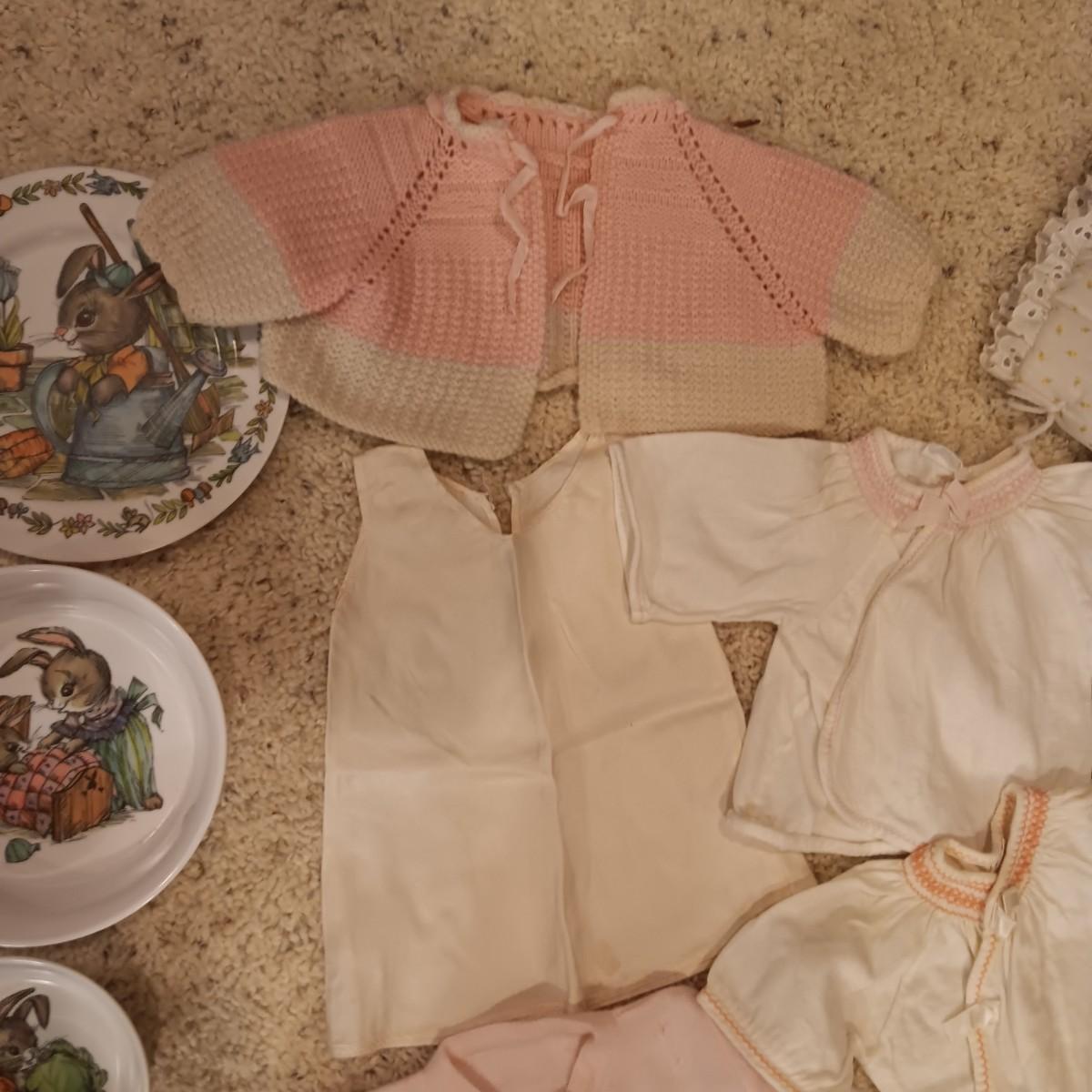 ANTIQUE DOLL DRESS AND OLDER DOLL CLOTHES PLUS RABBIT DISHES