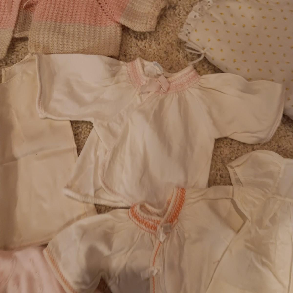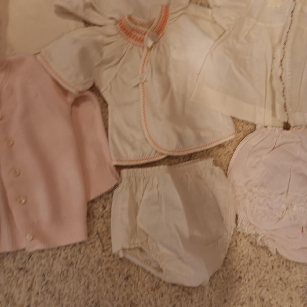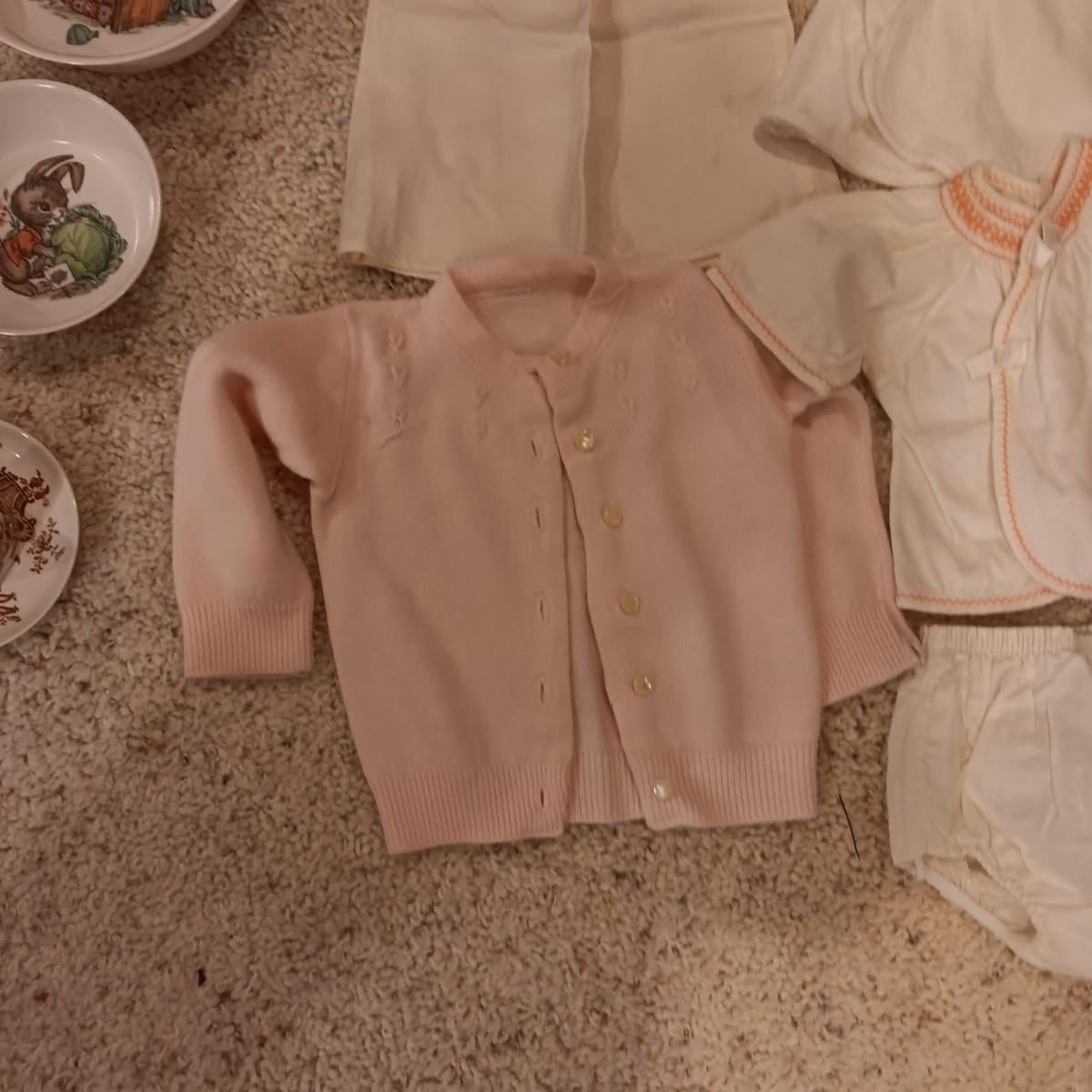 ANTIQUE DOLL DRESS AND OLDER DOLL CLOTHES PLUS RABBIT DISHES