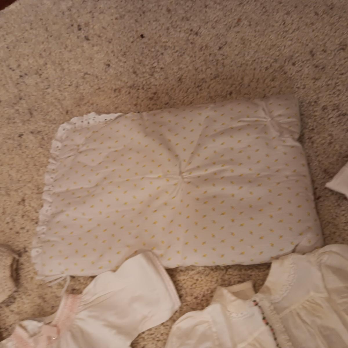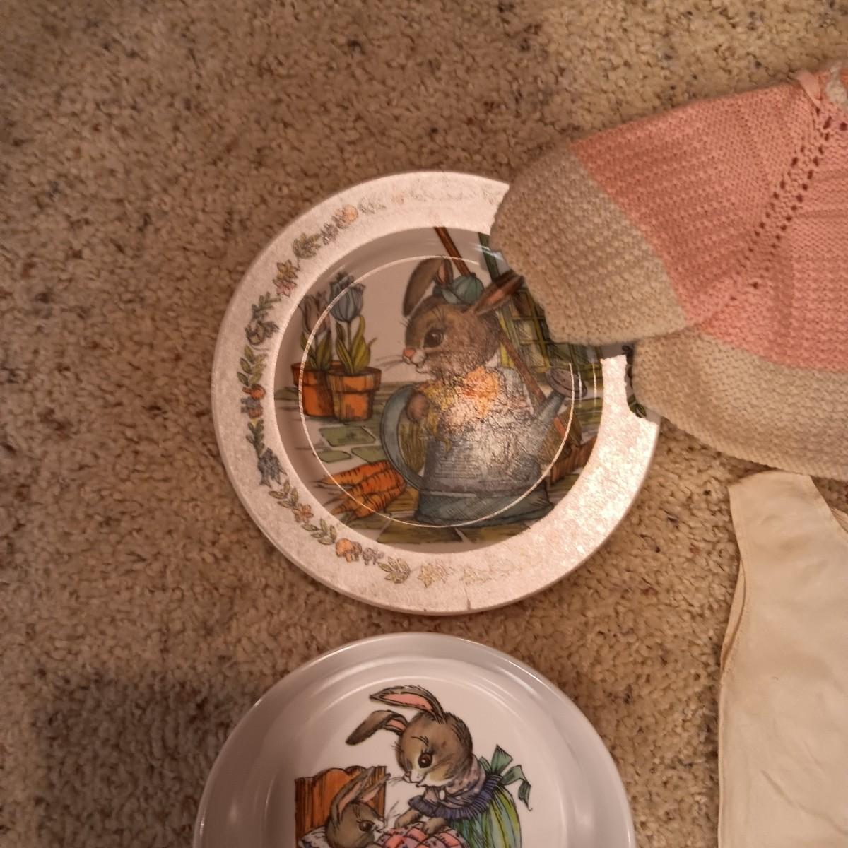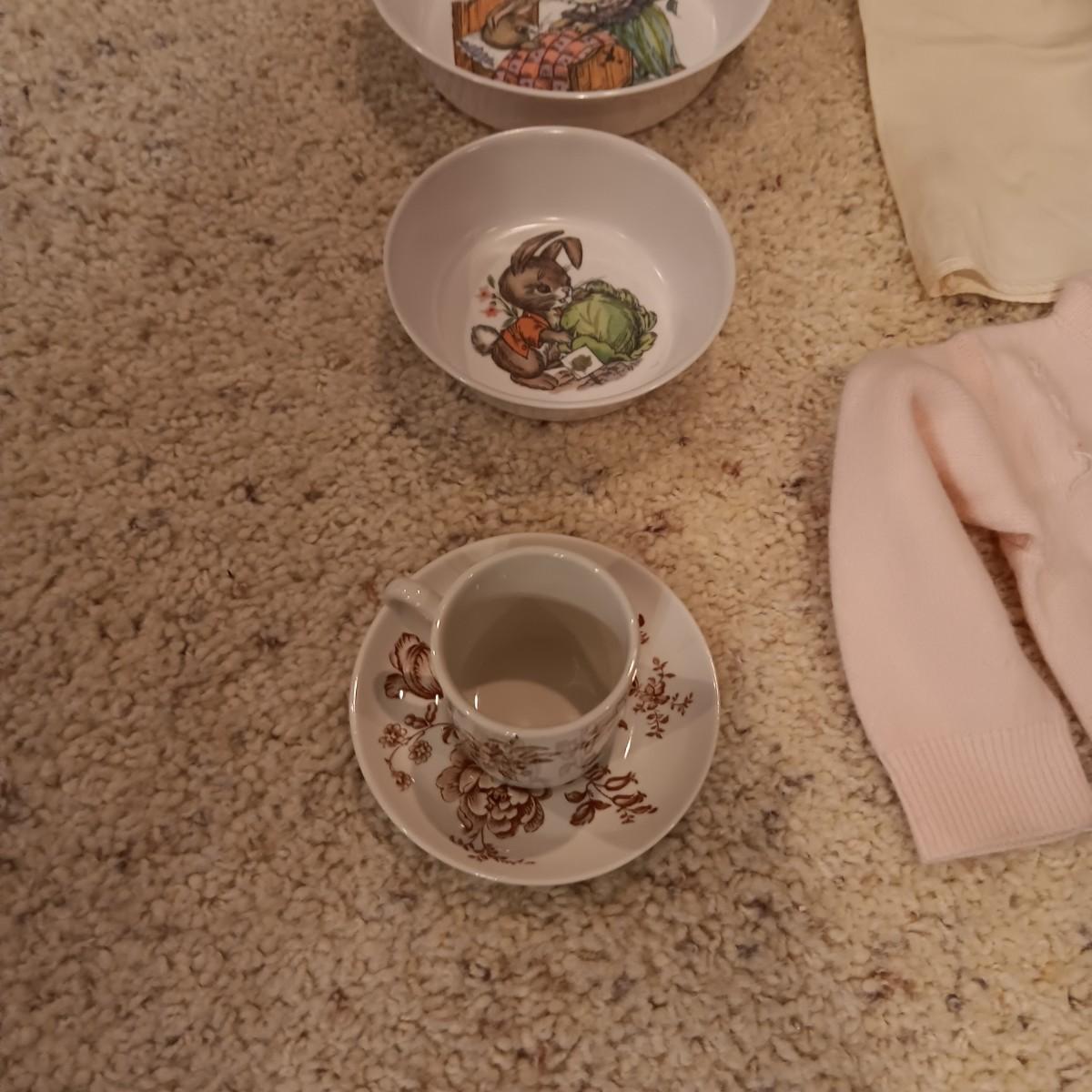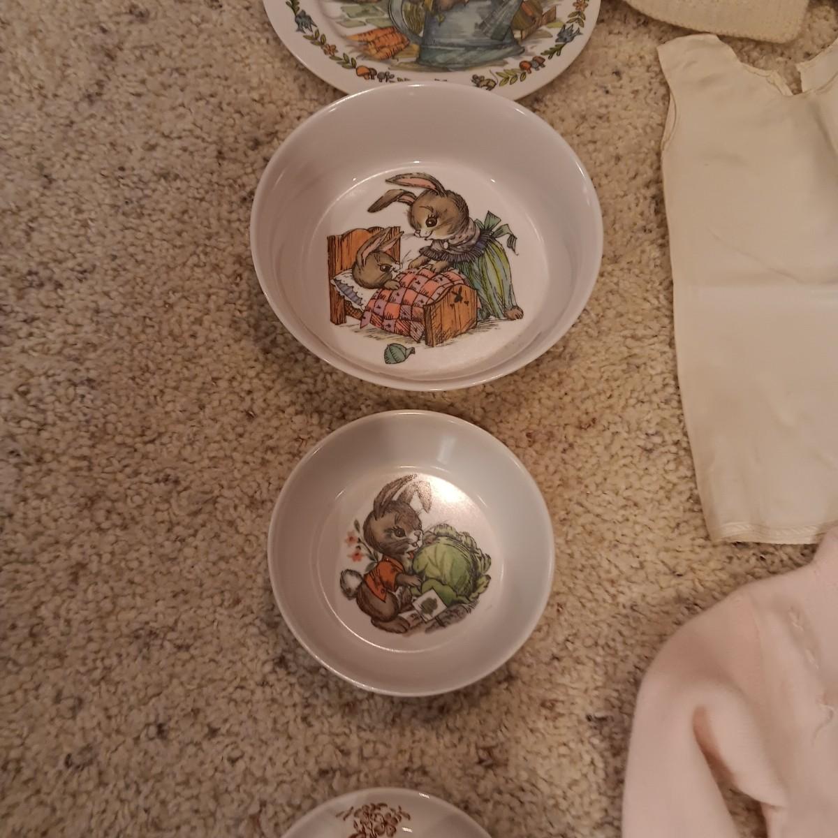 ANTIQUE DOLL DRESS AND OLDER DOLL CLOTHES PLUS RABBIT DISHES