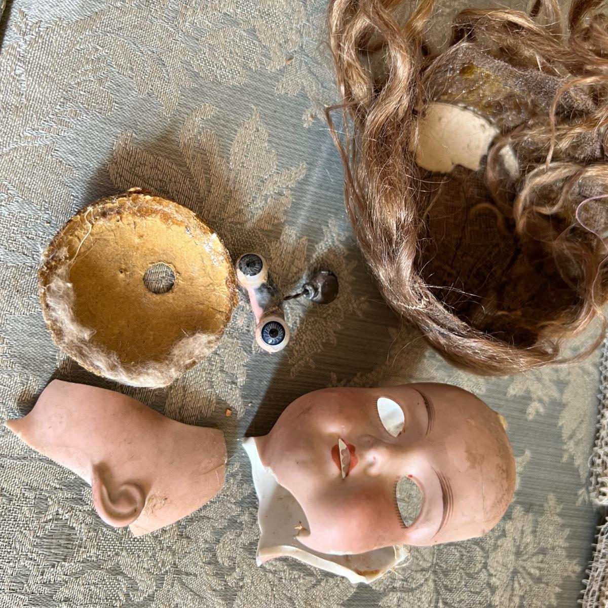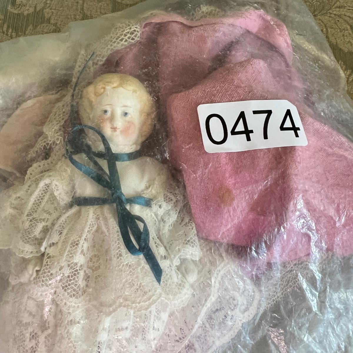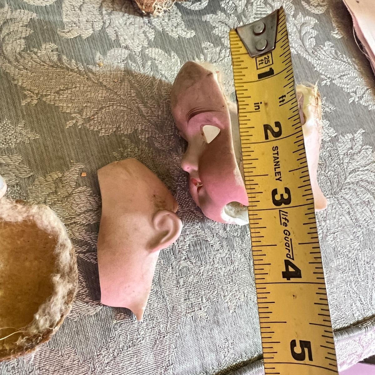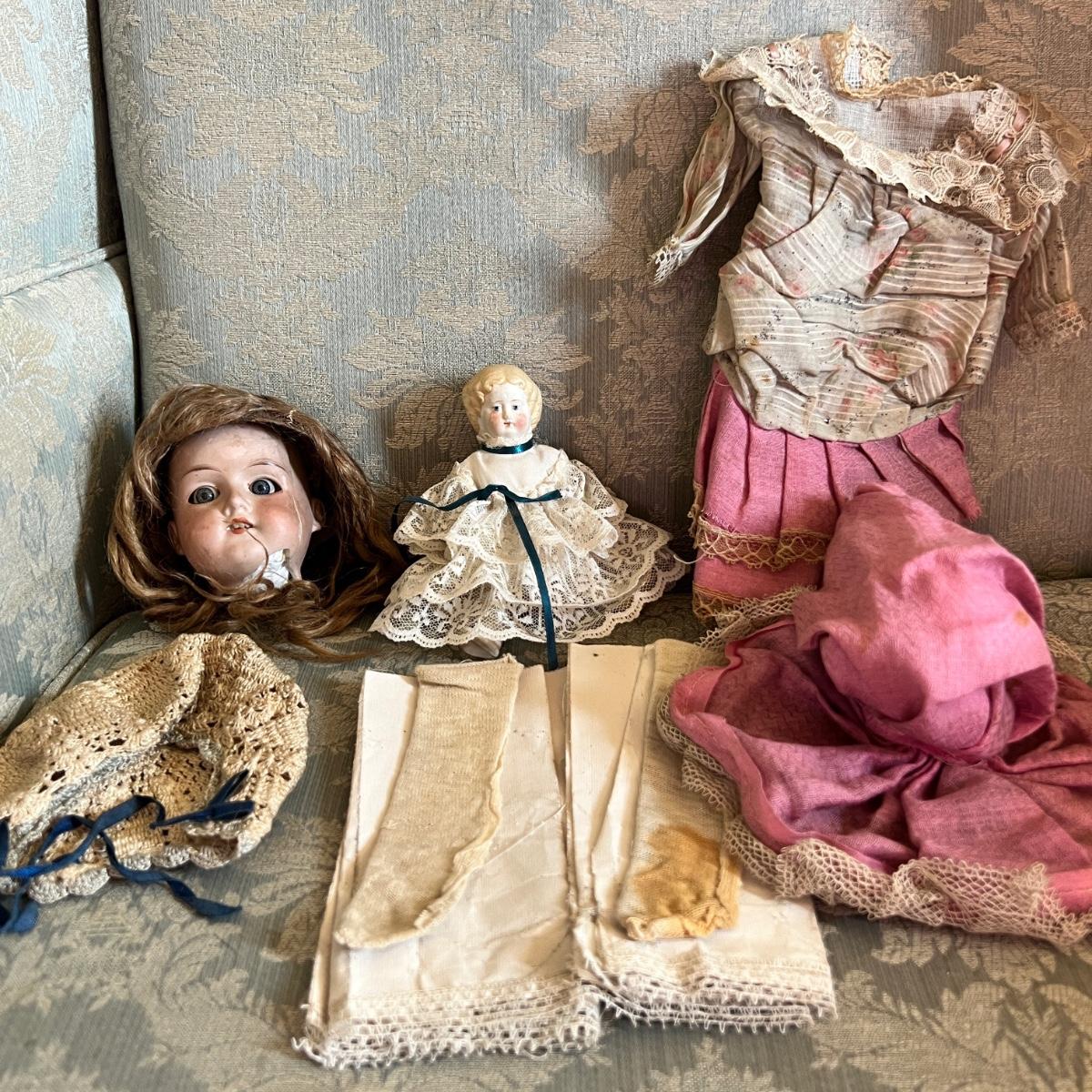 Lot includes one roughly 5" porcelain doll. The larger doll head is broken as shown in pics. Also comes with antique doll clothes. Would be good to use for repair.