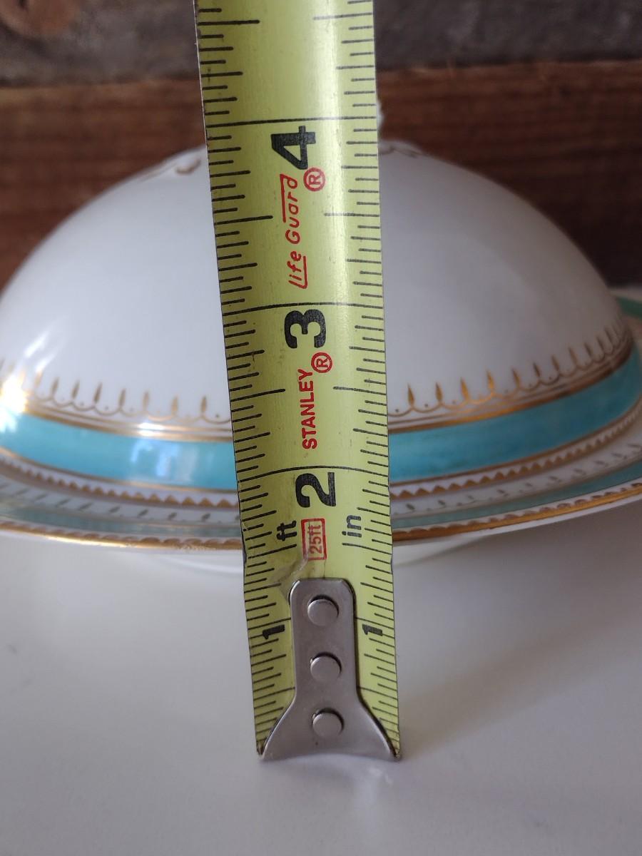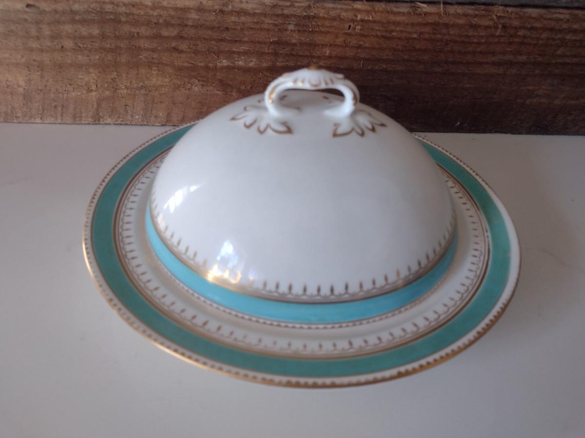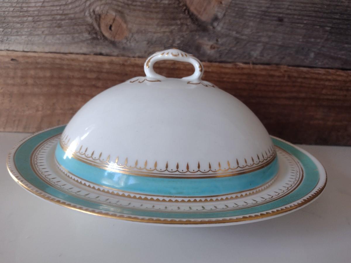 Antique Dome Lid Butter Dish with Gold Trim and Teal Banding