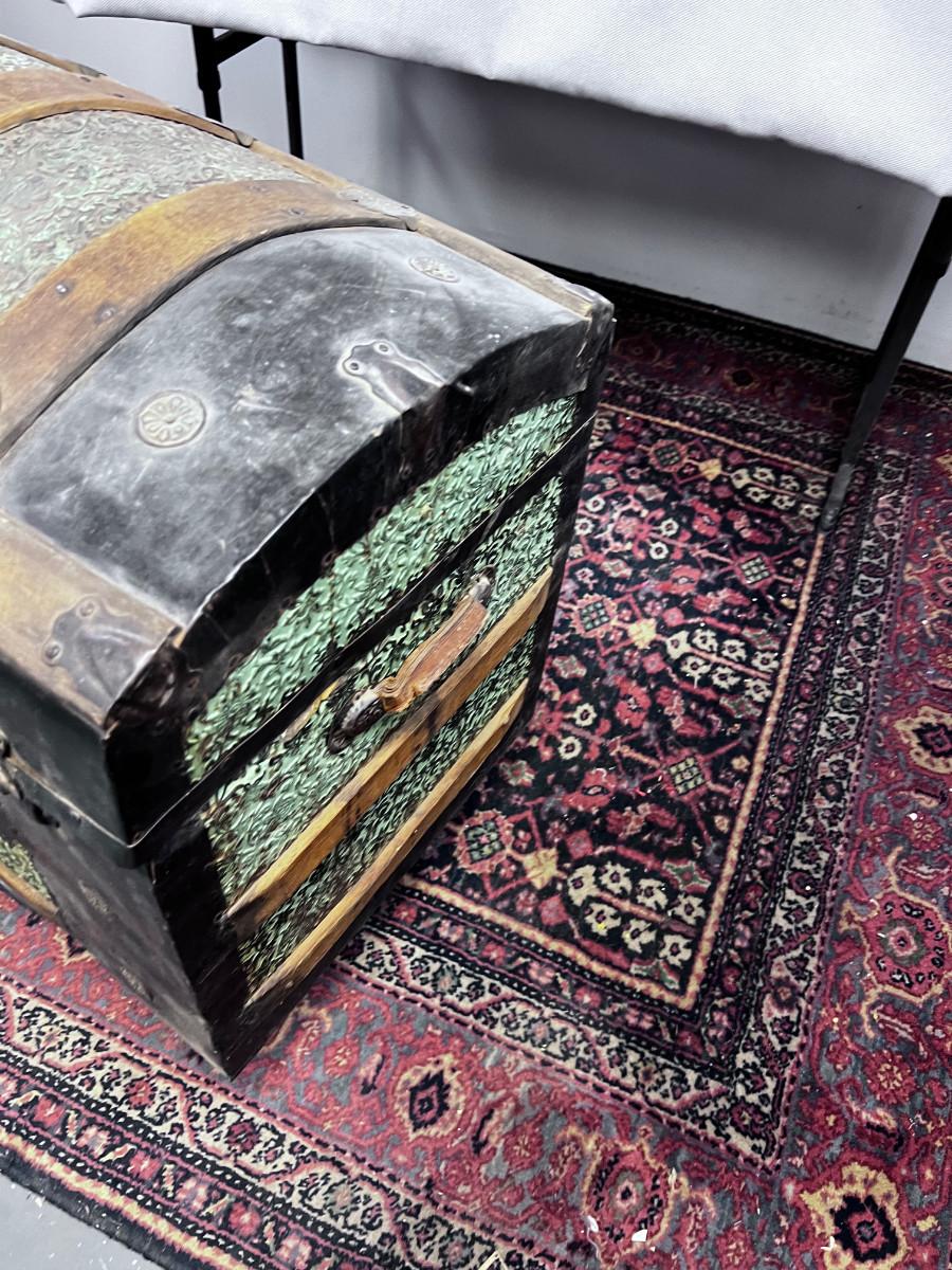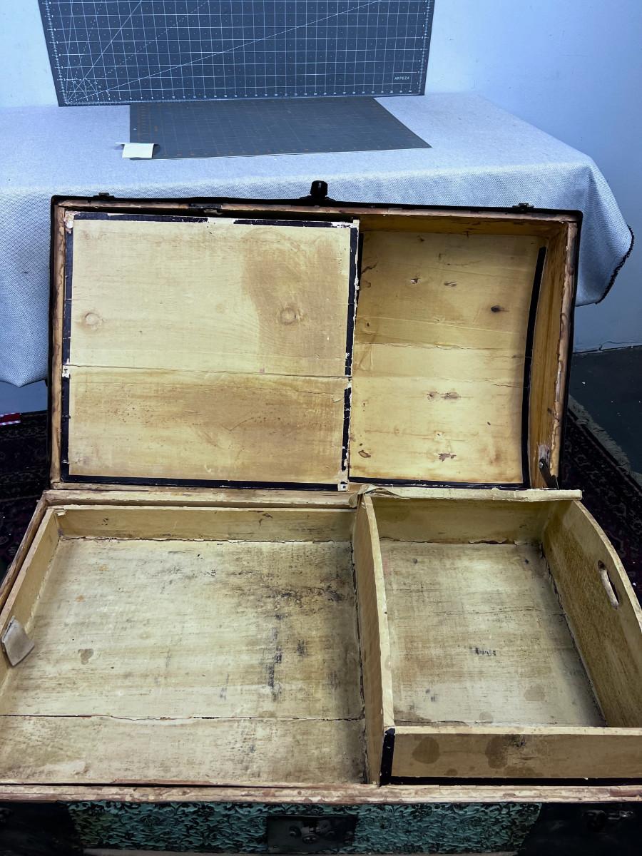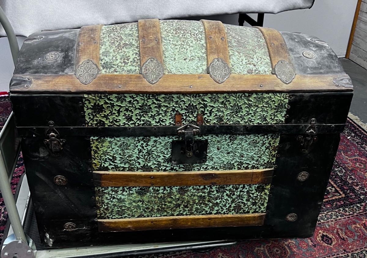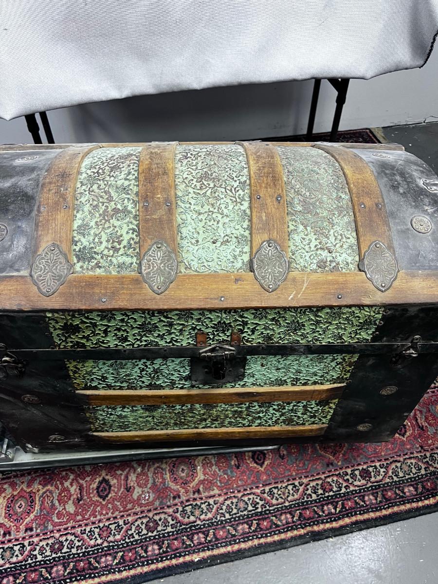 Antique Dome Top Steamer Trunk, Wood Lined with Original Tray Green Embossed