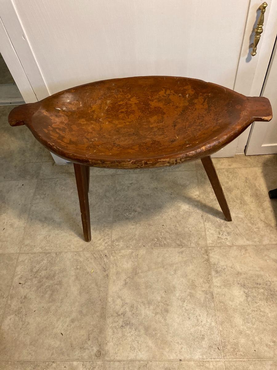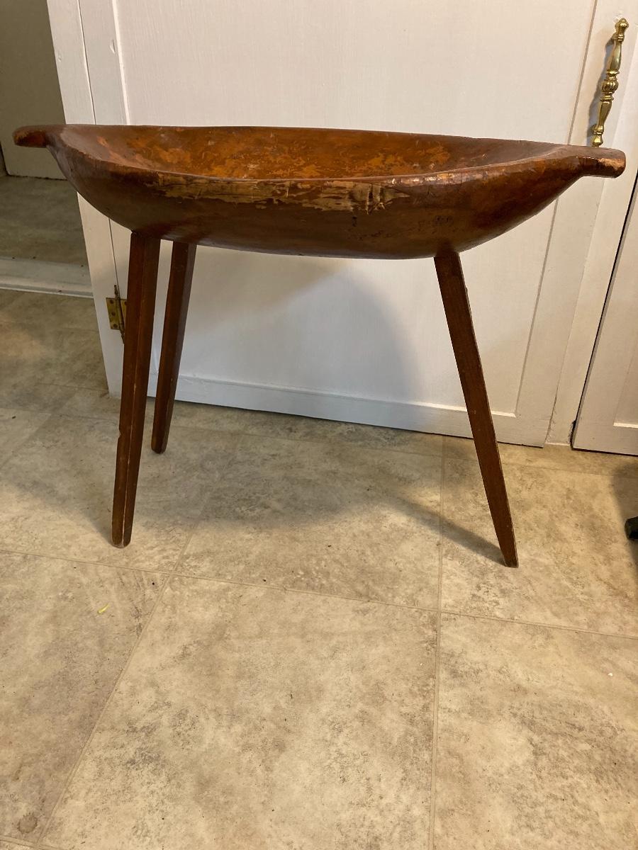 Antique Dough Bowl on 3 legs. Very unique to have legs. 23”H x 25”L x 12”W. Good condition with some wear.