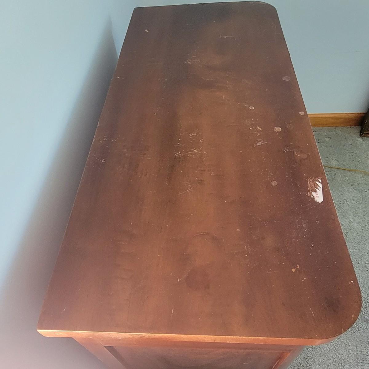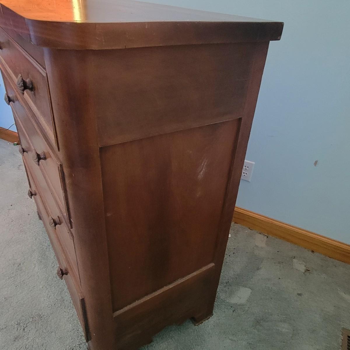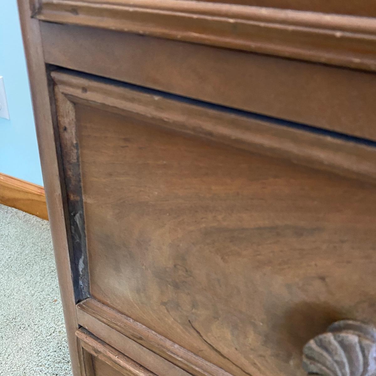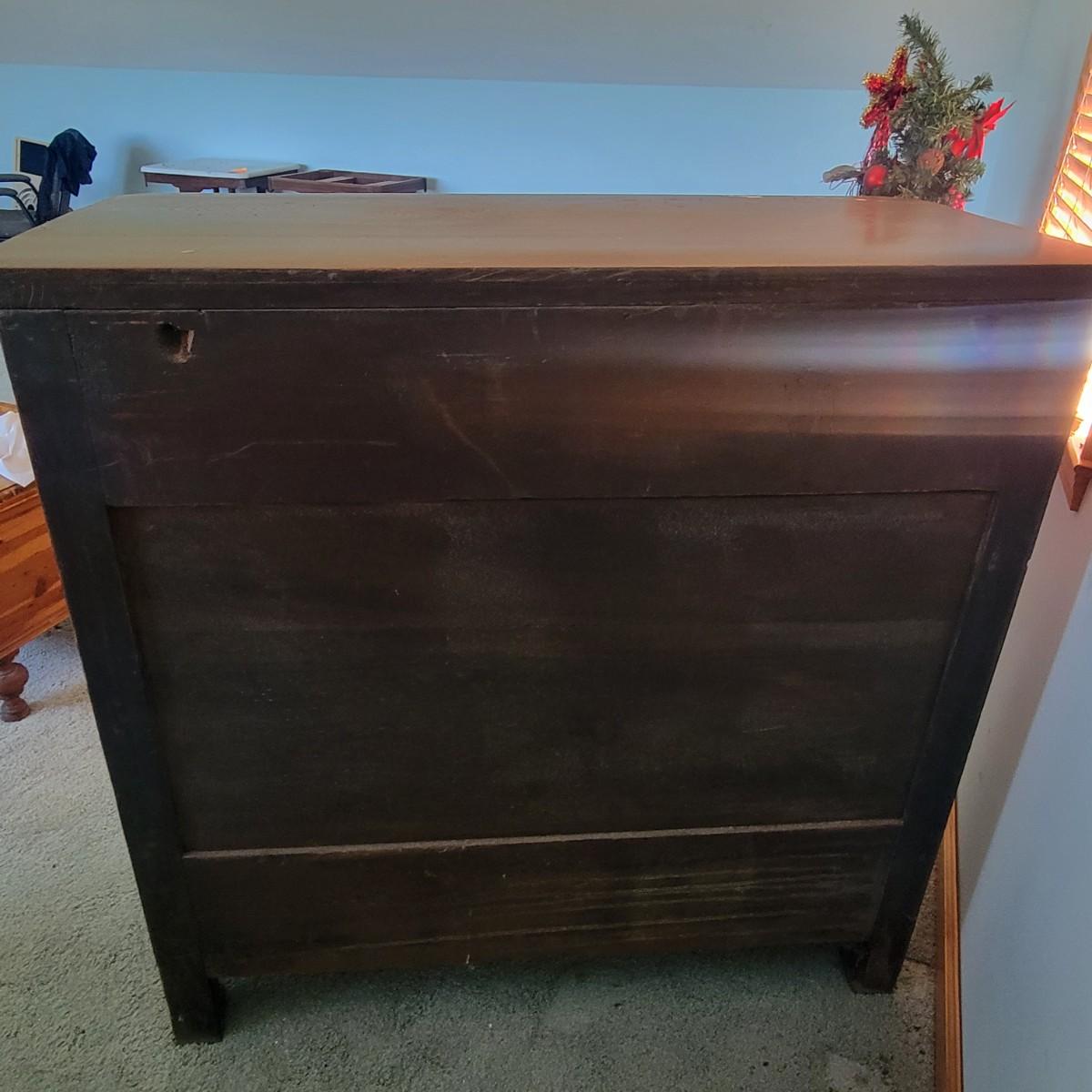 Solid wood dresser with dovetail drawers. Drawers slide in and out easily and have wooden knobs with nice detail. Several knobs have small chips, see photos. Overall good condition, but you may want to refinish the top. All drawers have keyholes, but there is no key. Trim on drawers has some wear and tear, and one drawer is missing a piece of trim. 43" x 19.5" x 42"