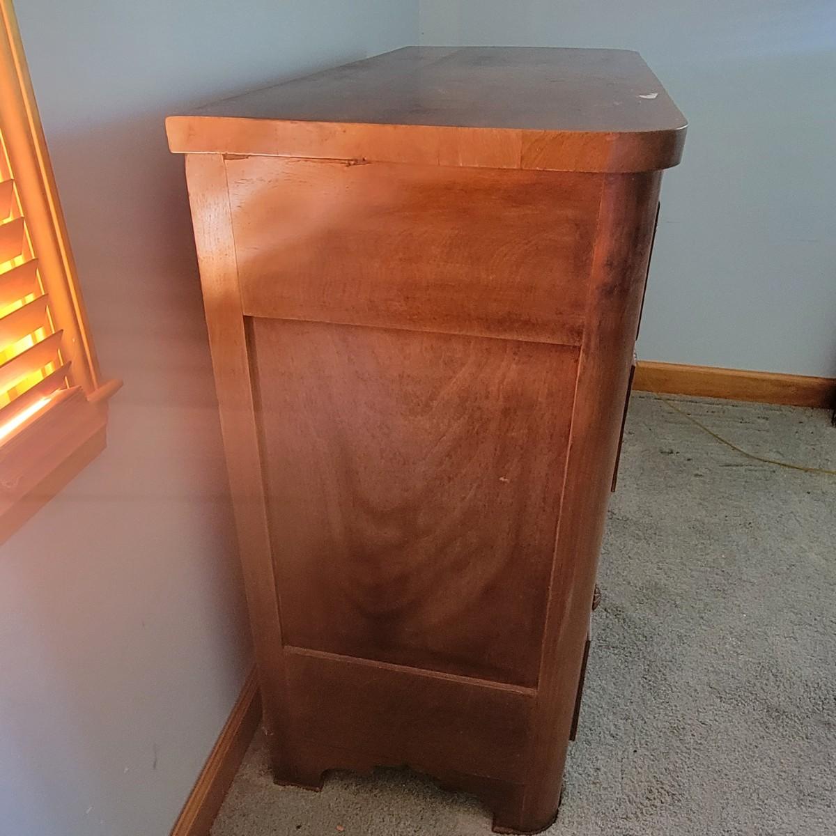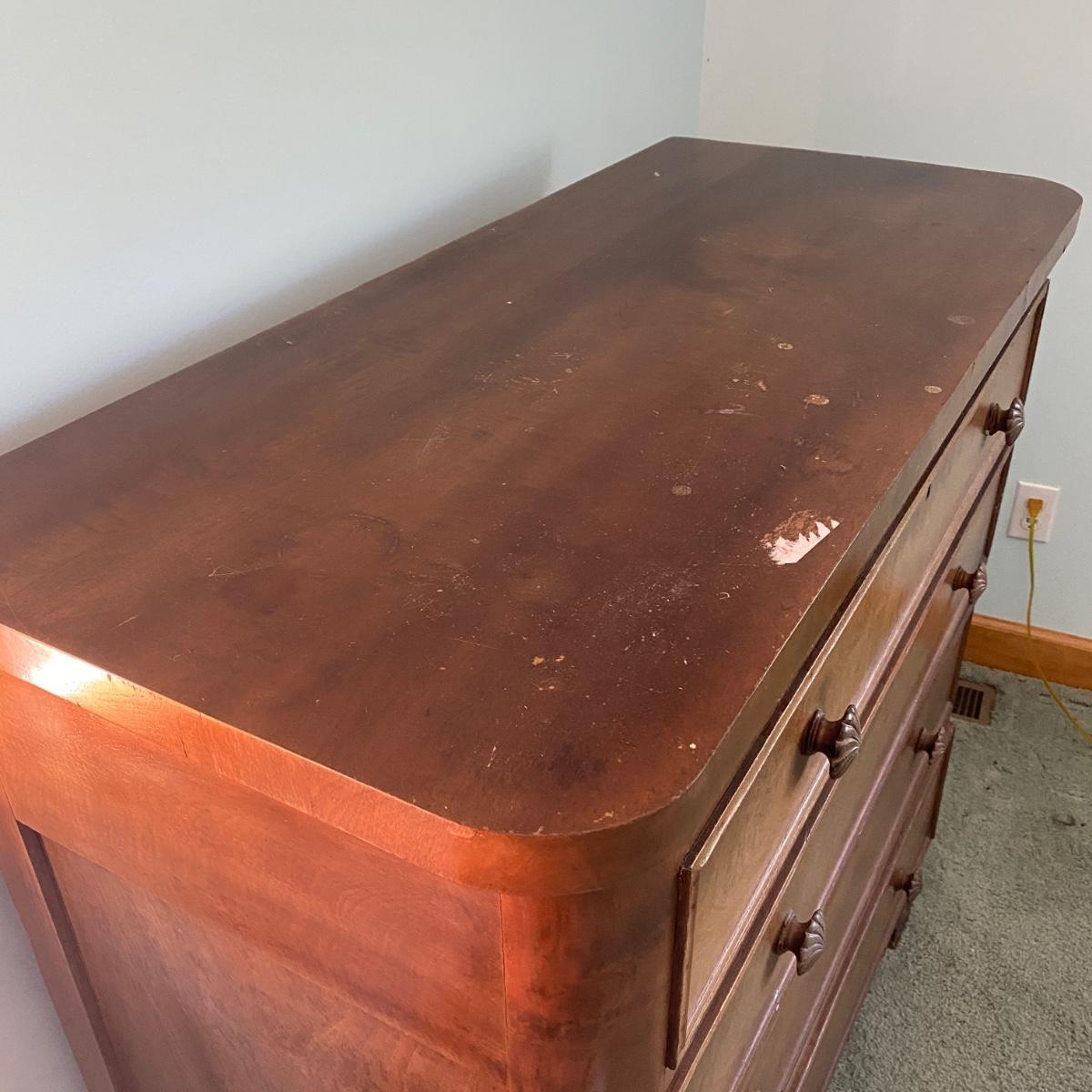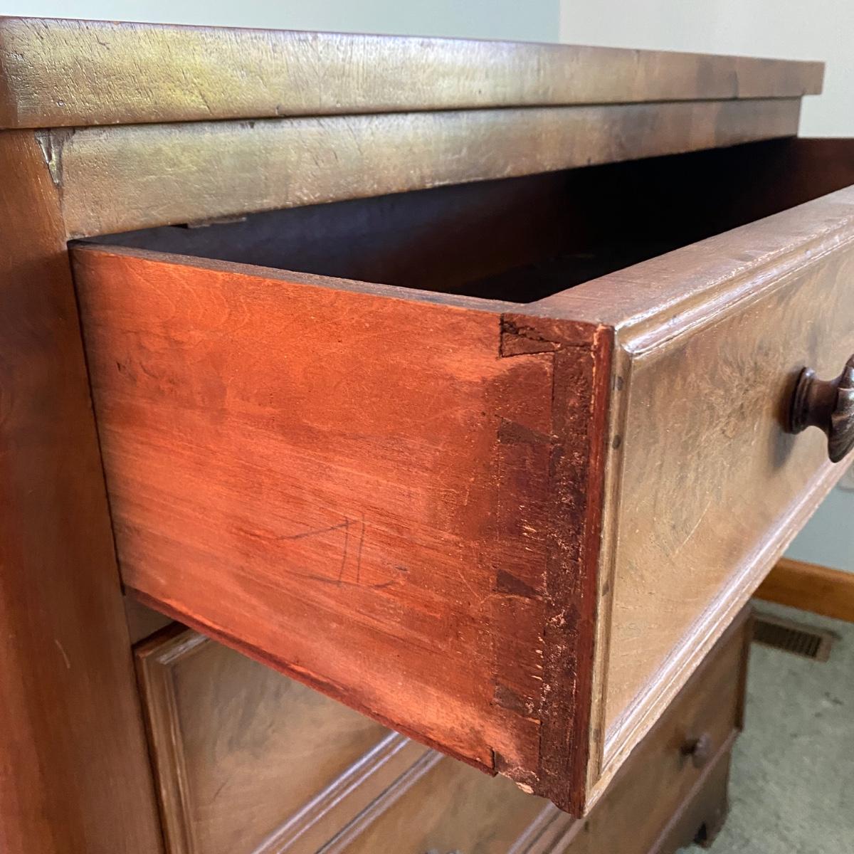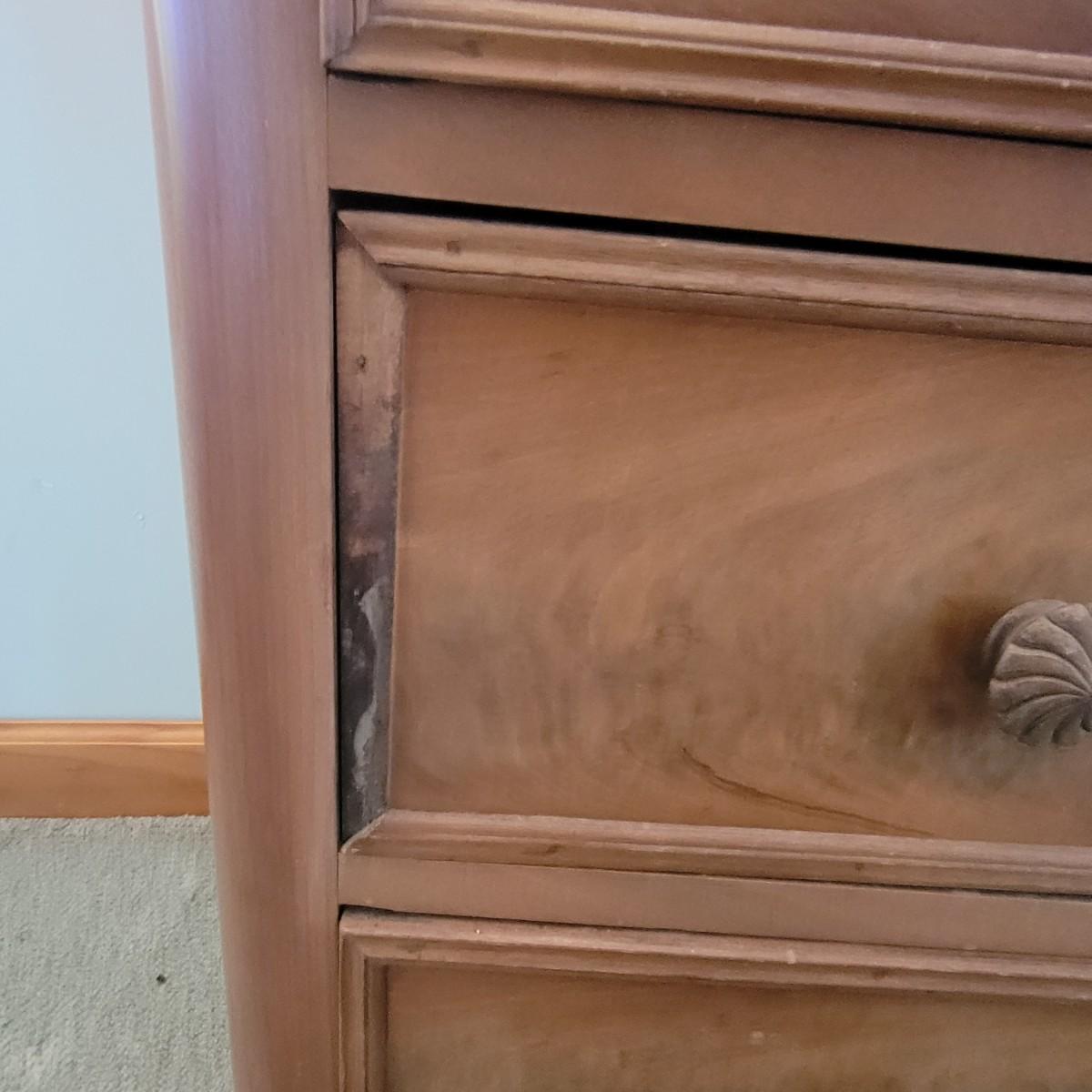 Solid wood dresser with dovetail drawers. Drawers slide in and out easily and have wooden knobs with nice detail. Several knobs have small chips, see photos. Overall good condition, but you may want to refinish the top. All drawers have keyholes, but there is no key. Trim on drawers has some wear and tear, and one drawer is missing a piece of trim. 43" x 19.5" x 42"