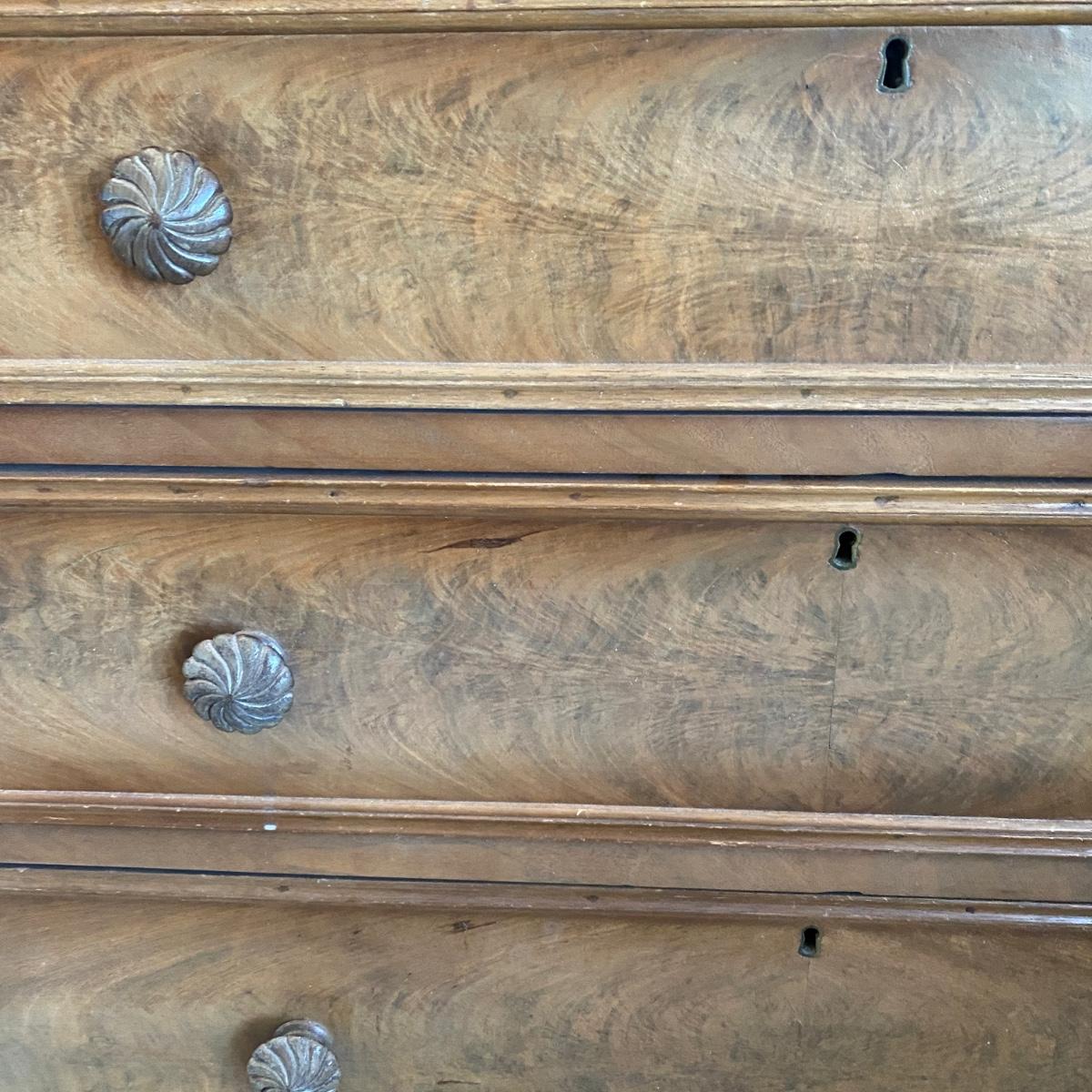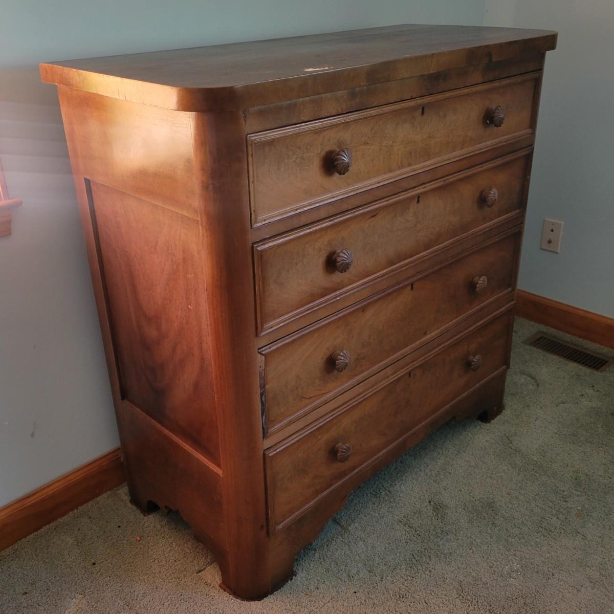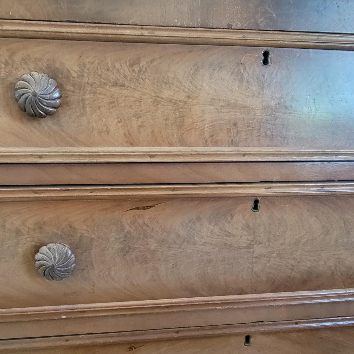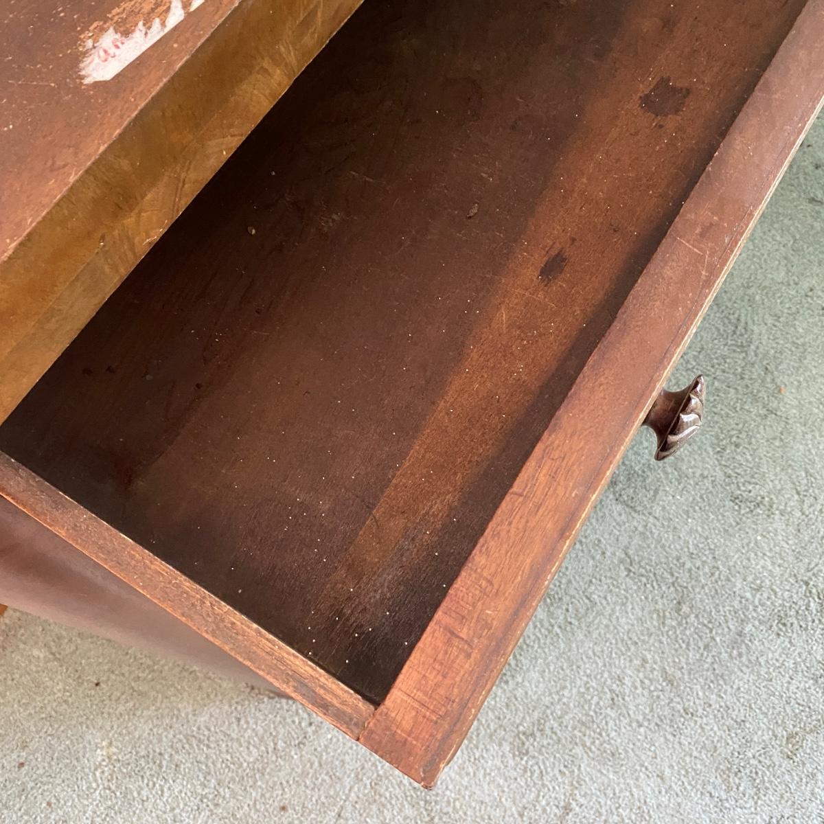Solid wood dresser with dovetail drawers. Drawers slide in and out easily and have wooden knobs with nice detail. Several knobs have small chips, see photos. Overall good condition, but you may want to refinish the top. All drawers have keyholes, but there is no key. Trim on drawers has some wear and tear, and one drawer is missing a piece of trim. 43" x 19.5" x 42"