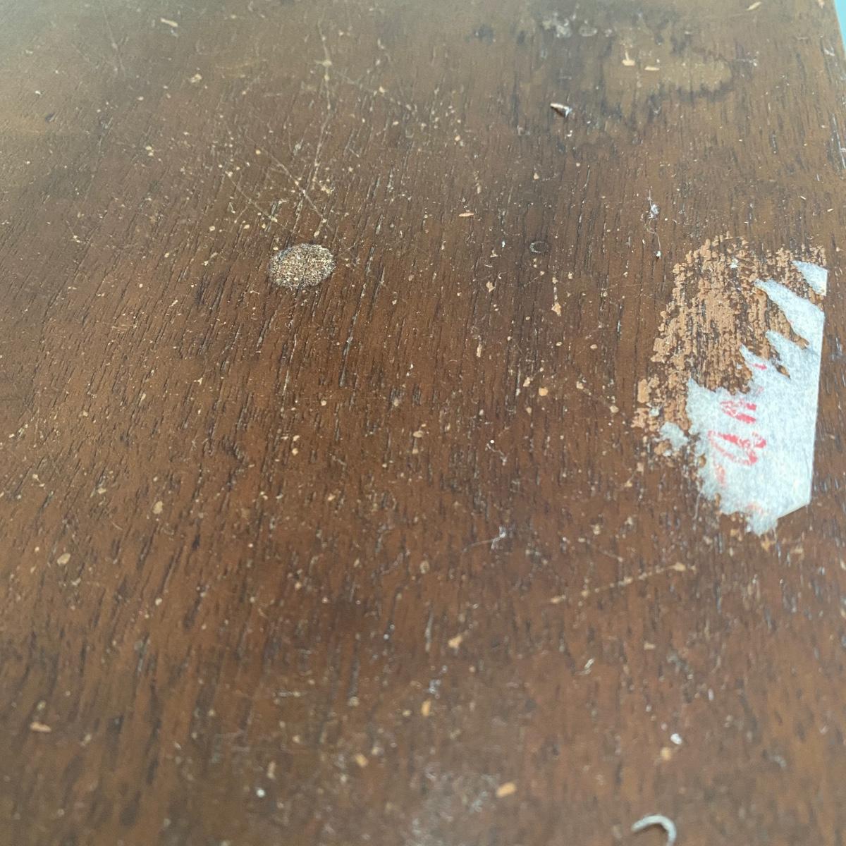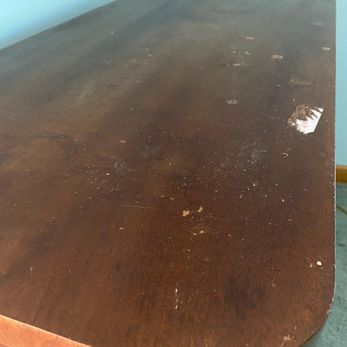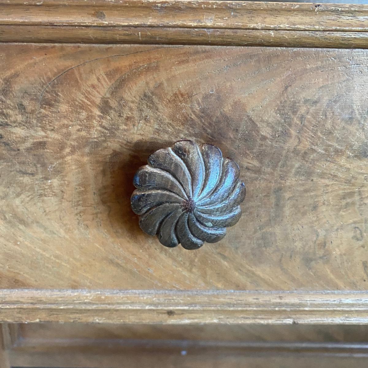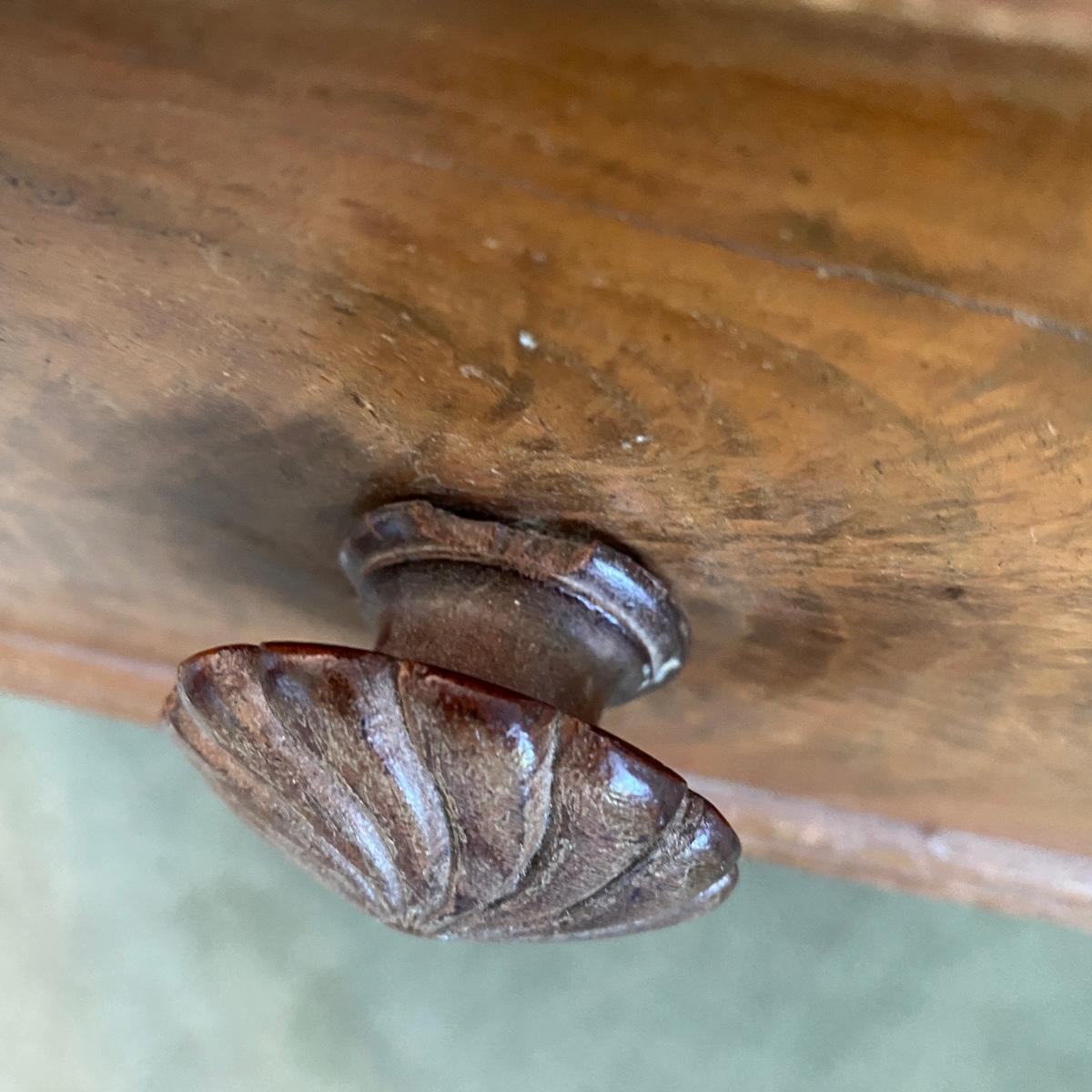 Solid wood dresser with dovetail drawers. Drawers slide in and out easily and have wooden knobs with nice detail. Several knobs have small chips, see photos. Overall good condition, but you may want to refinish the top. All drawers have keyholes, but there is no key. Trim on drawers has some wear and tear, and one drawer is missing a piece of trim. 43" x 19.5" x 42"