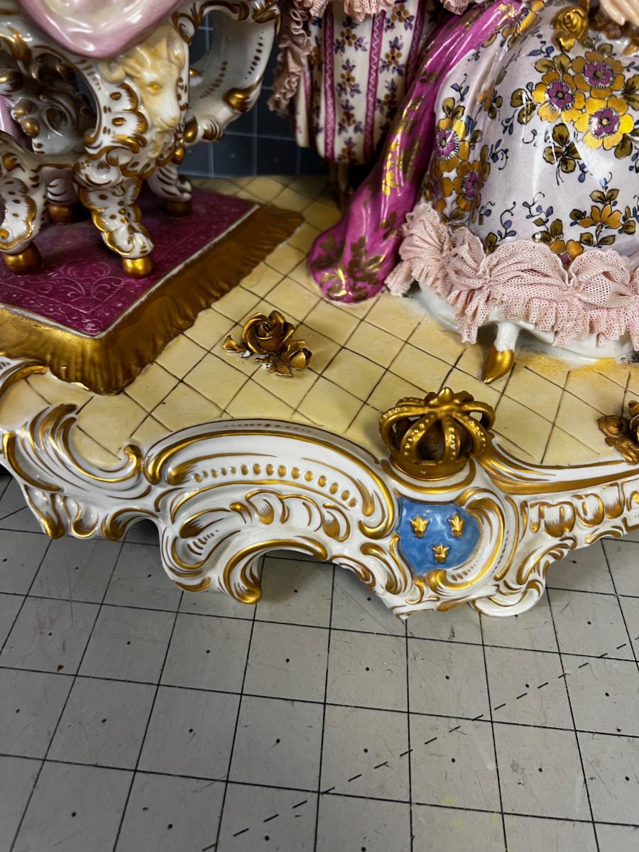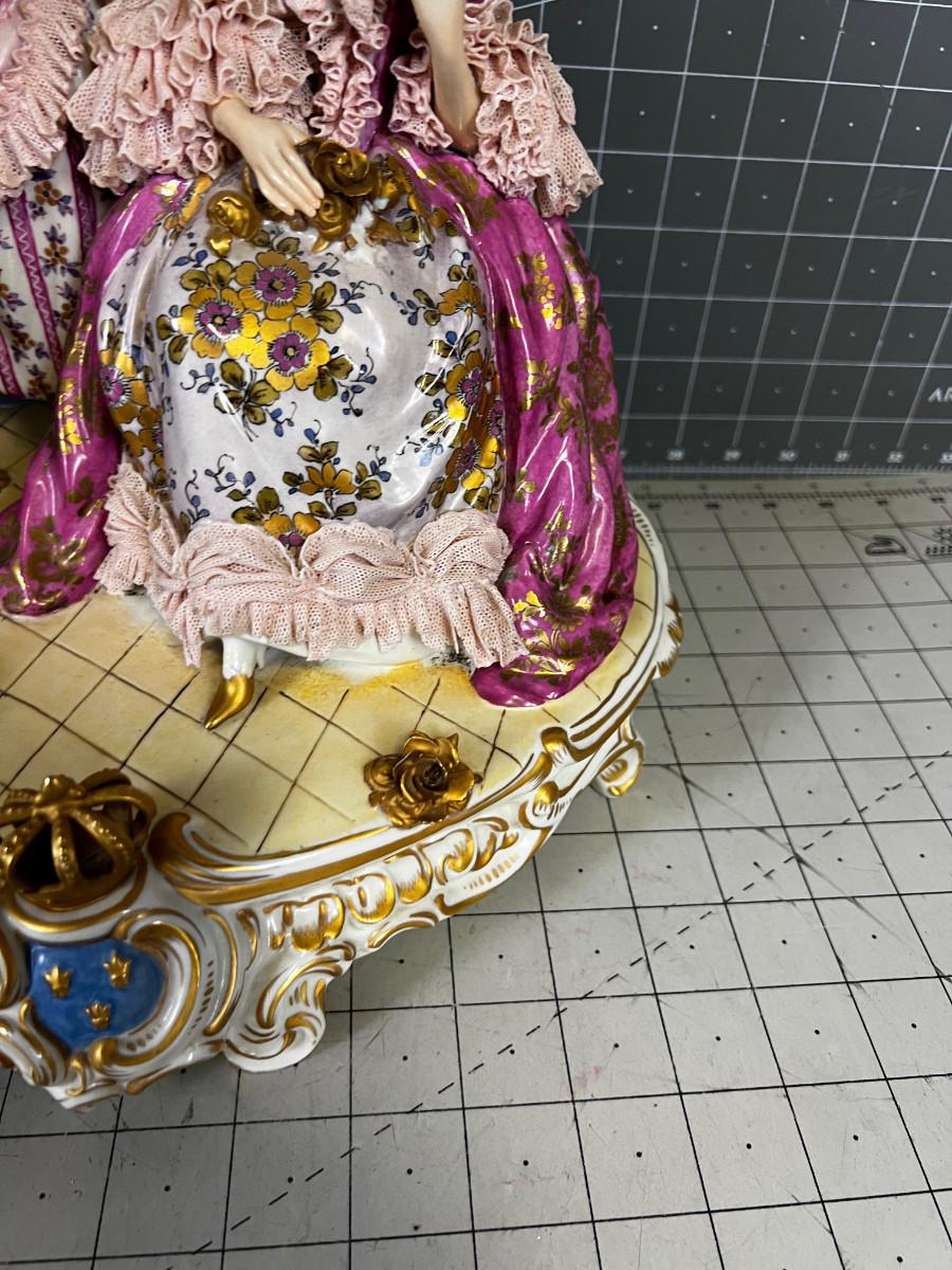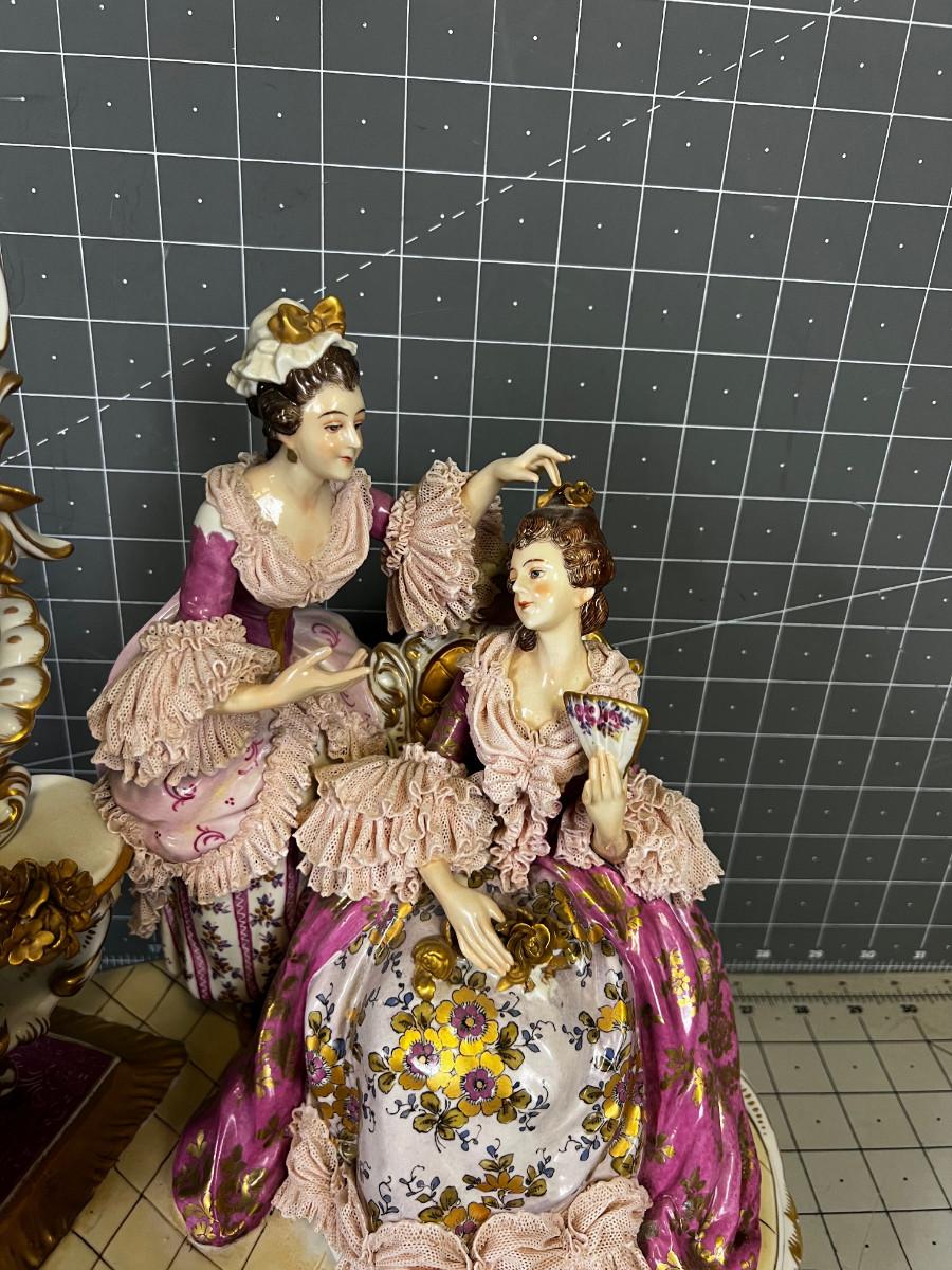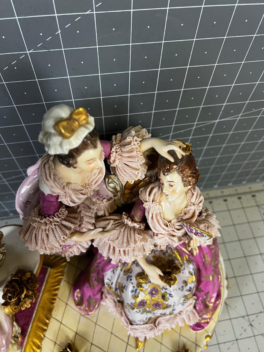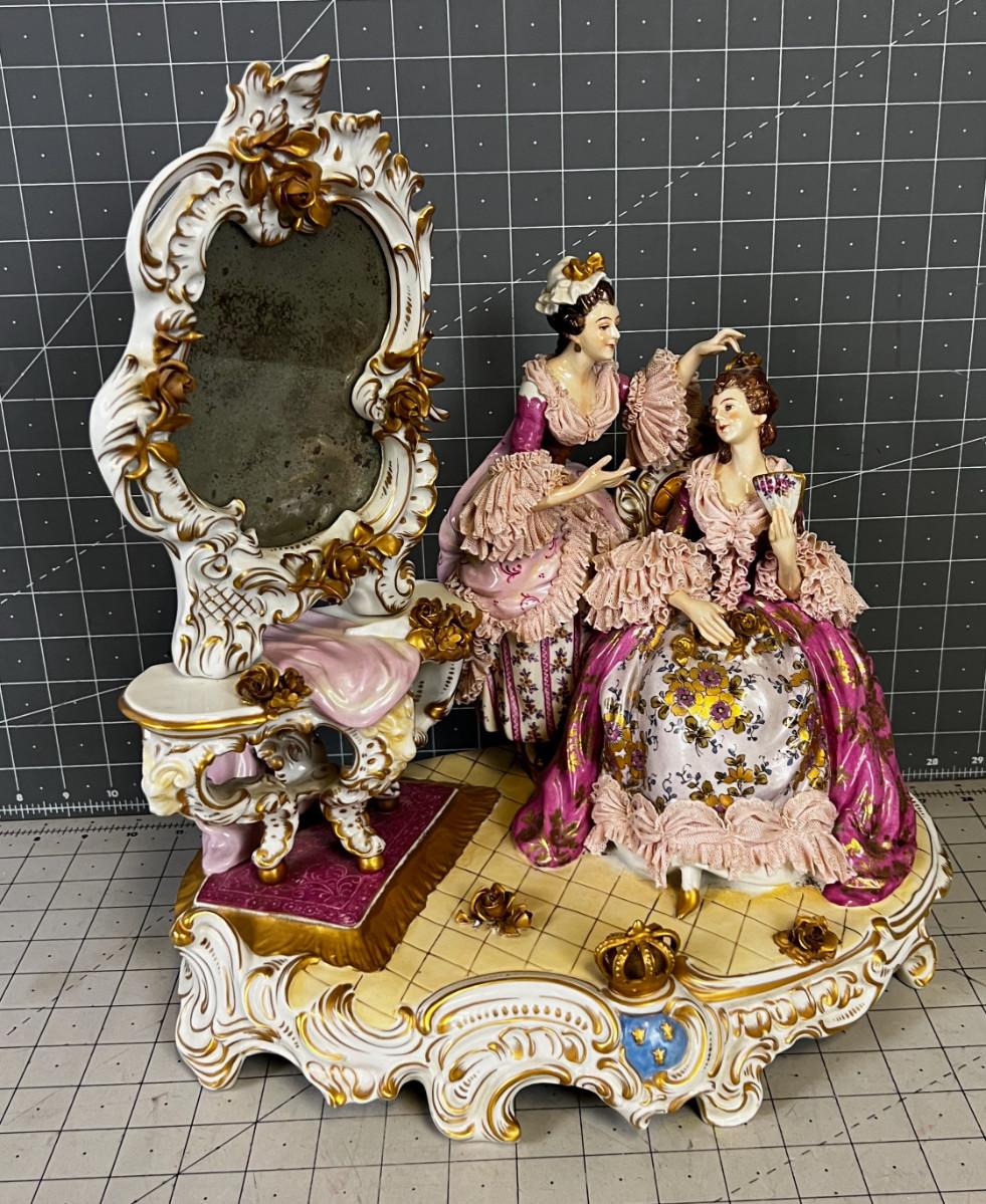 Silver on the Mirror show age. Measures 14 X 16" Tall Good Condition. Has some Damage around the skirt edges. We will ship but it will cost at least $75 to wrap and box plus shipping.
