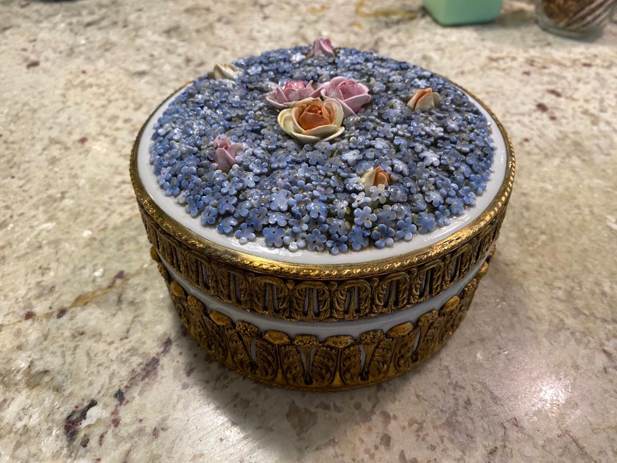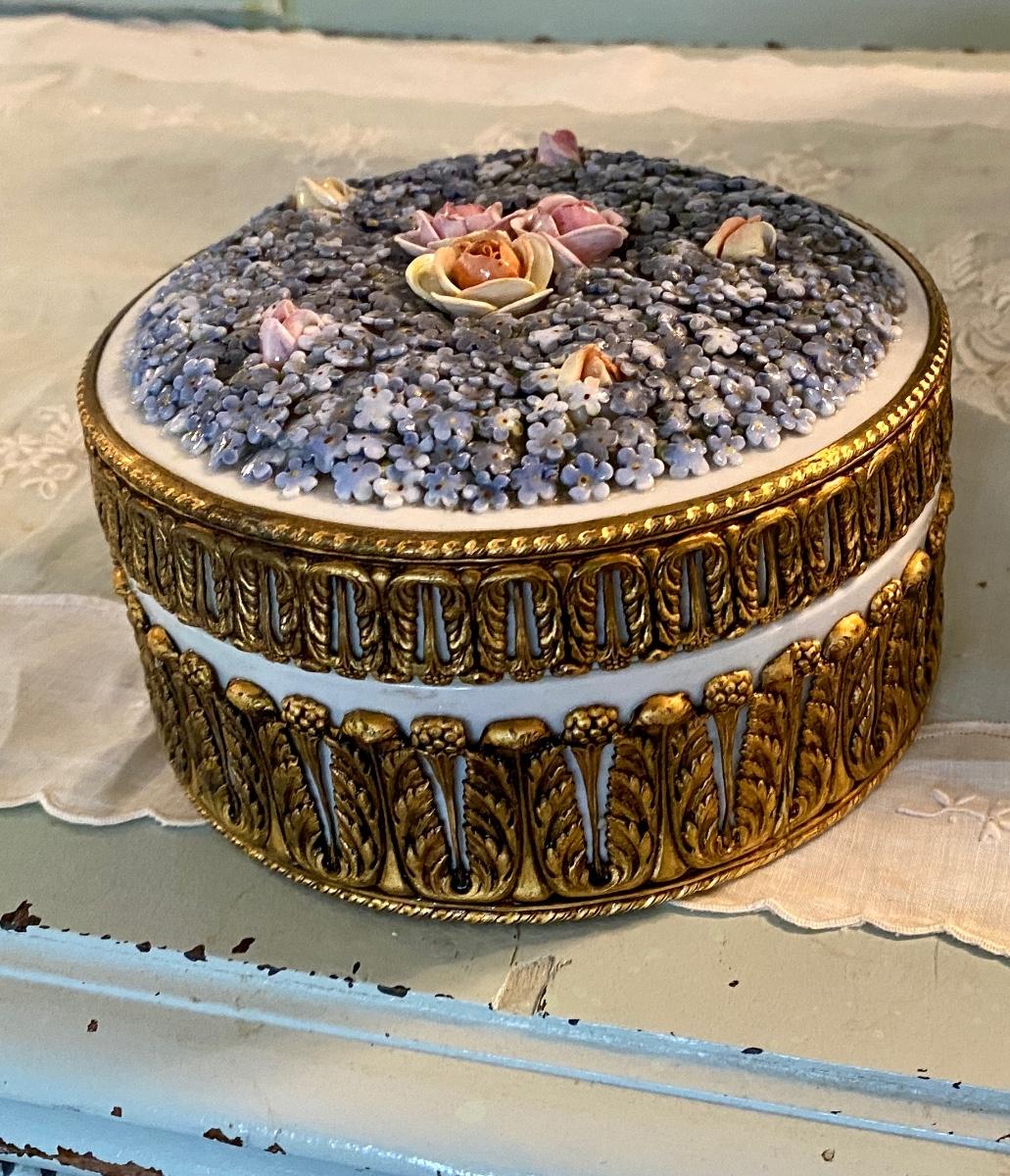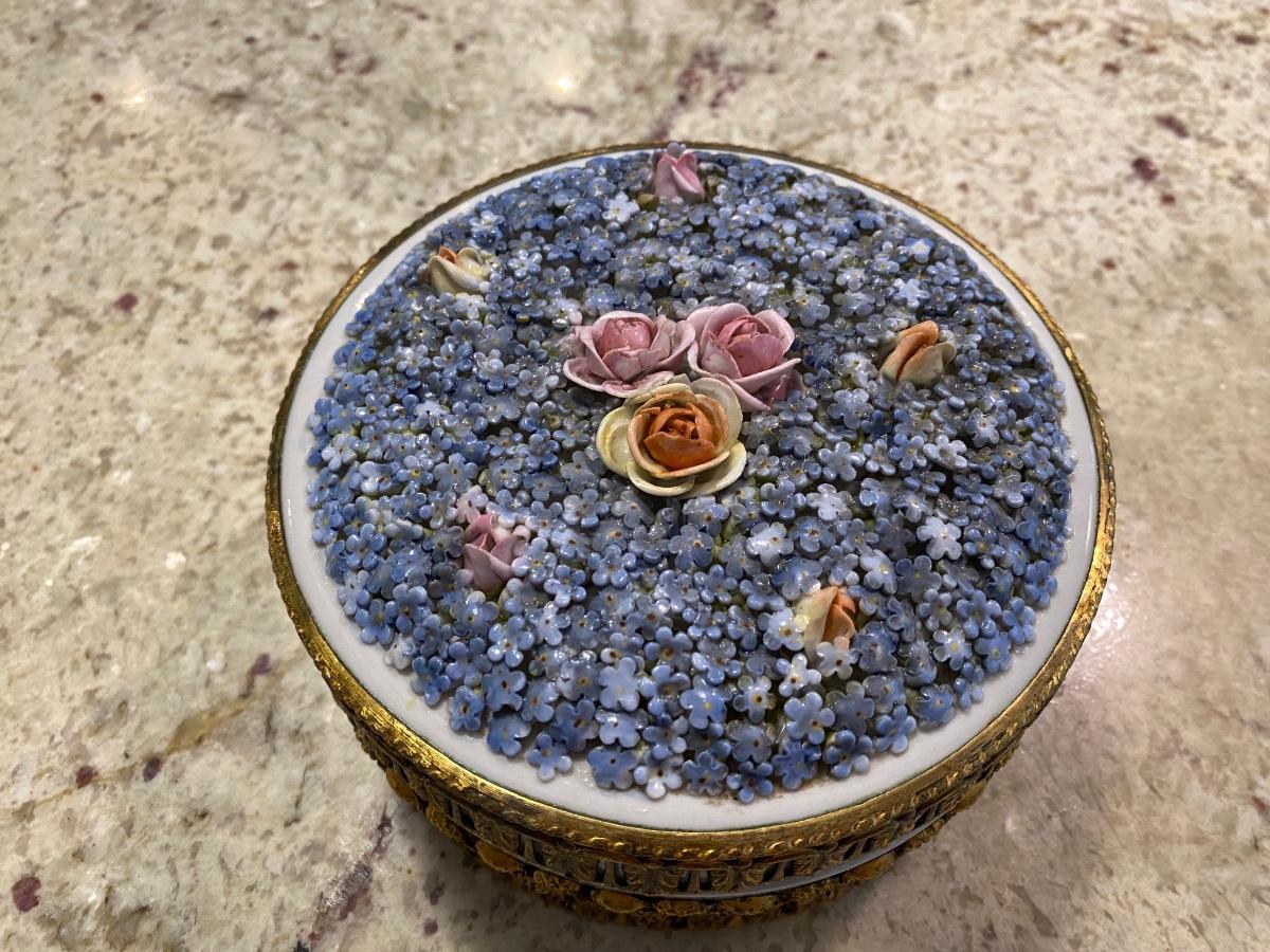 This gorgeous Elfin Ware ormolu jar has bed of tiny blue porcelain flowers with roses peeking through the meadow. Inside the jar is a sweet bouquet of lavender, yellow, pink, red, and blue flowers. The jar measures with the lid on with a diameter of 6" and weighs 3 pounds. Germany is embossed in ormolu and number 10 on top and bottom. .