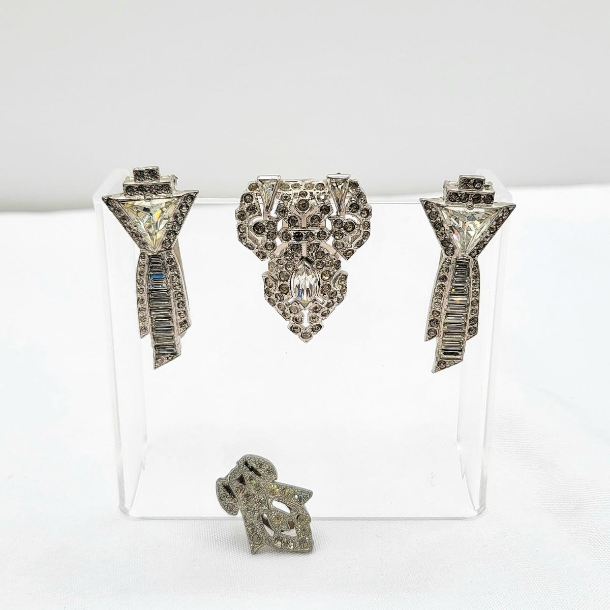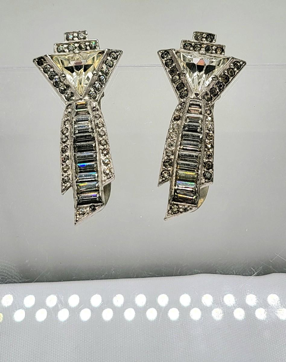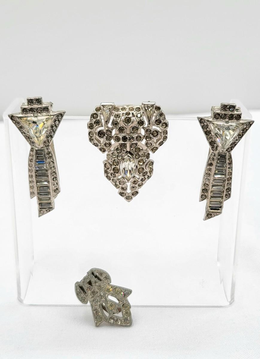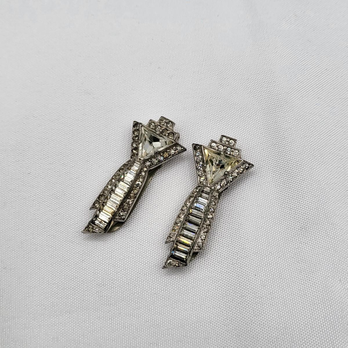 Gorgeous deco pair of 1.75" long dress clips with triangle, round and baguette rhinestones. Single smaller clip with clear rhinestones.