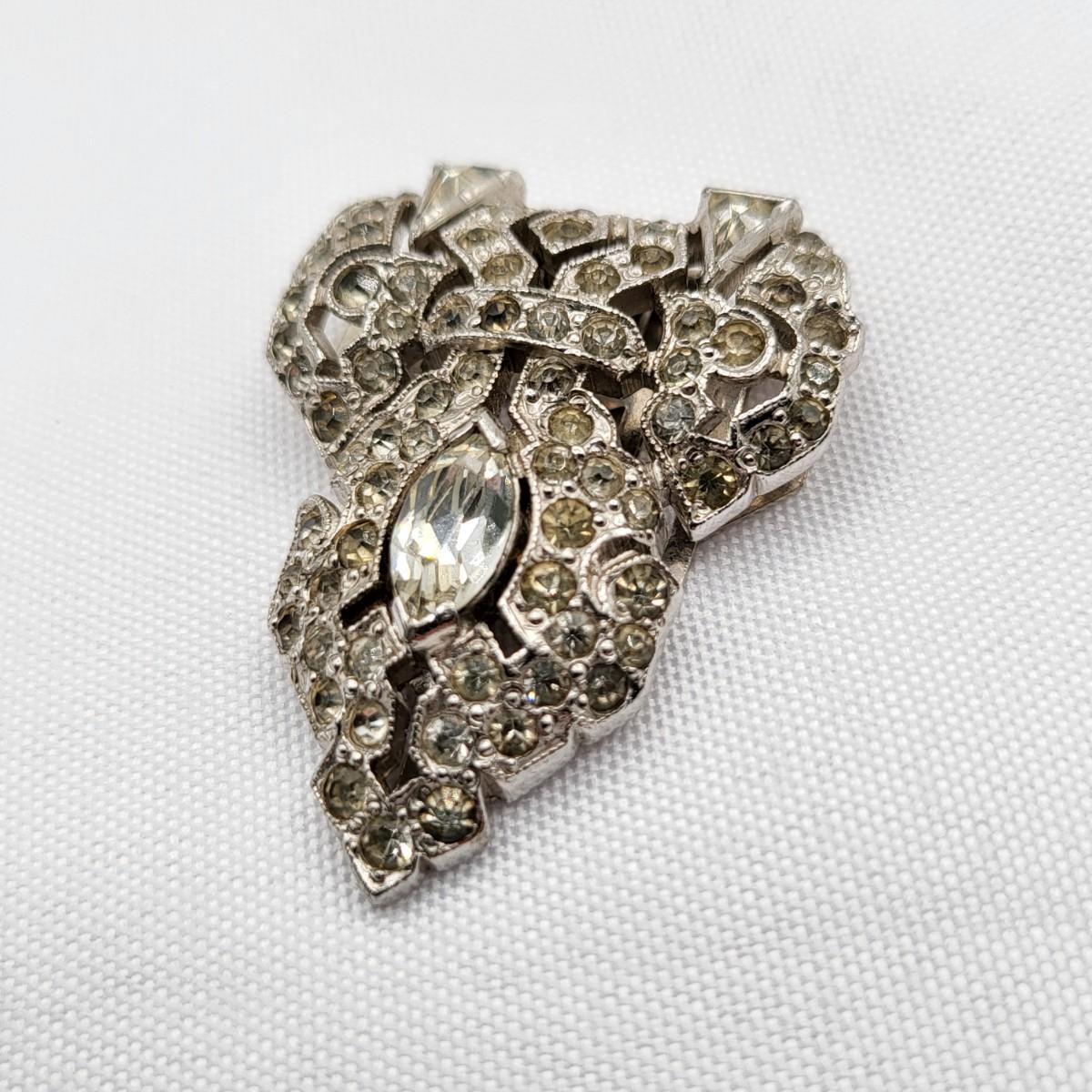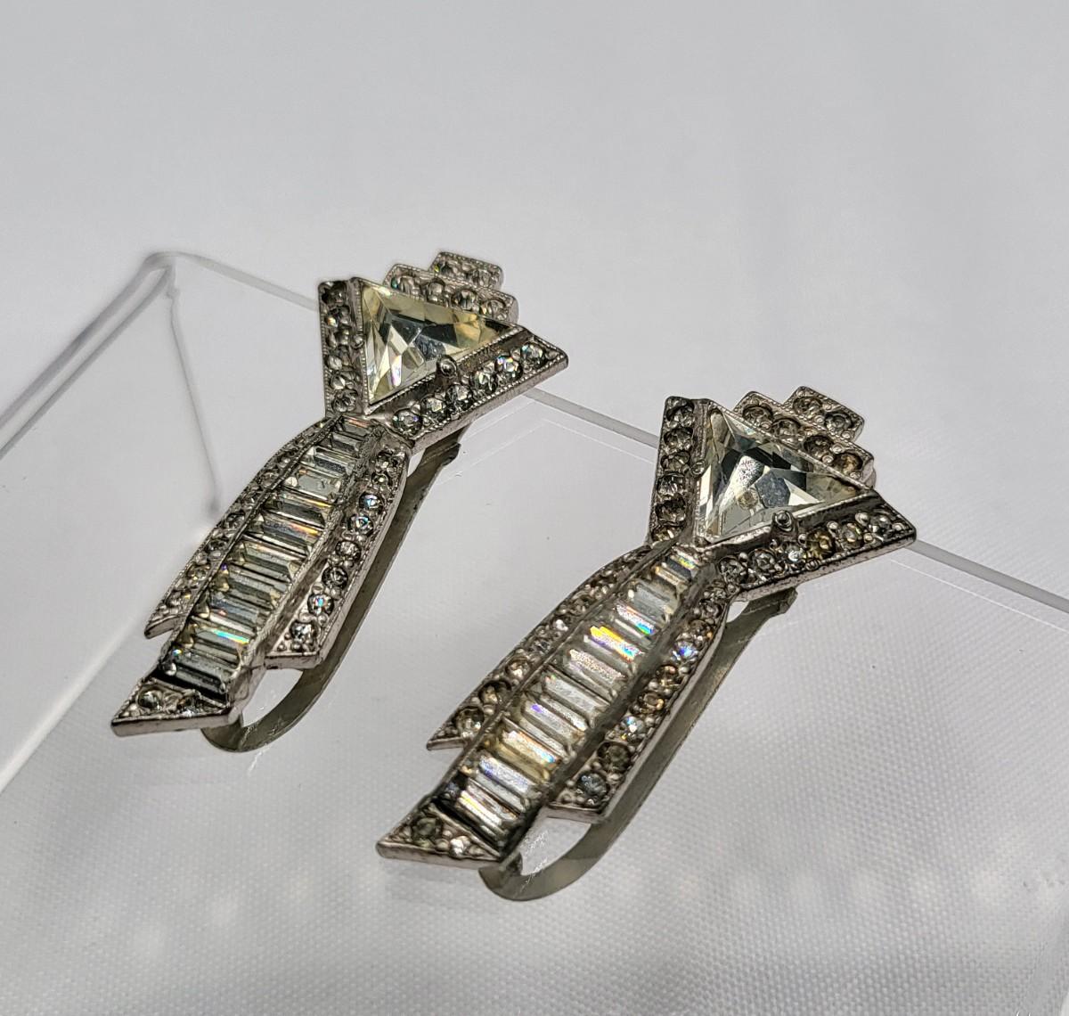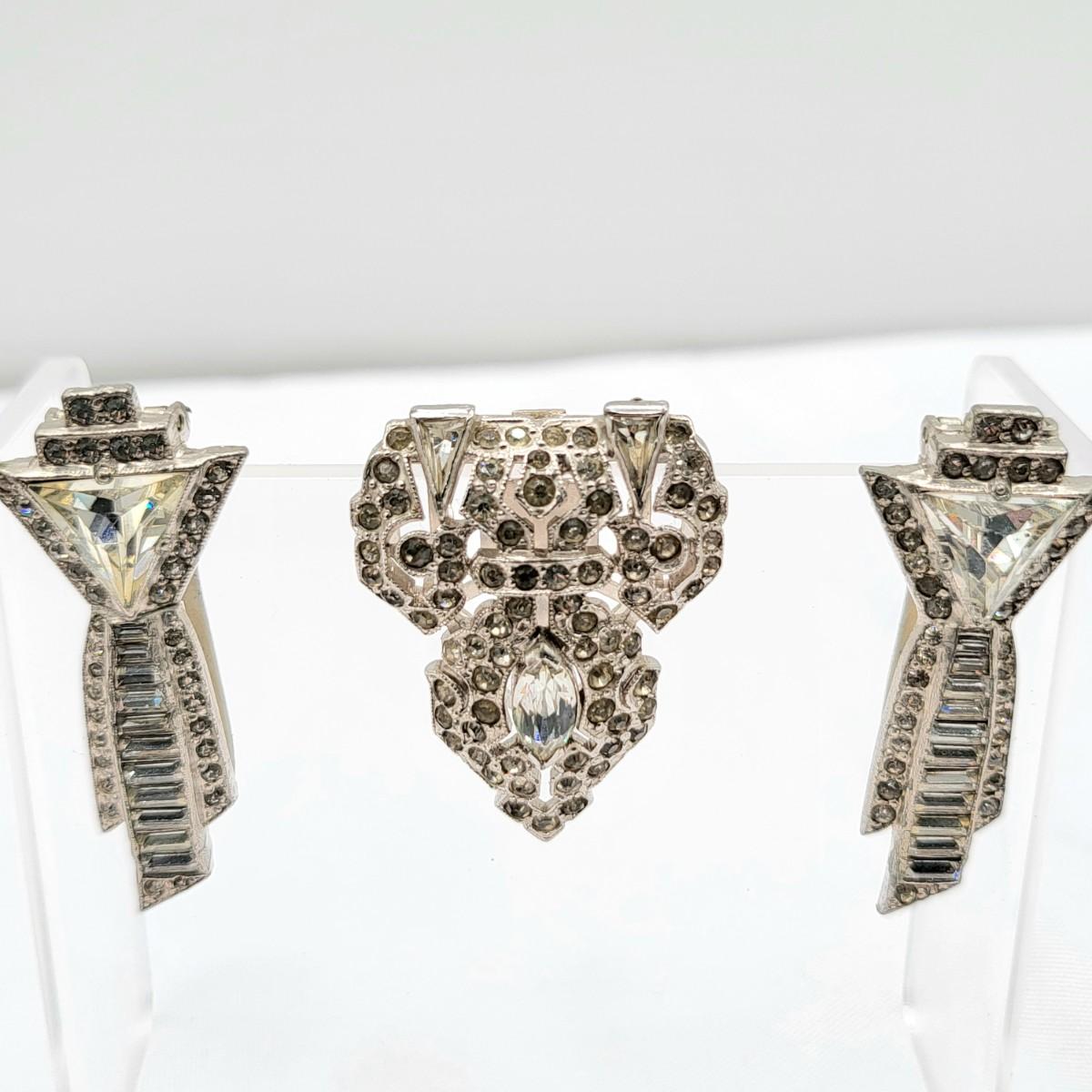 Gorgeous deco pair of 1.75" long dress clips with triangle, round and baguette rhinestones. Single smaller clip with clear rhinestones.