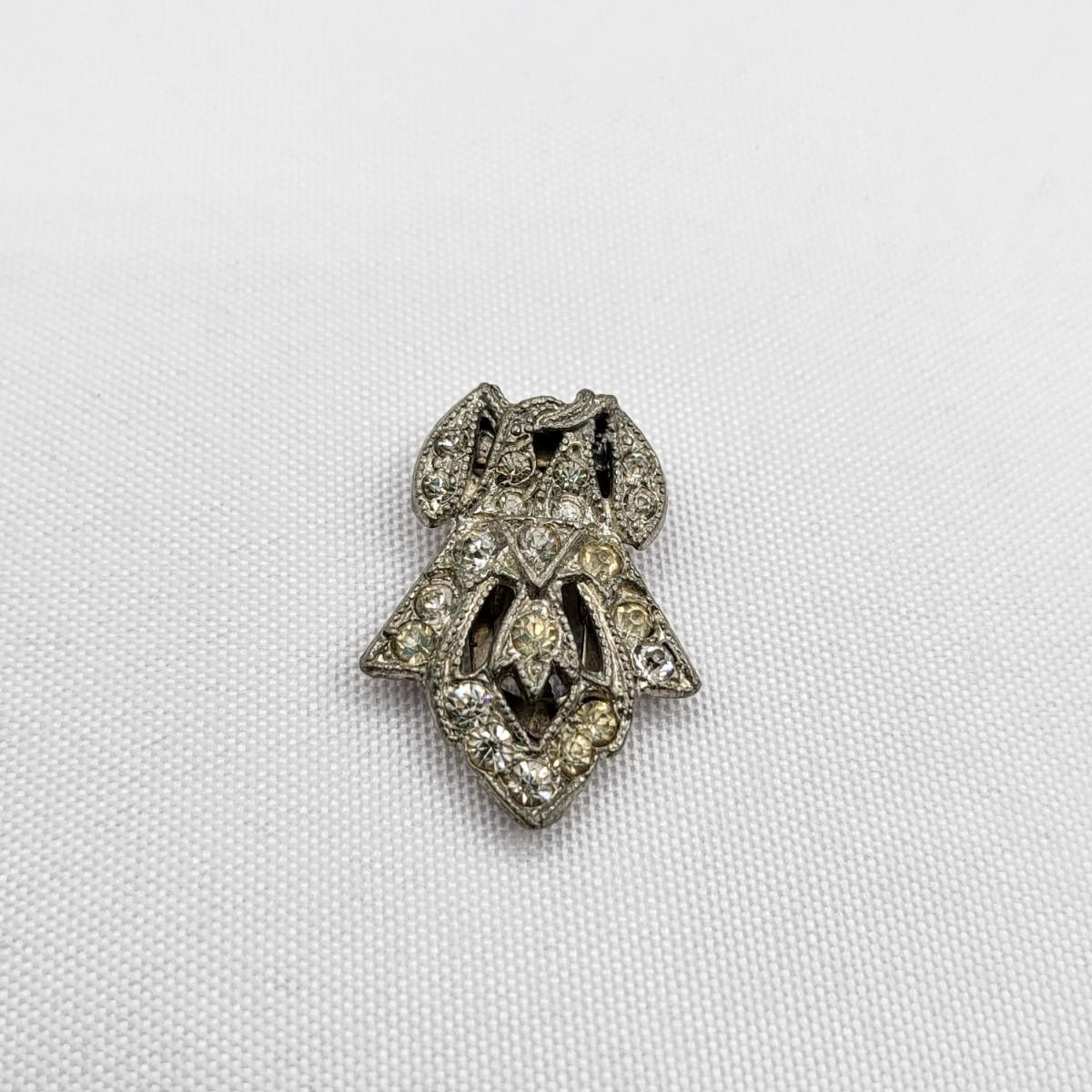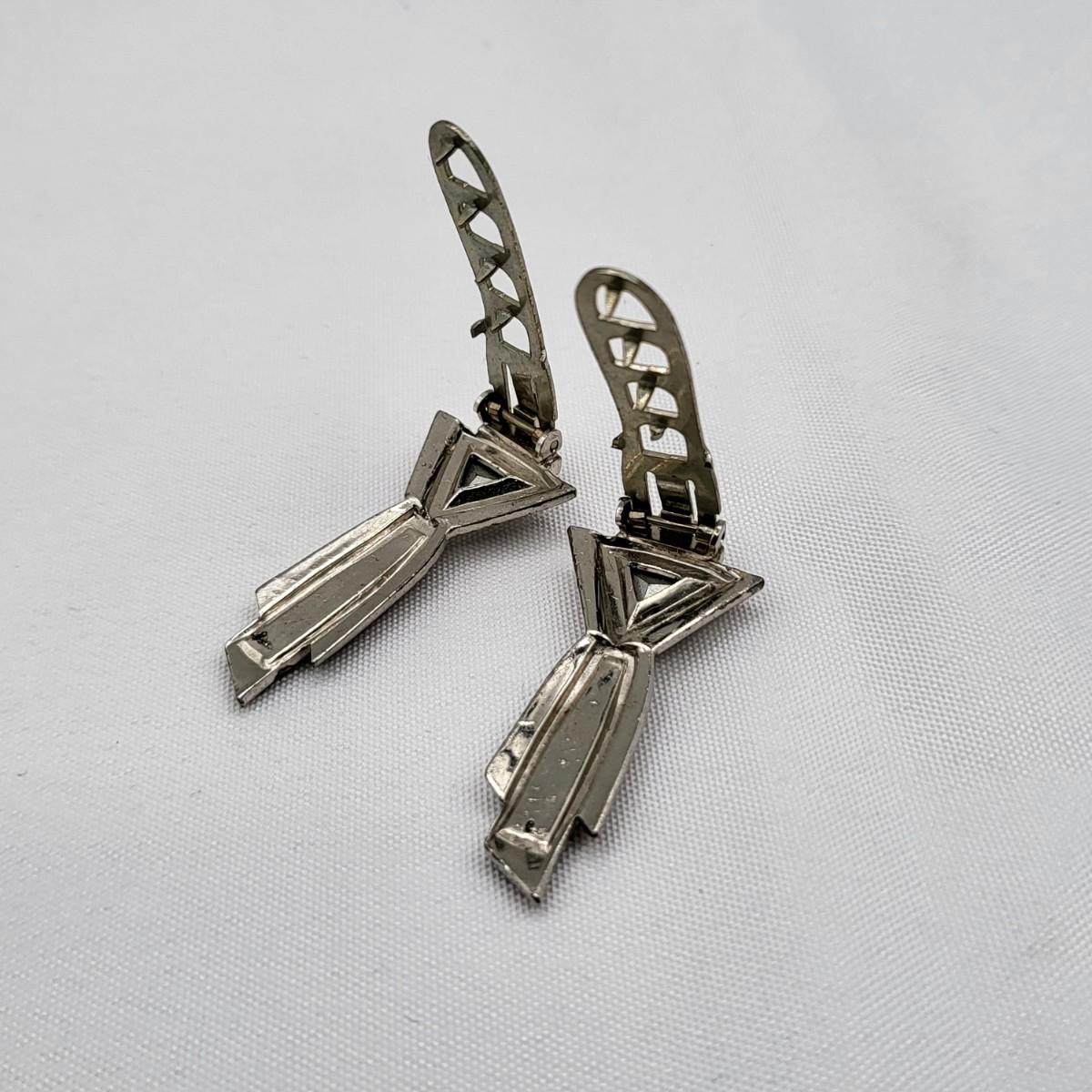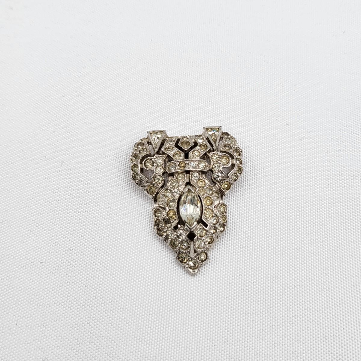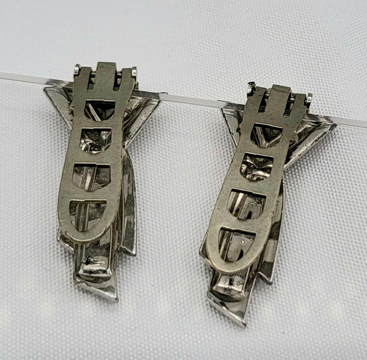 Gorgeous deco pair of 1.75" long dress clips with triangle, round and baguette rhinestones. Single smaller clip with clear rhinestones.