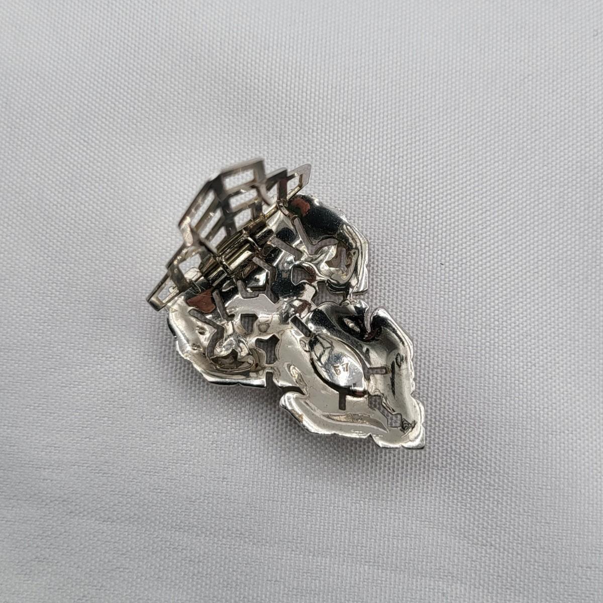 Single, highly collectible, Trifari dress clip, stamped TKF 57, clear rhinestones, silver tone metal, measuring 1.25" x 1.5".