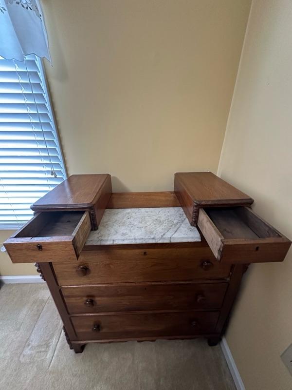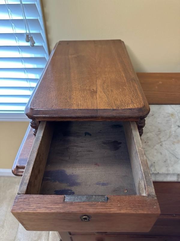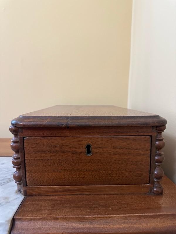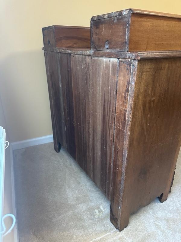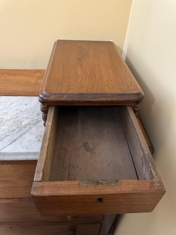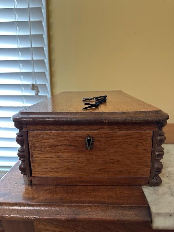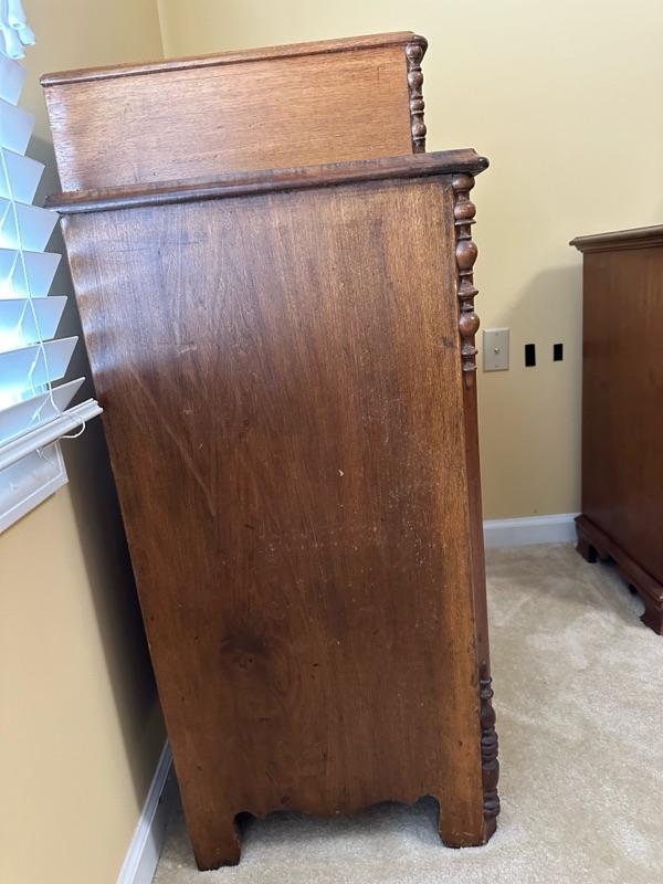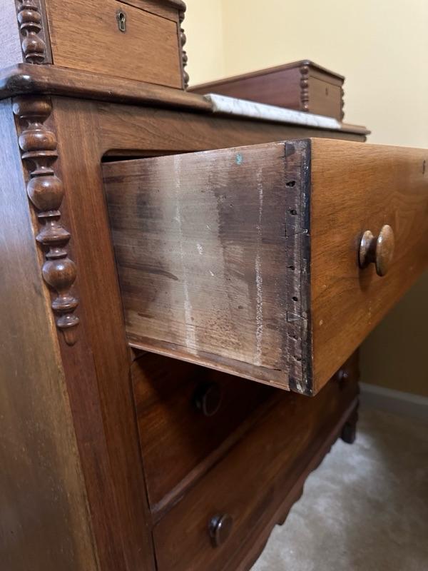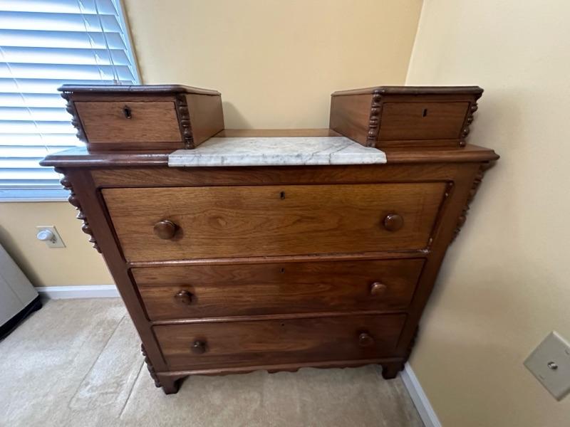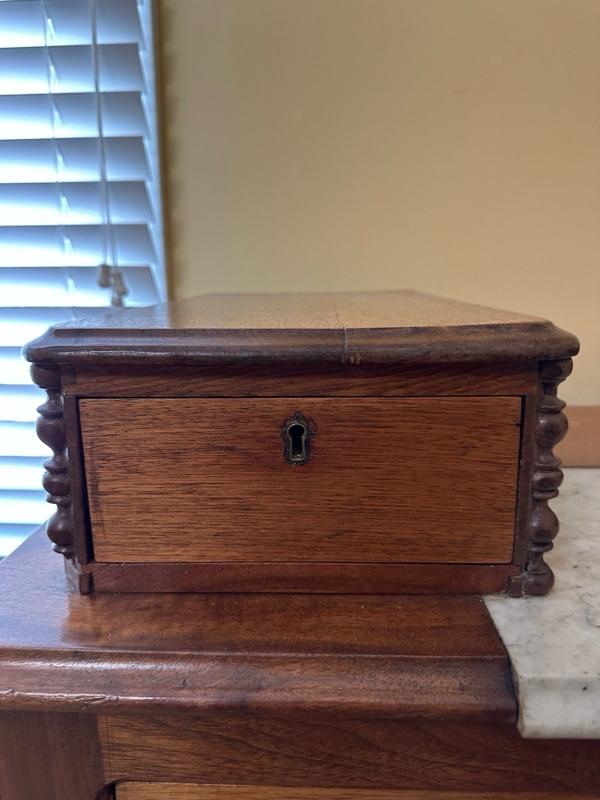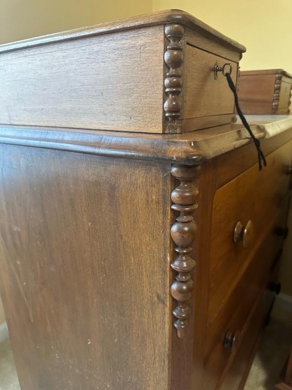 Antique Wooden Dresser with Rare Features. This is an excellent statement piece for any room. This chest of drawers also has two boxes attached on top. There is a decorative key that comes along with this piece.