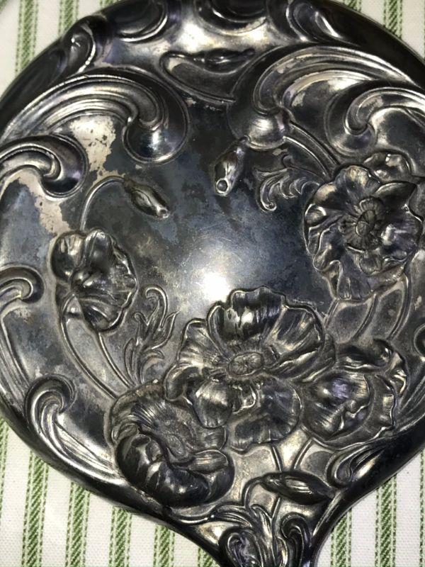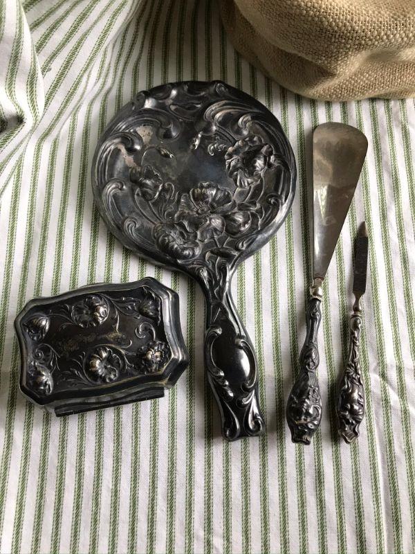 Silver plate repoussé set. Overall good condition with patina appropriate for age. Mirror is in good condition. Shipping available. Pick up Wednesday August 12th in Aurora IL. Can hold until actual estate sale with prepayment. Sale will start on the 19th of Aurgust.