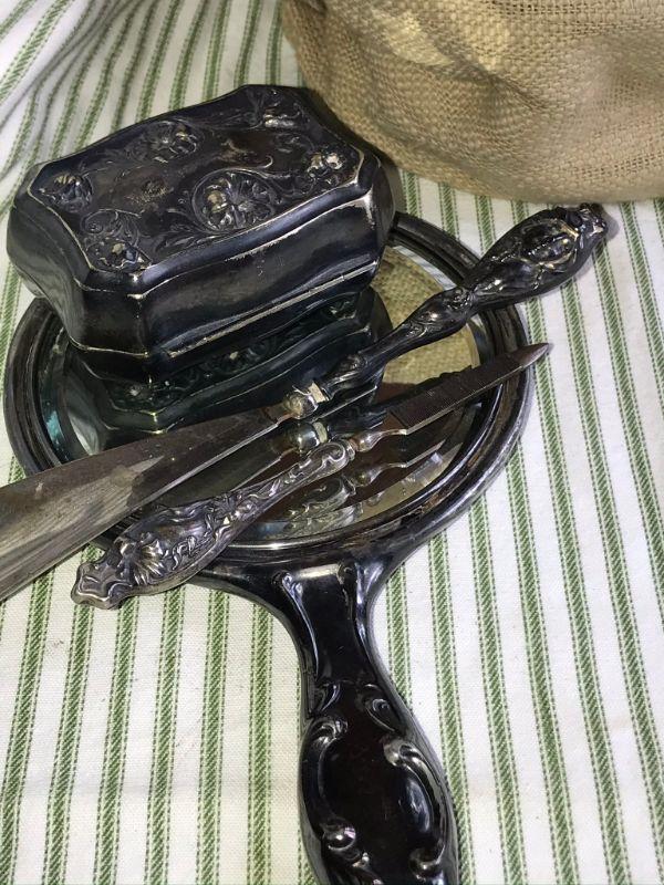 Antique Dresser Set, Mirror, horseshoe, nail file and soap box