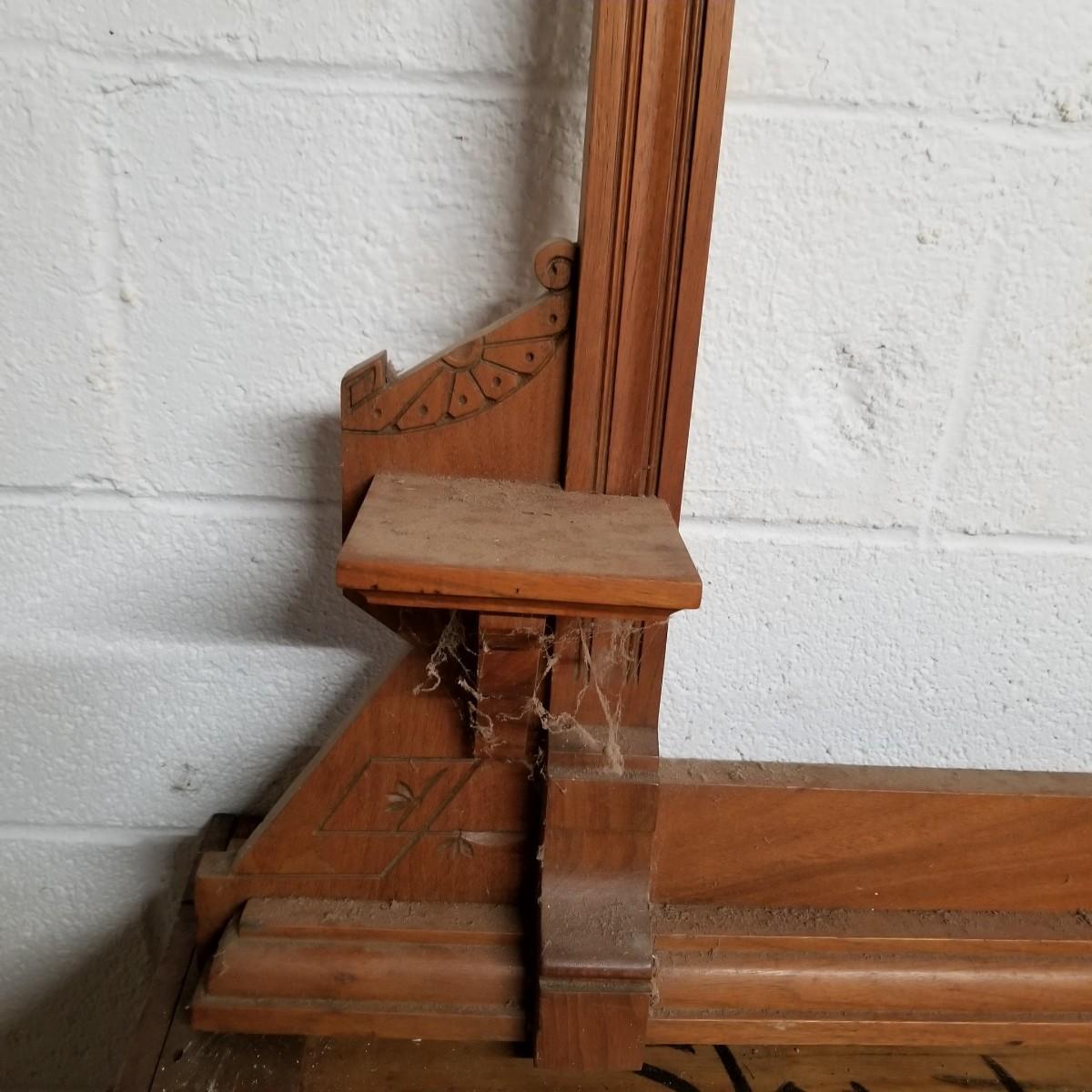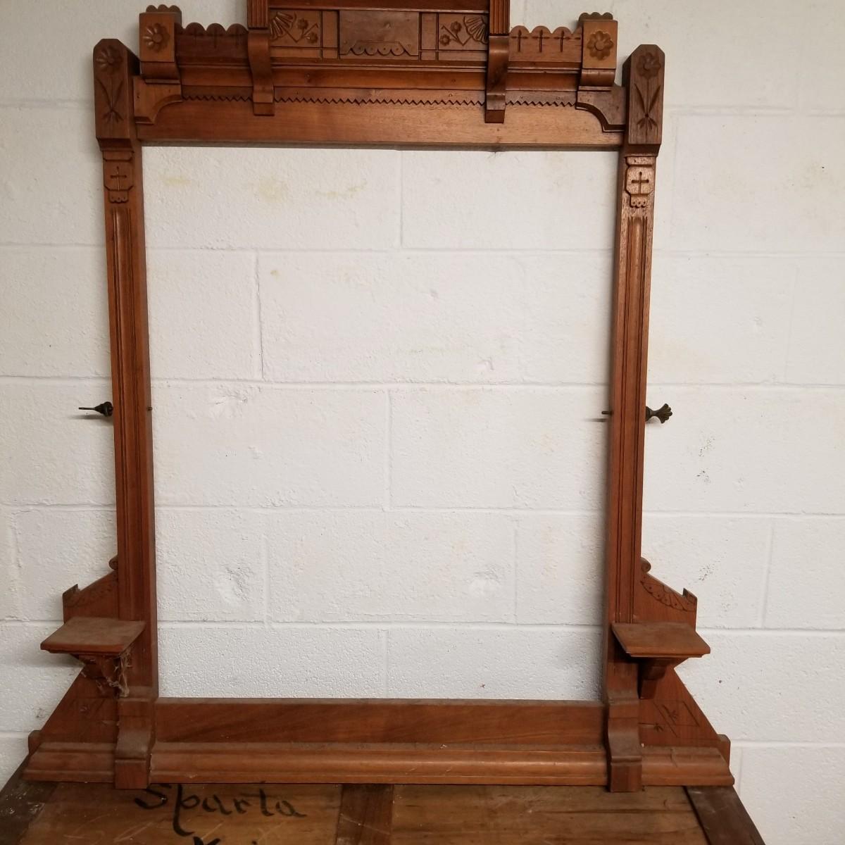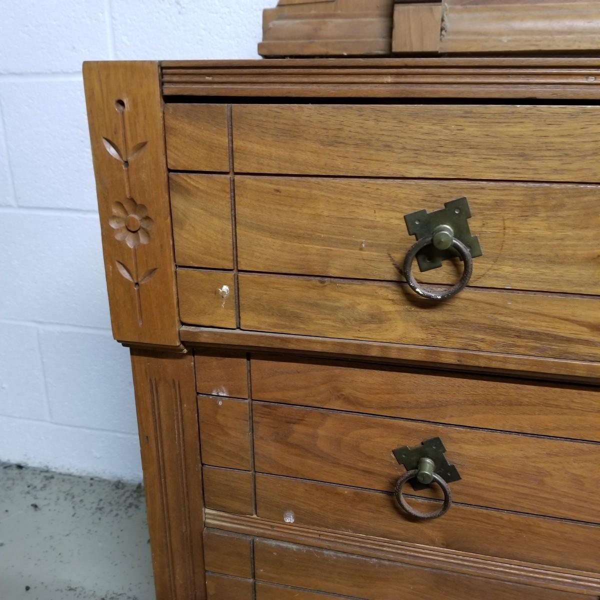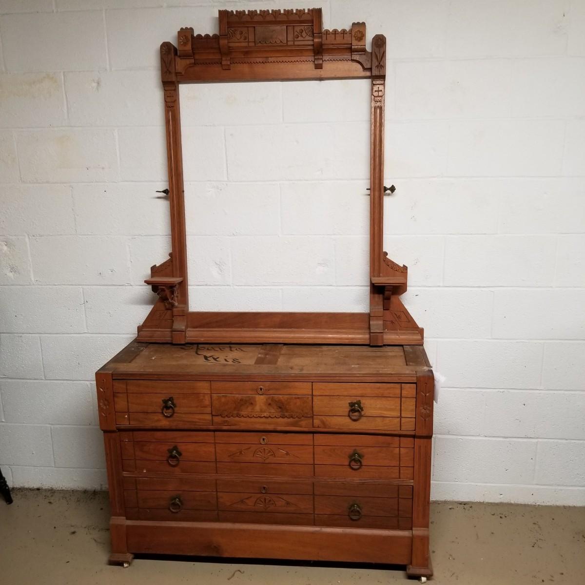 Antique three drawer dresser with mirror frame.  Carved drawer fronts, brass pulls and doweled corners on the drawers,  see photos.  White ceramic casters.  Mirror frame has carving and detail top and sides, also two small shelves.   Dresser is 44" x 18.5" x 29", mirror is 43" x 5" x 46".  No glass in frame, and no marble top on dresser.  Local pickup only.