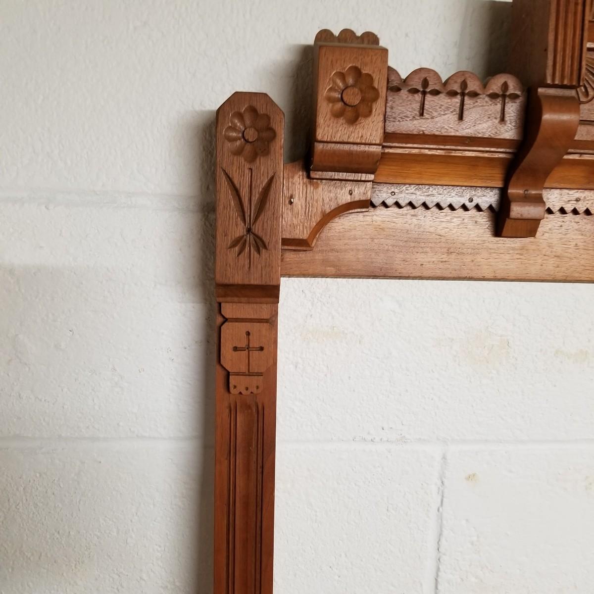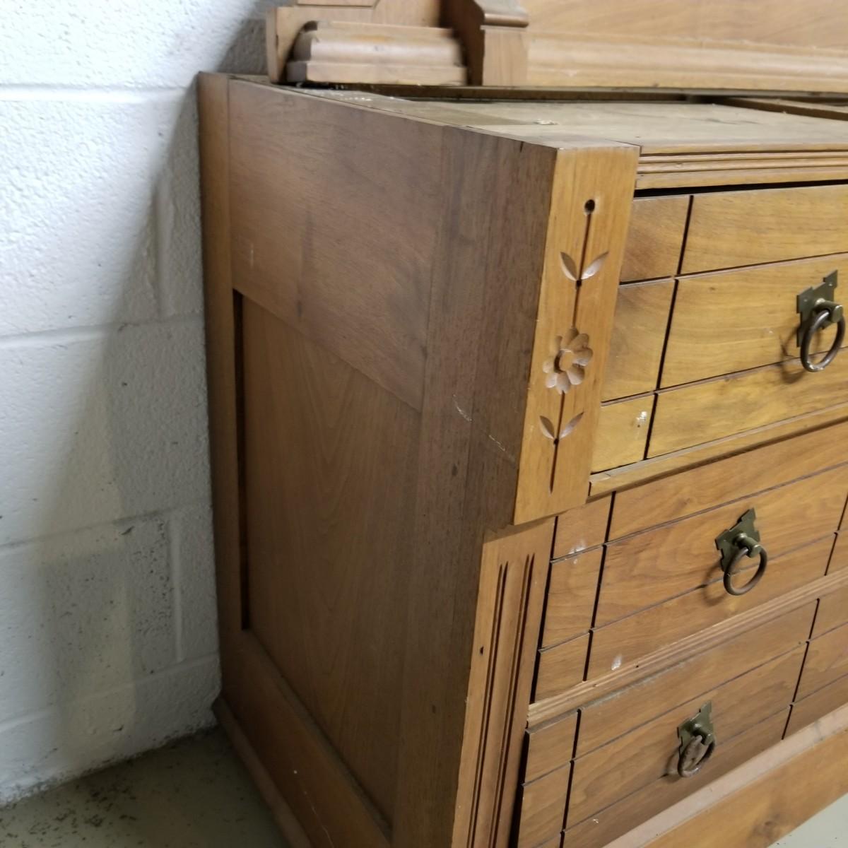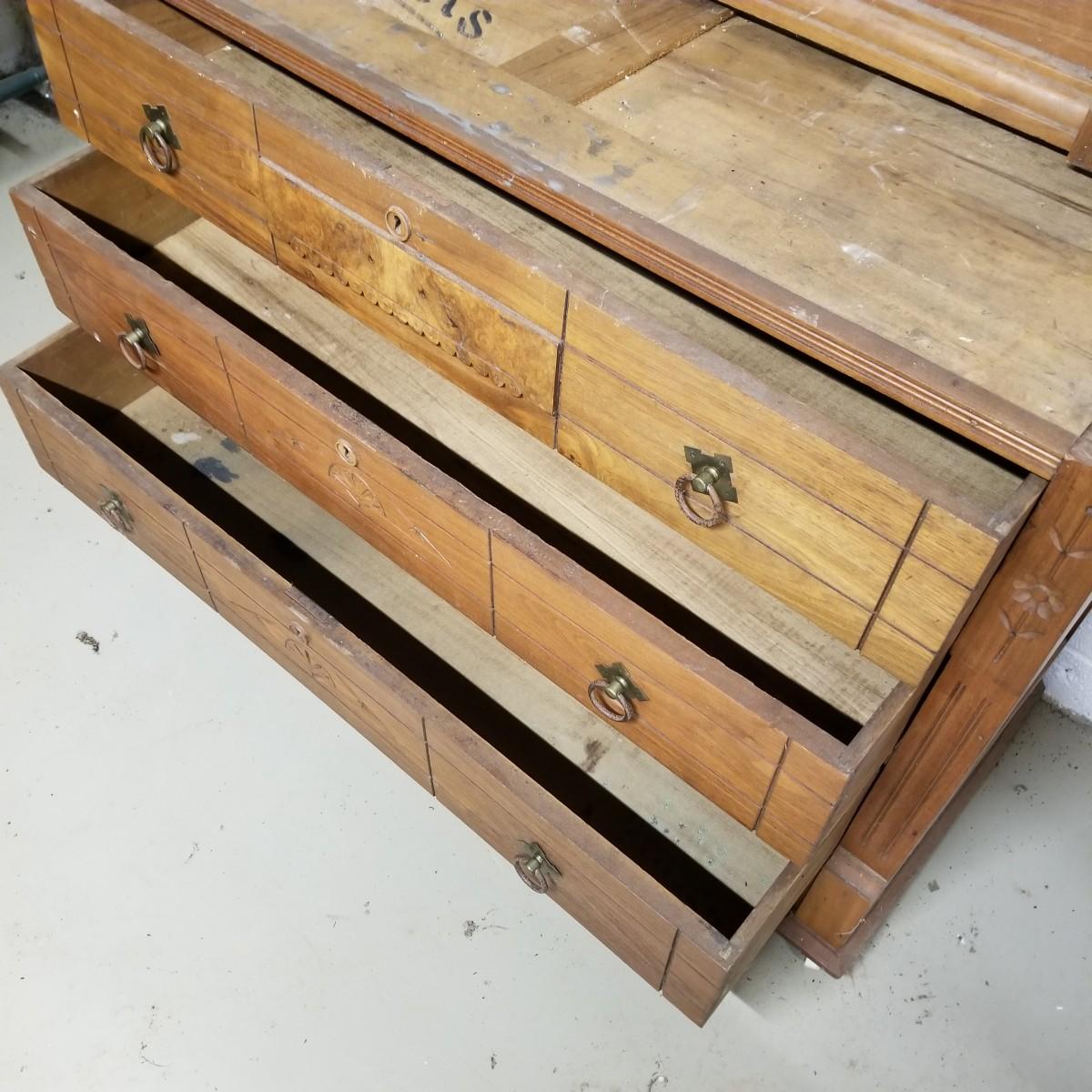 Antique three drawer dresser with mirror frame.  Carved drawer fronts, brass pulls and doweled corners on the drawers,  see photos.  White ceramic casters.  Mirror frame has carving and detail top and sides, also two small shelves.   Dresser is 44" x 18.5" x 29", mirror is 43" x 5" x 46".  No glass in frame, and no marble top on dresser.  Local pickup only.