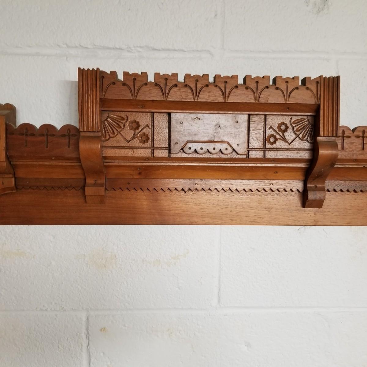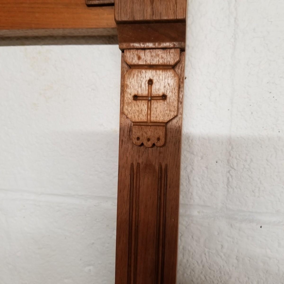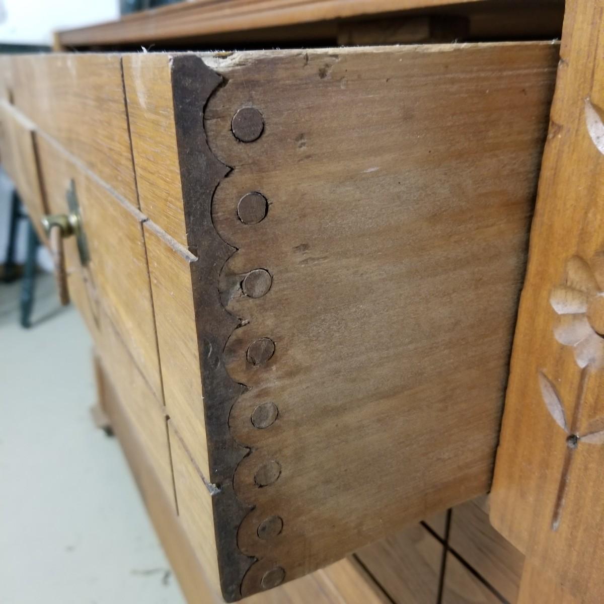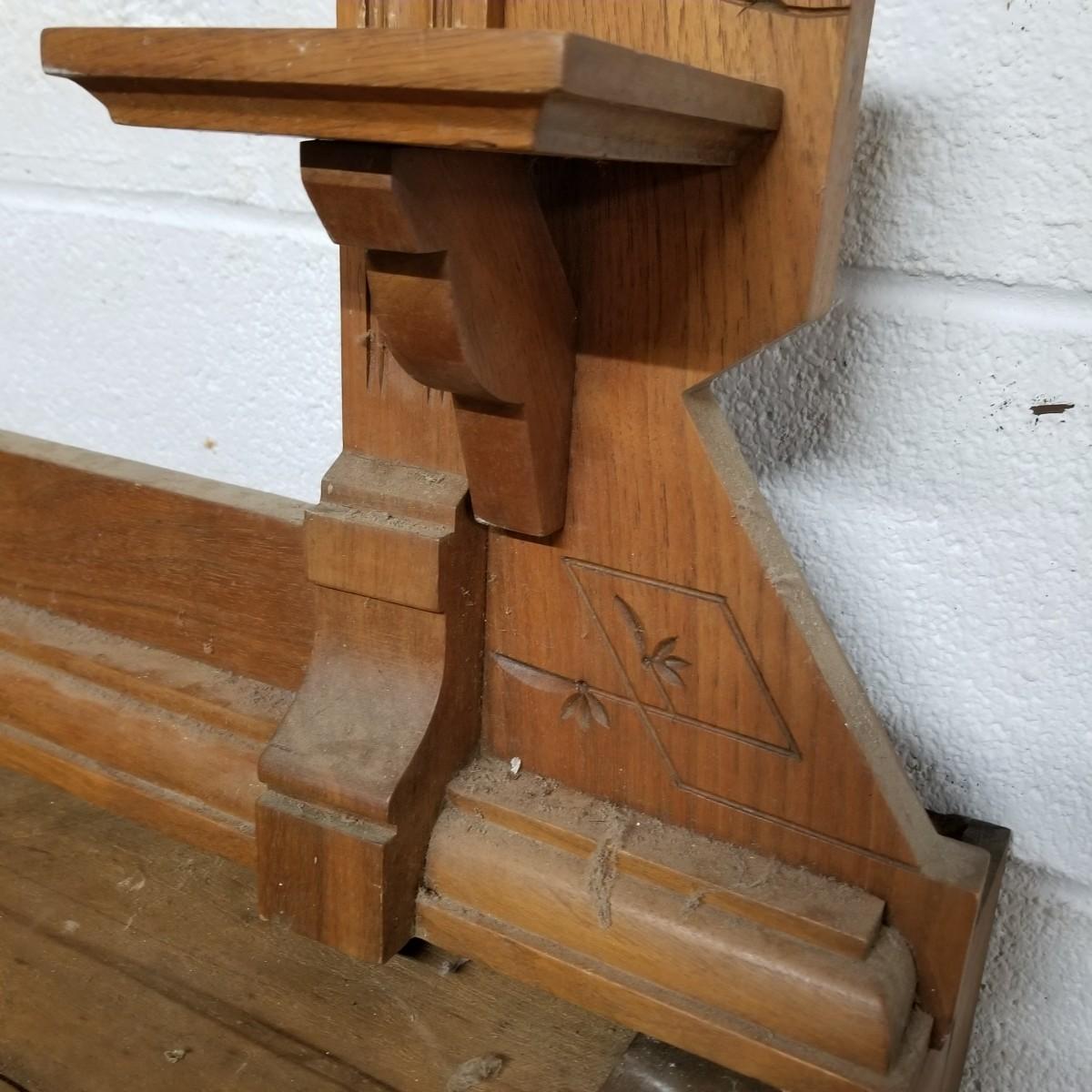 Antique three drawer dresser with mirror frame.  Carved drawer fronts, brass pulls and doweled corners on the drawers,  see photos.  White ceramic casters.  Mirror frame has carving and detail top and sides, also two small shelves.   Dresser is 44" x 18.5" x 29", mirror is 43" x 5" x 46".  No glass in frame, and no marble top on dresser.  Local pickup only.