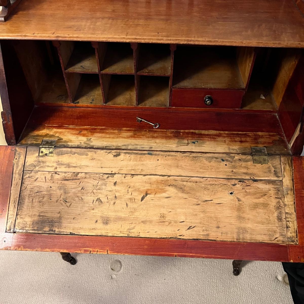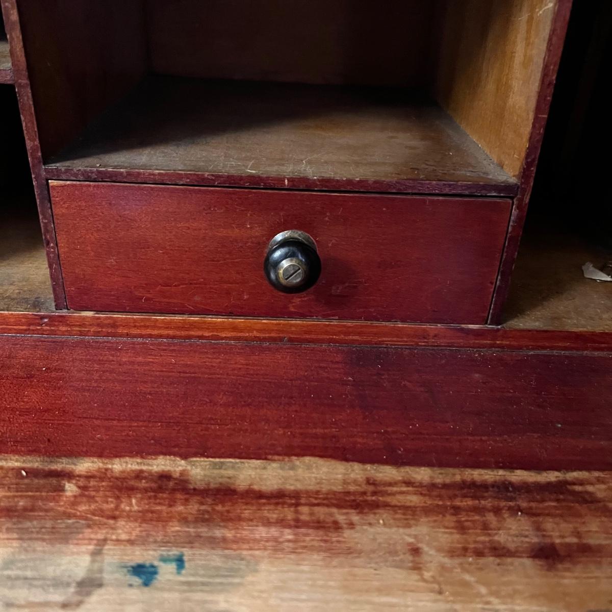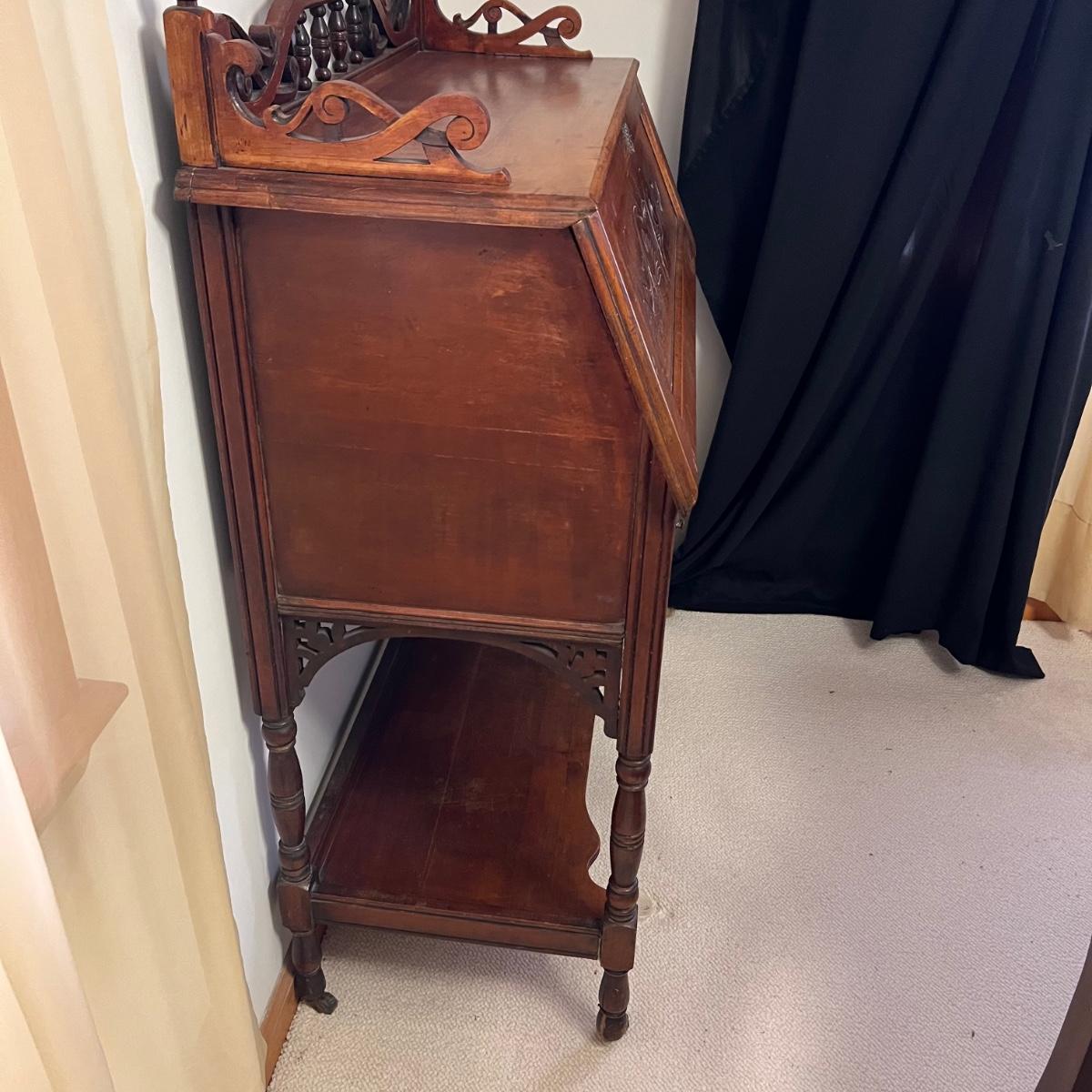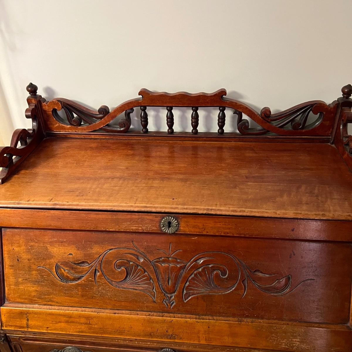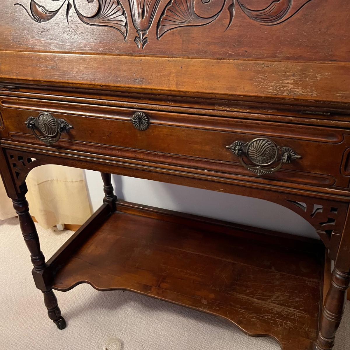 This beautiful solid wood Secretary desk is in very good condition structurally. The front is carved with a brass key hole (no key included). The inside of the drop down front is partially unfinished wood. Desk features seven small compartments and a small drawer; below that is one drawer and below that a shelf. Legs are on casters. The minor blemishes includes a small crack on one leg, some scratches on the shelf and a small section missing from the inside frame of the desk area.