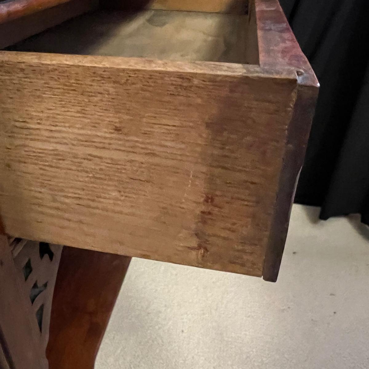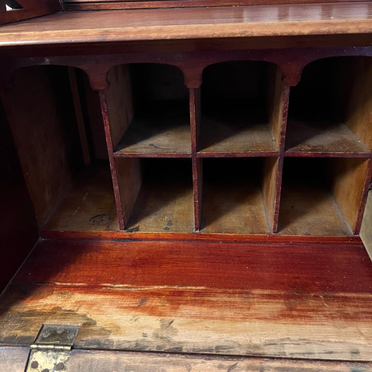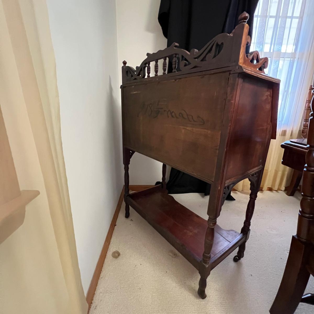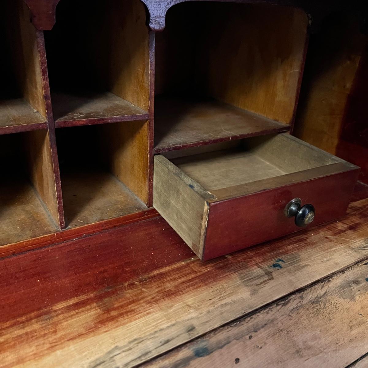 This beautiful solid wood Secretary desk is in very good condition structurally. The front is carved with a brass key hole (no key included). The inside of the drop down front is partially unfinished wood. Desk features seven small compartments and a small drawer; below that is one drawer and below that a shelf. Legs are on casters. The minor blemishes includes a small crack on one leg, some scratches on the shelf and a small section missing from the inside frame of the desk area.