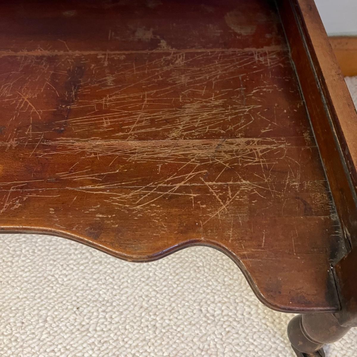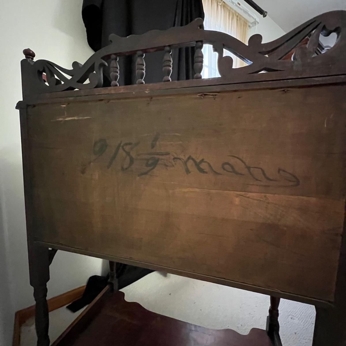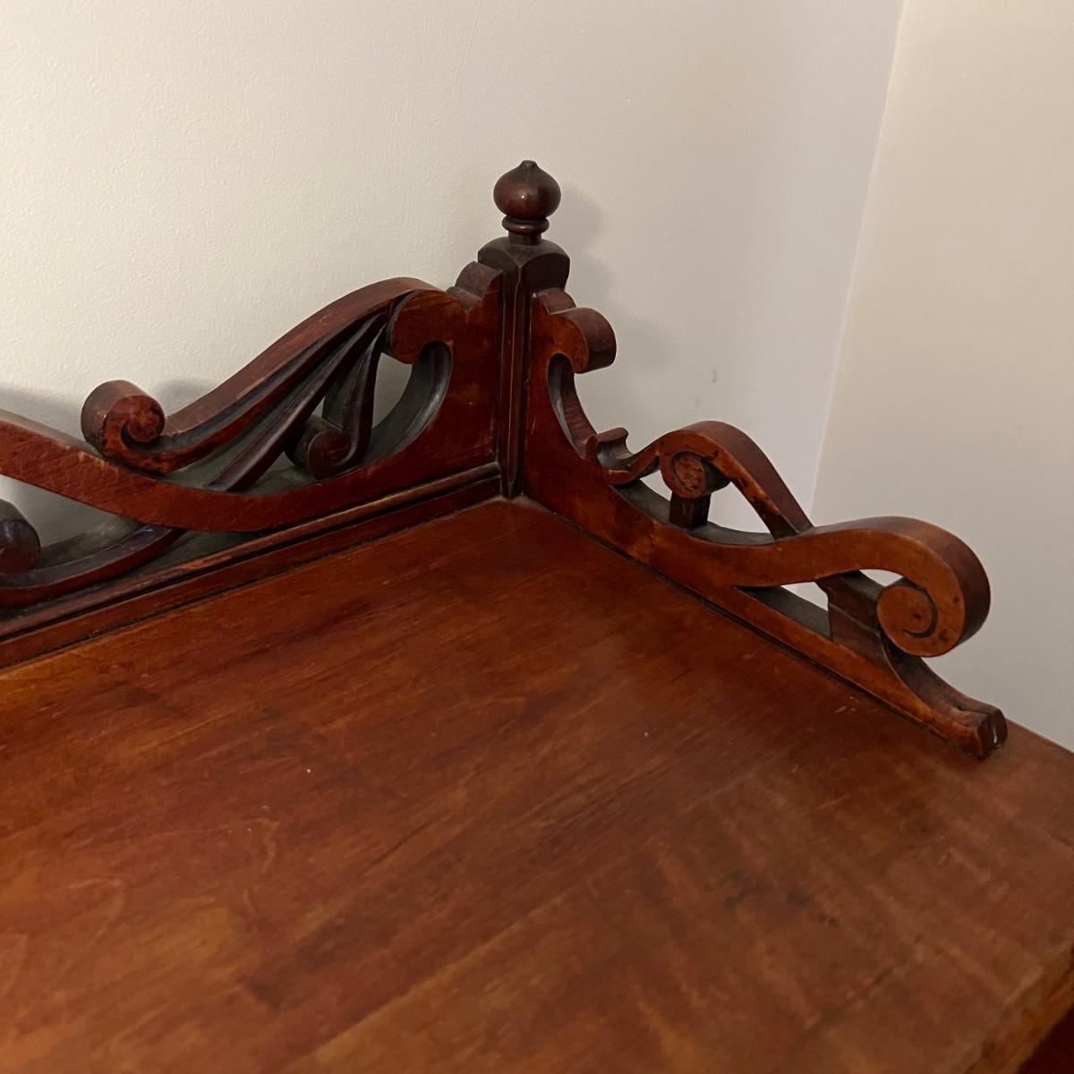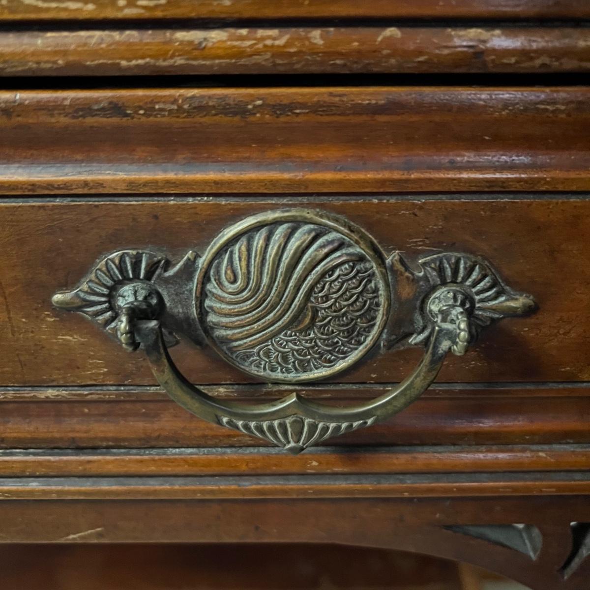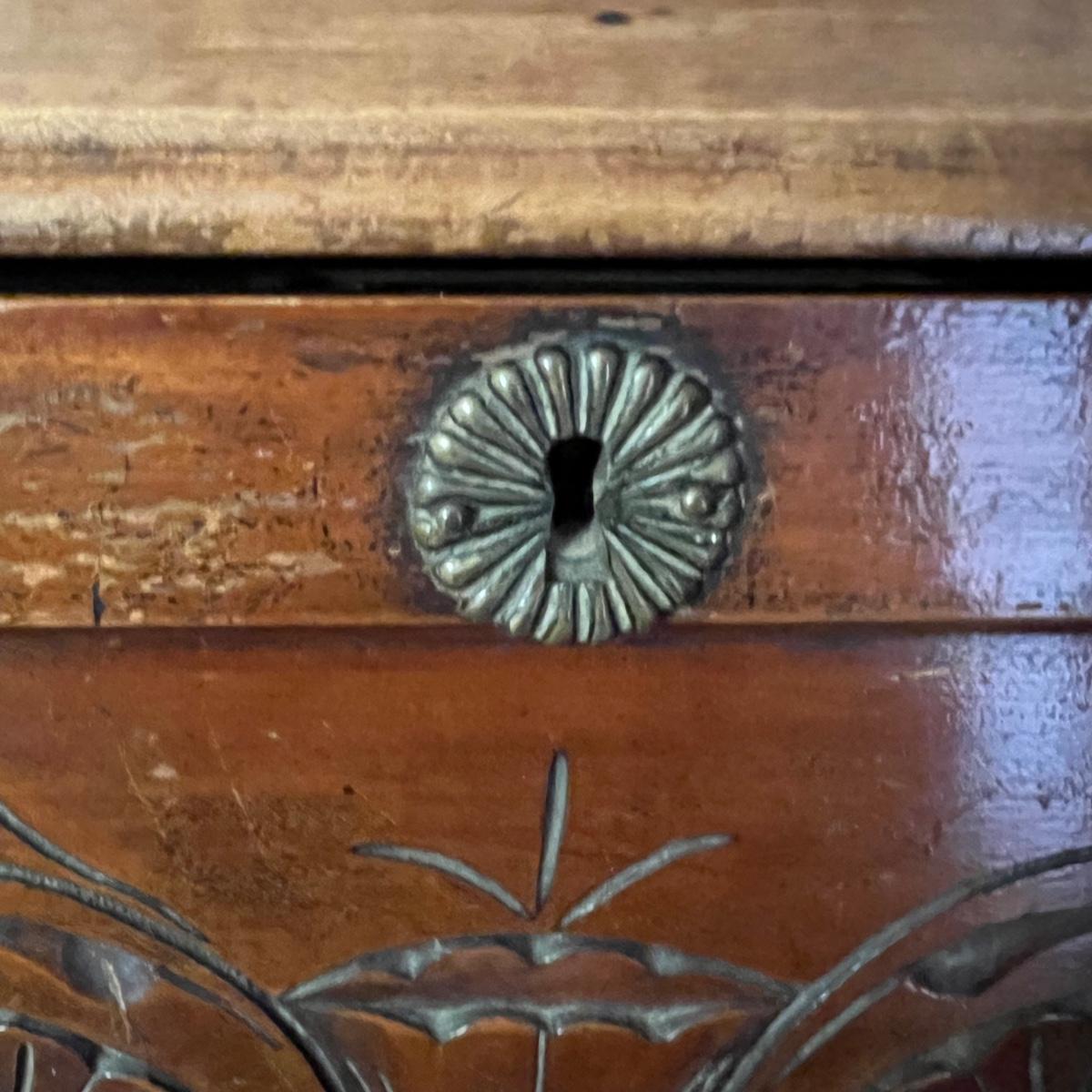 This beautiful solid wood Secretary desk is in very good condition structurally. The front is carved with a brass key hole (no key included). The inside of the drop down front is partially unfinished wood. Desk features seven small compartments and a small drawer; below that is one drawer and below that a shelf. Legs are on casters. The minor blemishes includes a small crack on one leg, some scratches on the shelf and a small section missing from the inside frame of the desk area.