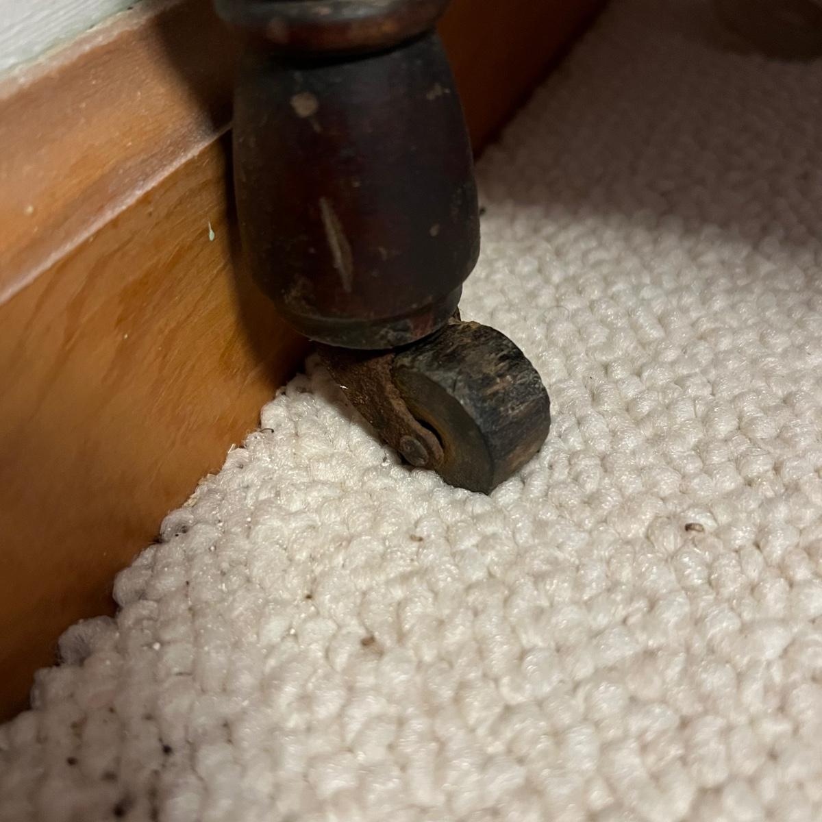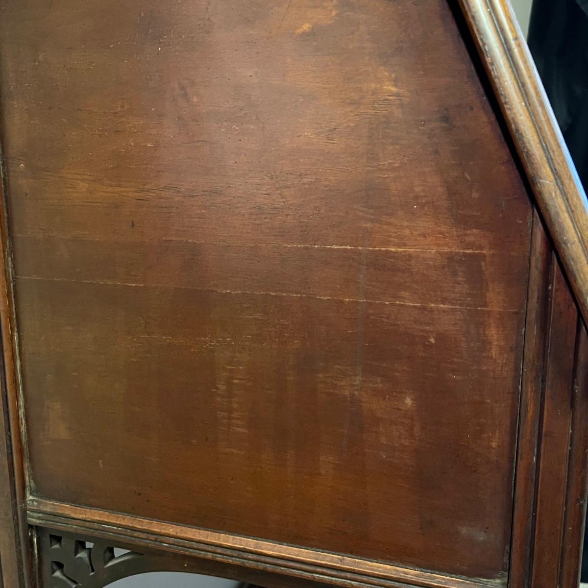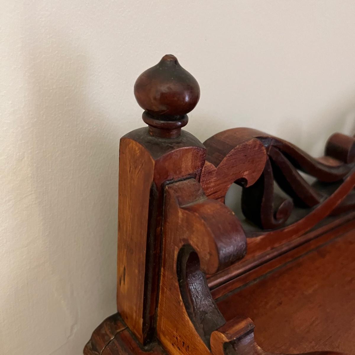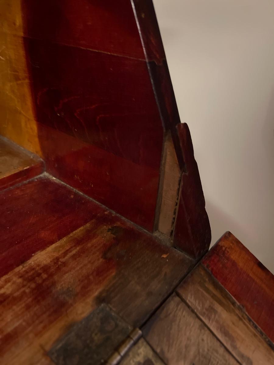 This beautiful solid wood Secretary desk is in very good condition structurally. The front is carved with a brass key hole (no key included). The inside of the drop down front is partially unfinished wood. Desk features seven small compartments and a small drawer; below that is one drawer and below that a shelf. Legs are on casters. The minor blemishes includes a small crack on one leg, some scratches on the shelf and a small section missing from the inside frame of the desk area.