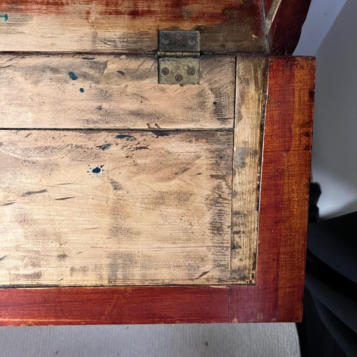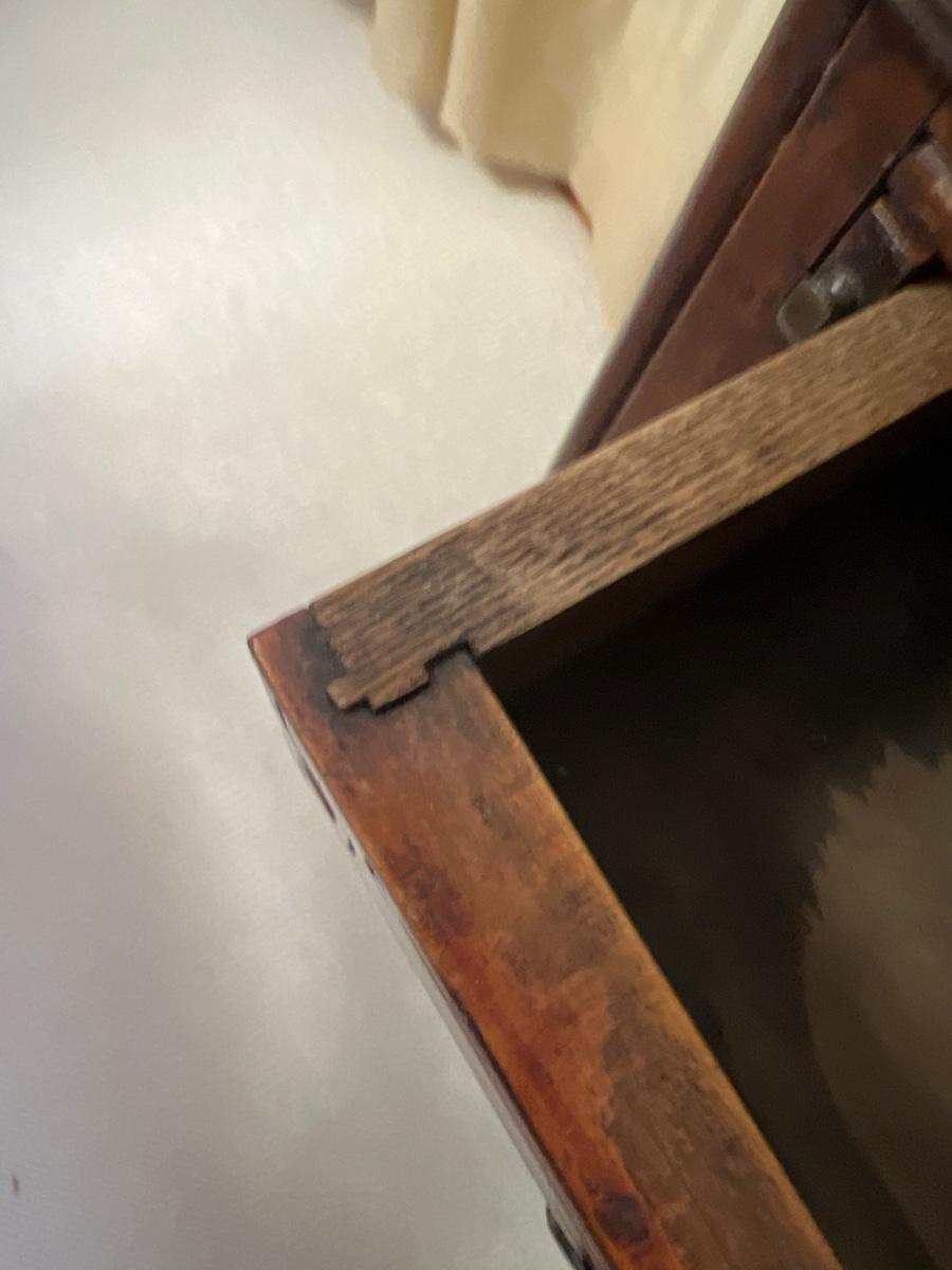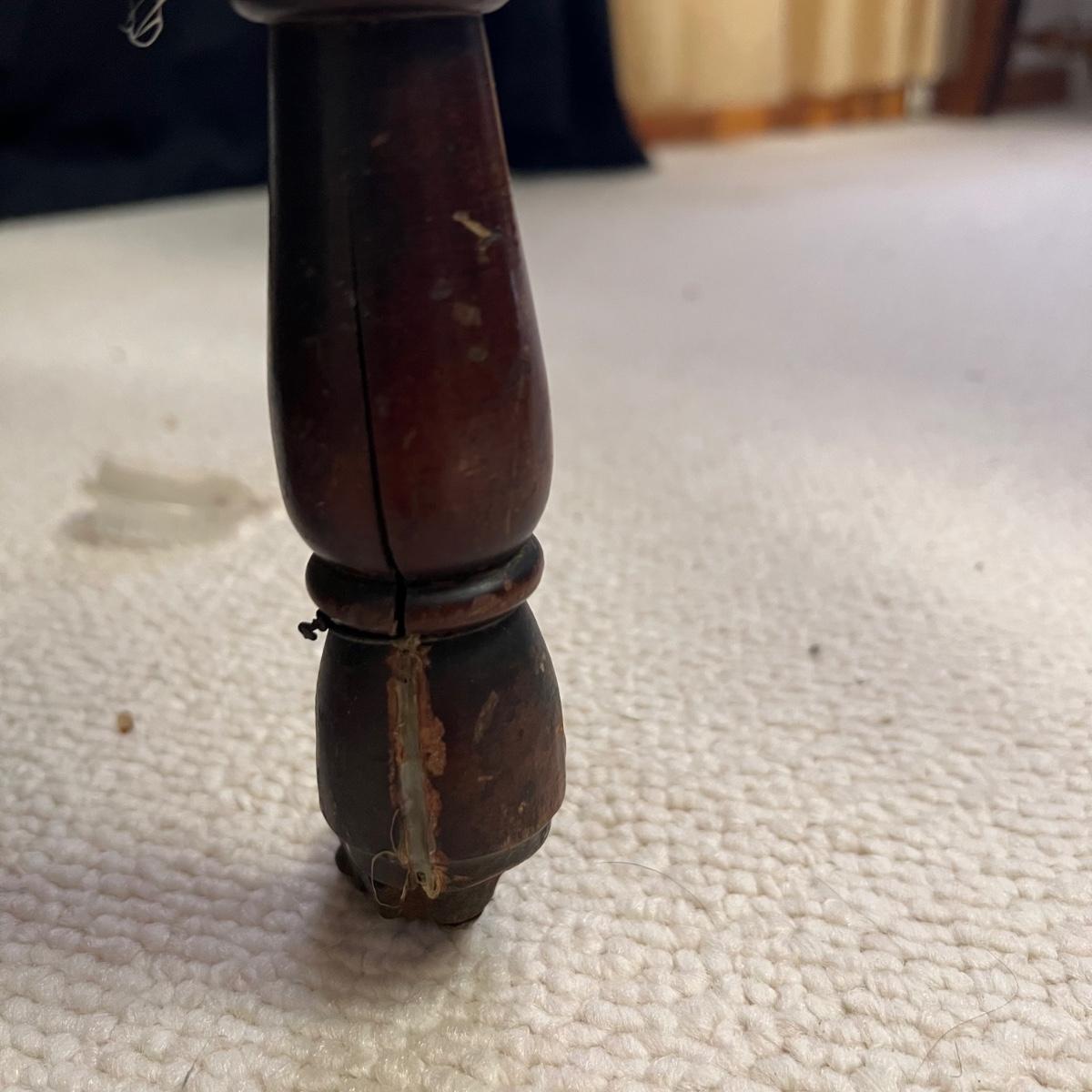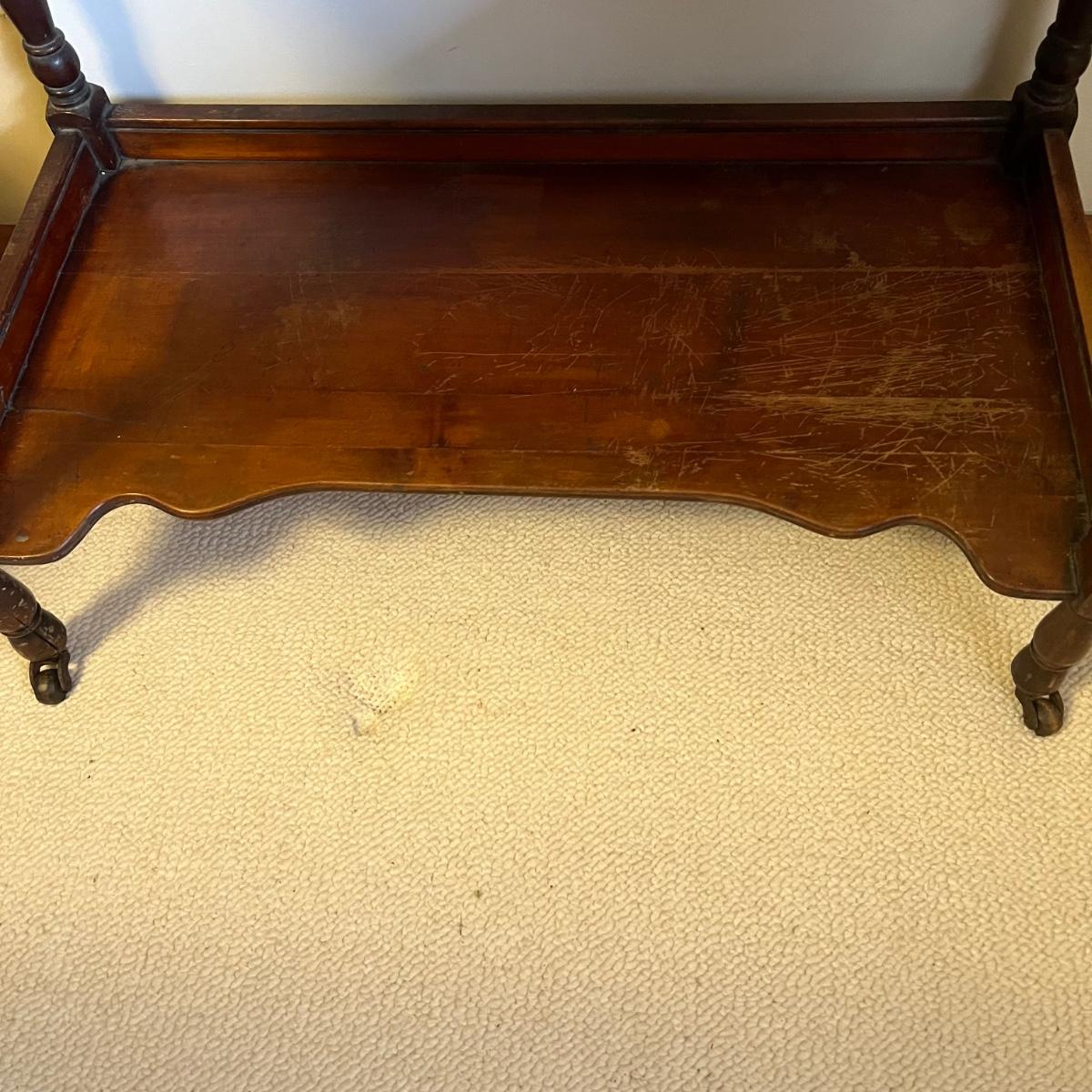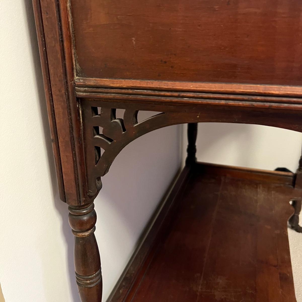 This beautiful solid wood Secretary desk is in very good condition structurally. The front is carved with a brass key hole (no key included). The inside of the drop down front is partially unfinished wood. Desk features seven small compartments and a small drawer; below that is one drawer and below that a shelf. Legs are on casters. The minor blemishes includes a small crack on one leg, some scratches on the shelf and a small section missing from the inside frame of the desk area.