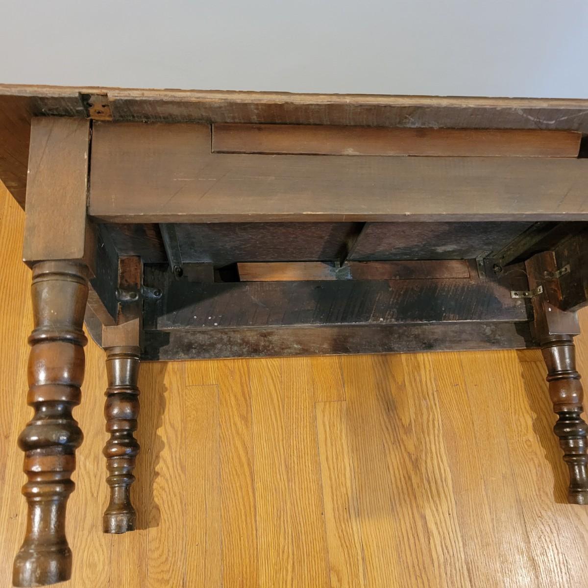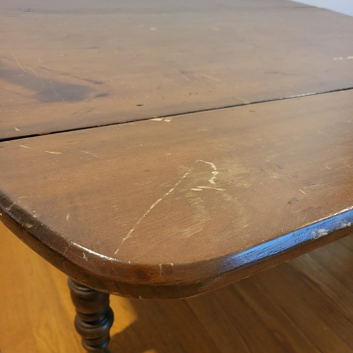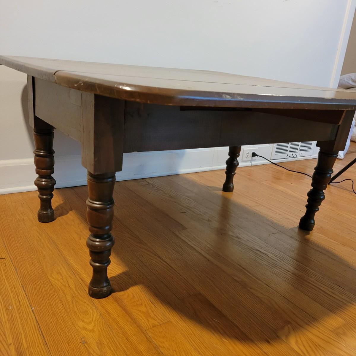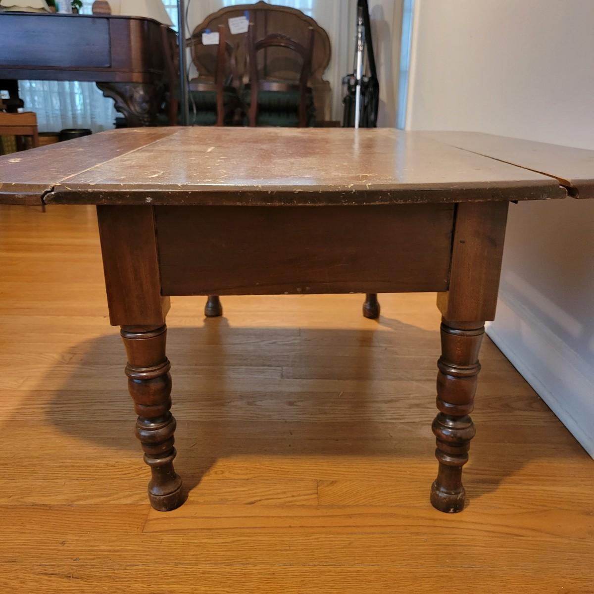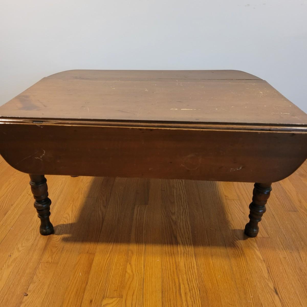 Antique solid wood drop leaf coffee table. The table has seen years of use and will require some repairs and possibly need refinishing. Repairs have been preformed on the table previously, but unfortunately, one drop leaf is detached. See attached pictures for more details. Table measures approximately 39" x 36.5" x 19" Local pickup only