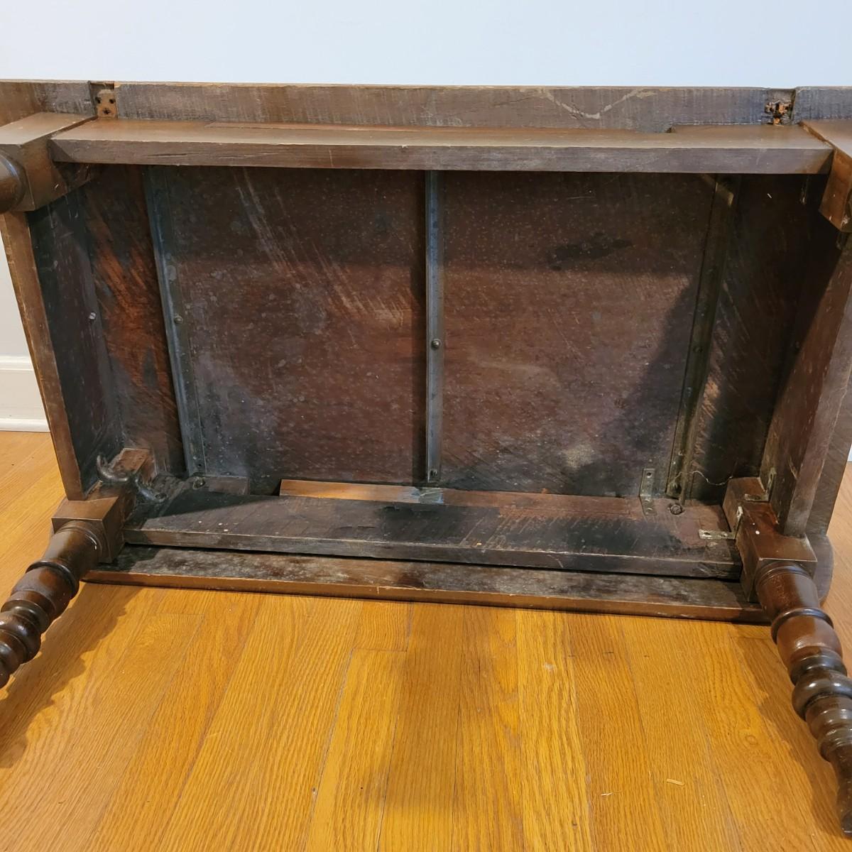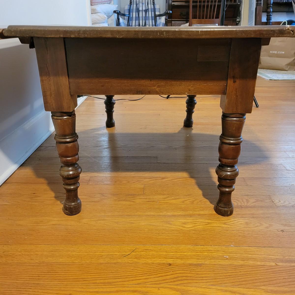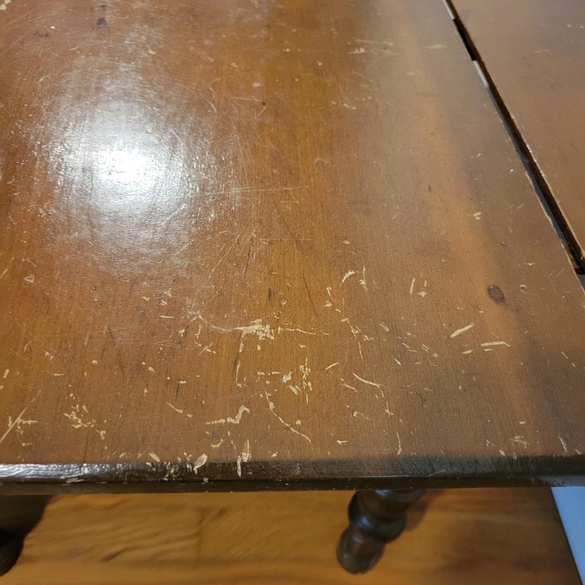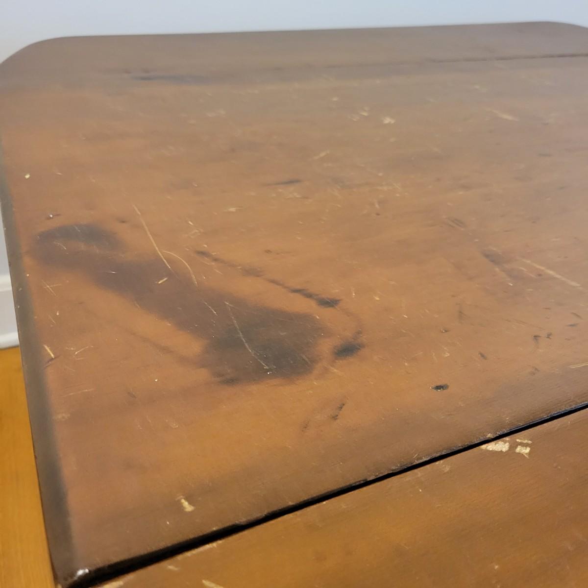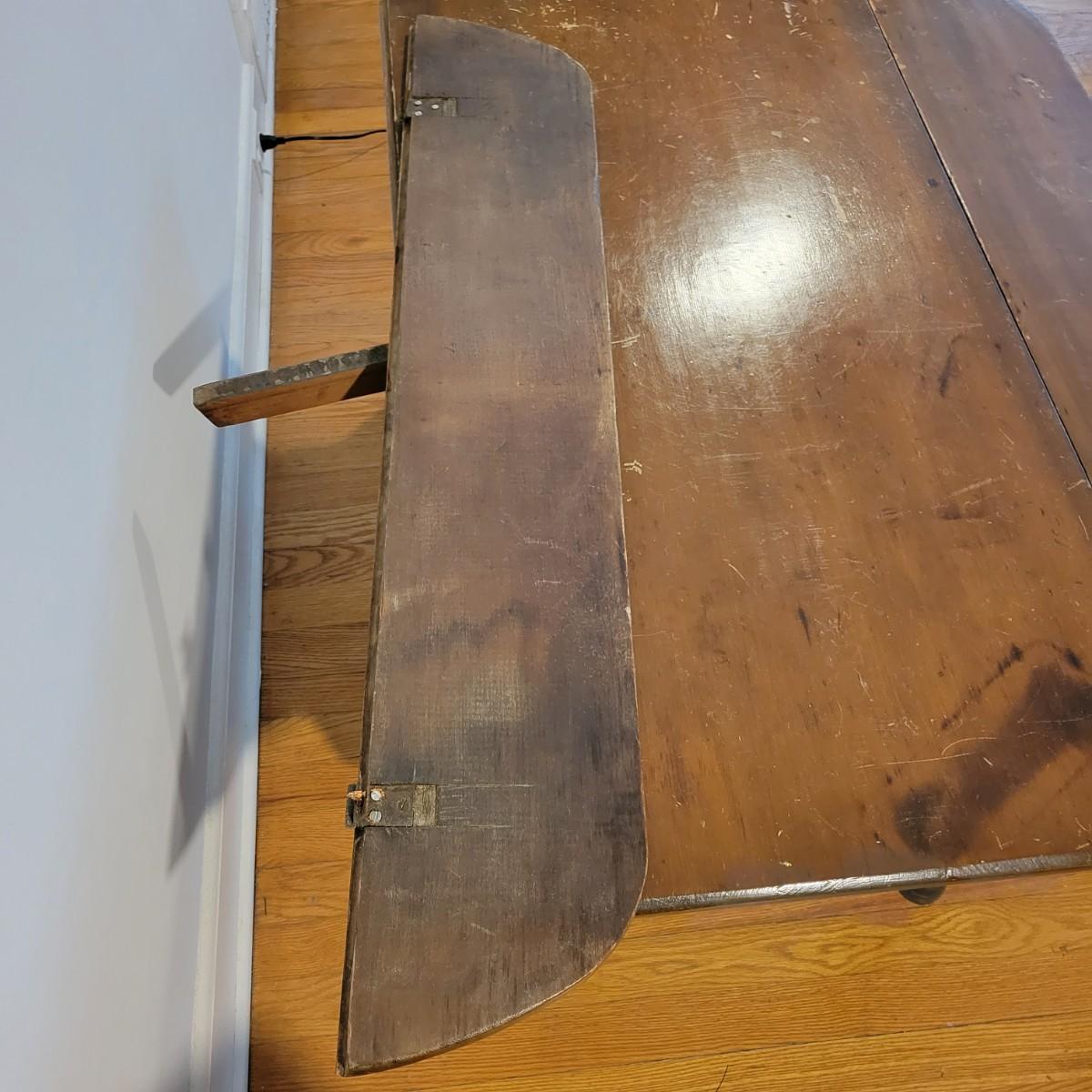 Antique solid wood drop leaf coffee table. The table has seen years of use and will require some repairs and possibly need refinishing. Repairs have been preformed on the table previously, but unfortunately, one drop leaf is detached. See attached pictures for more details. Table measures approximately 39" x 36.5" x 19" Local pickup only