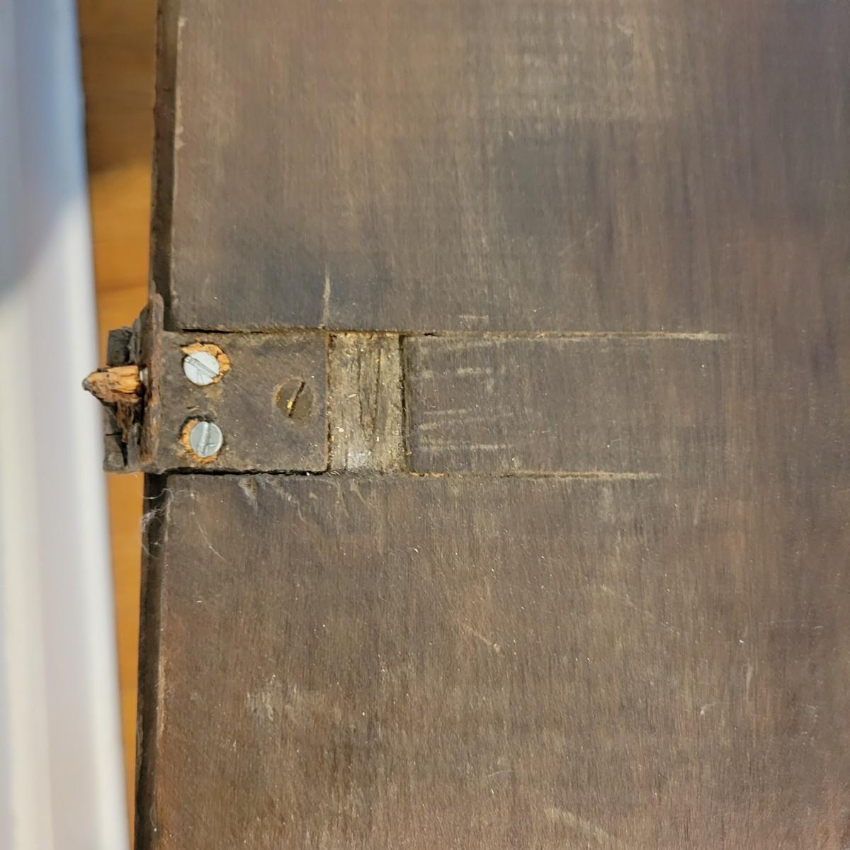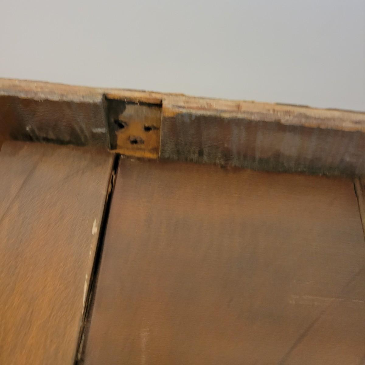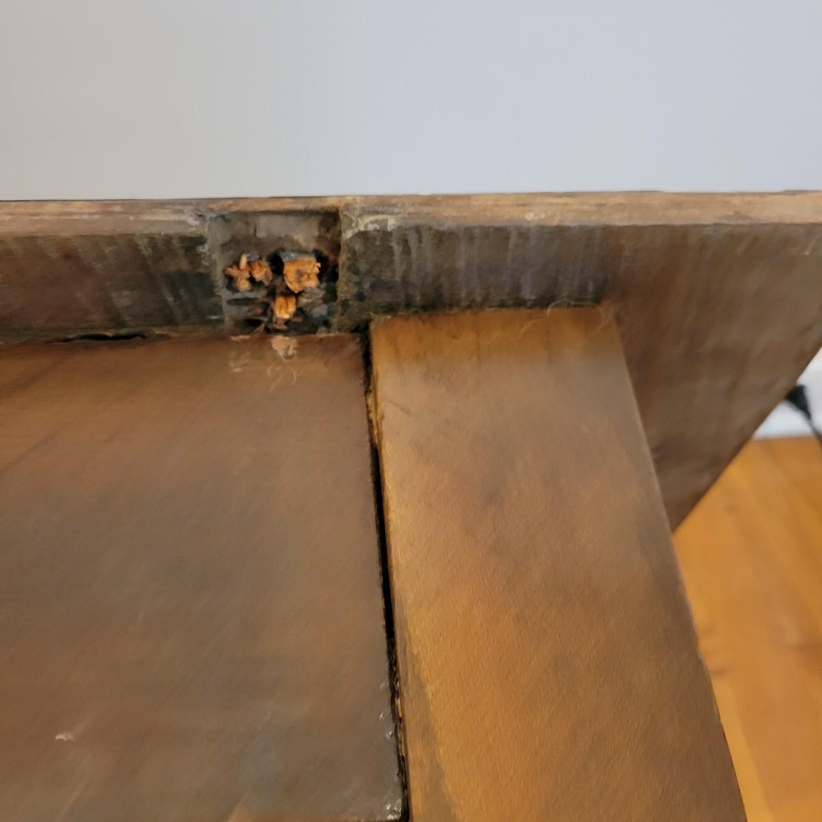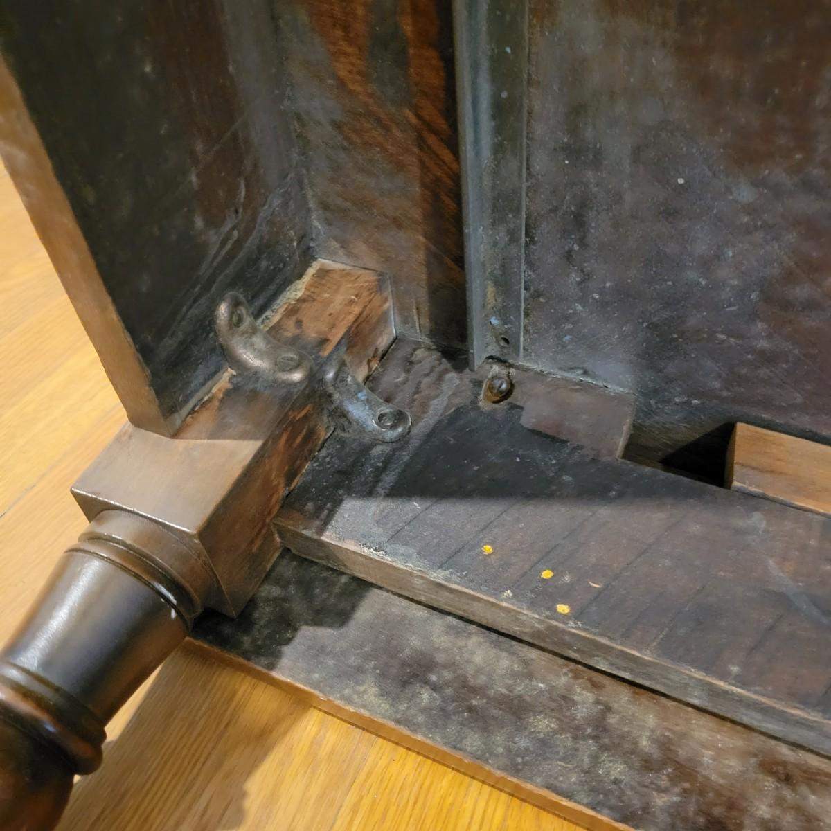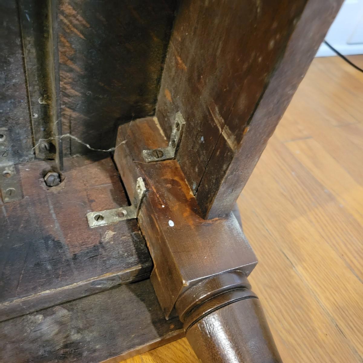 Antique solid wood drop leaf coffee table. The table has seen years of use and will require some repairs and possibly need refinishing. Repairs have been preformed on the table previously, but unfortunately, one drop leaf is detached. See attached pictures for more details. Table measures approximately 39" x 36.5" x 19" Local pickup only