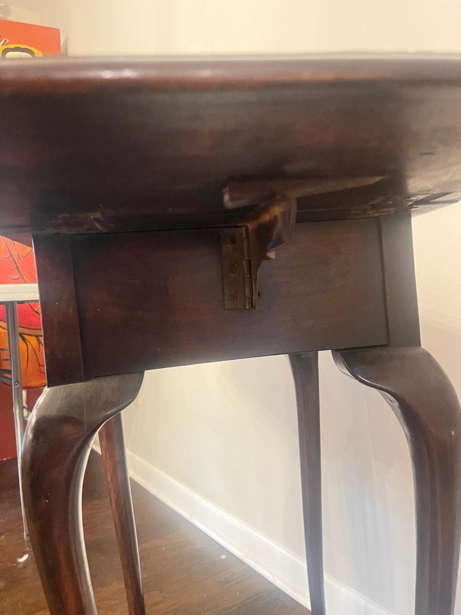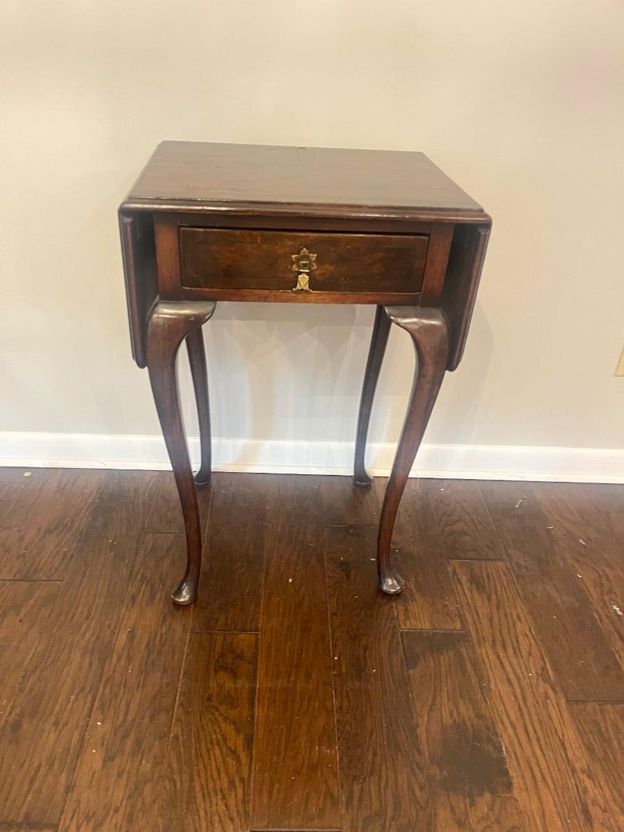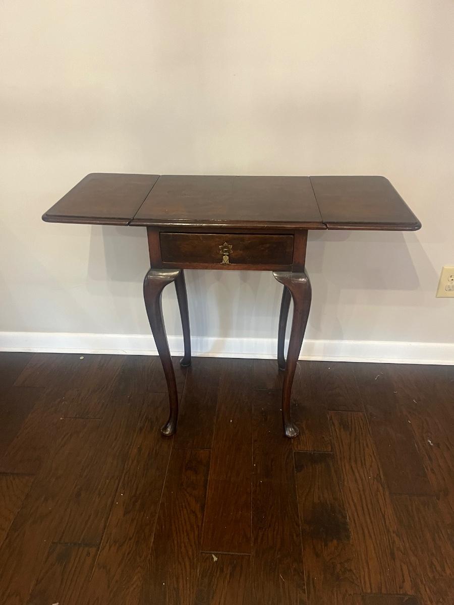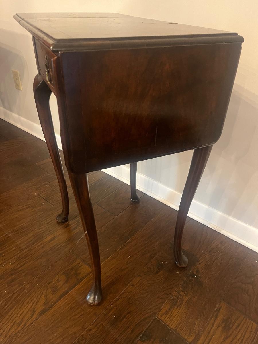 Lot includes an antique drop leaf side table with one dovetailed drawer. Table measures 15" x 19" x 29.5"H when leaves are down and 15" x 35.5" x 29.5"H when leaves are up. Top of table has one piece of veneer missing, see pictures.
