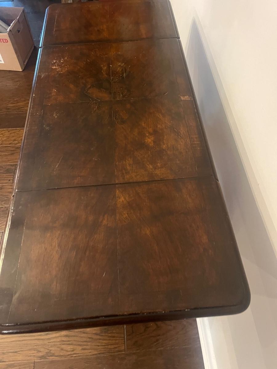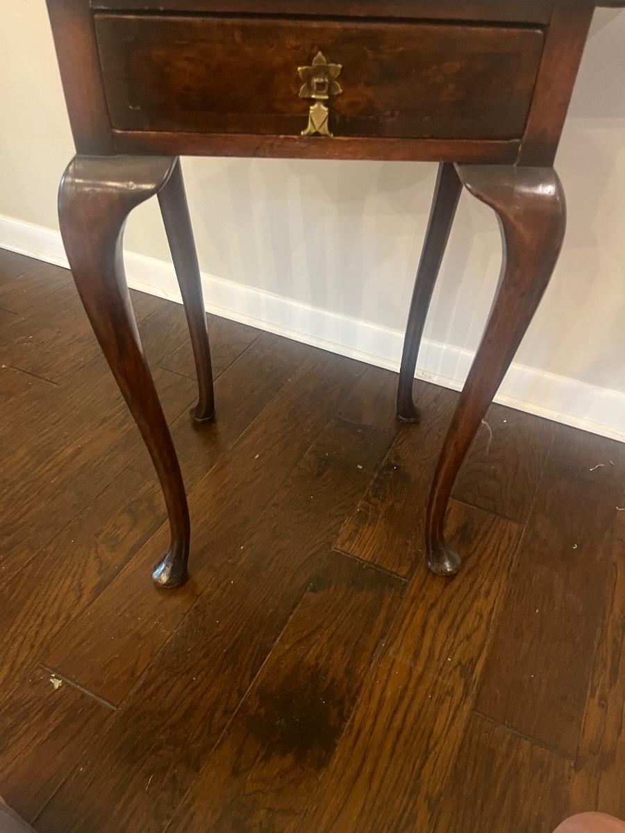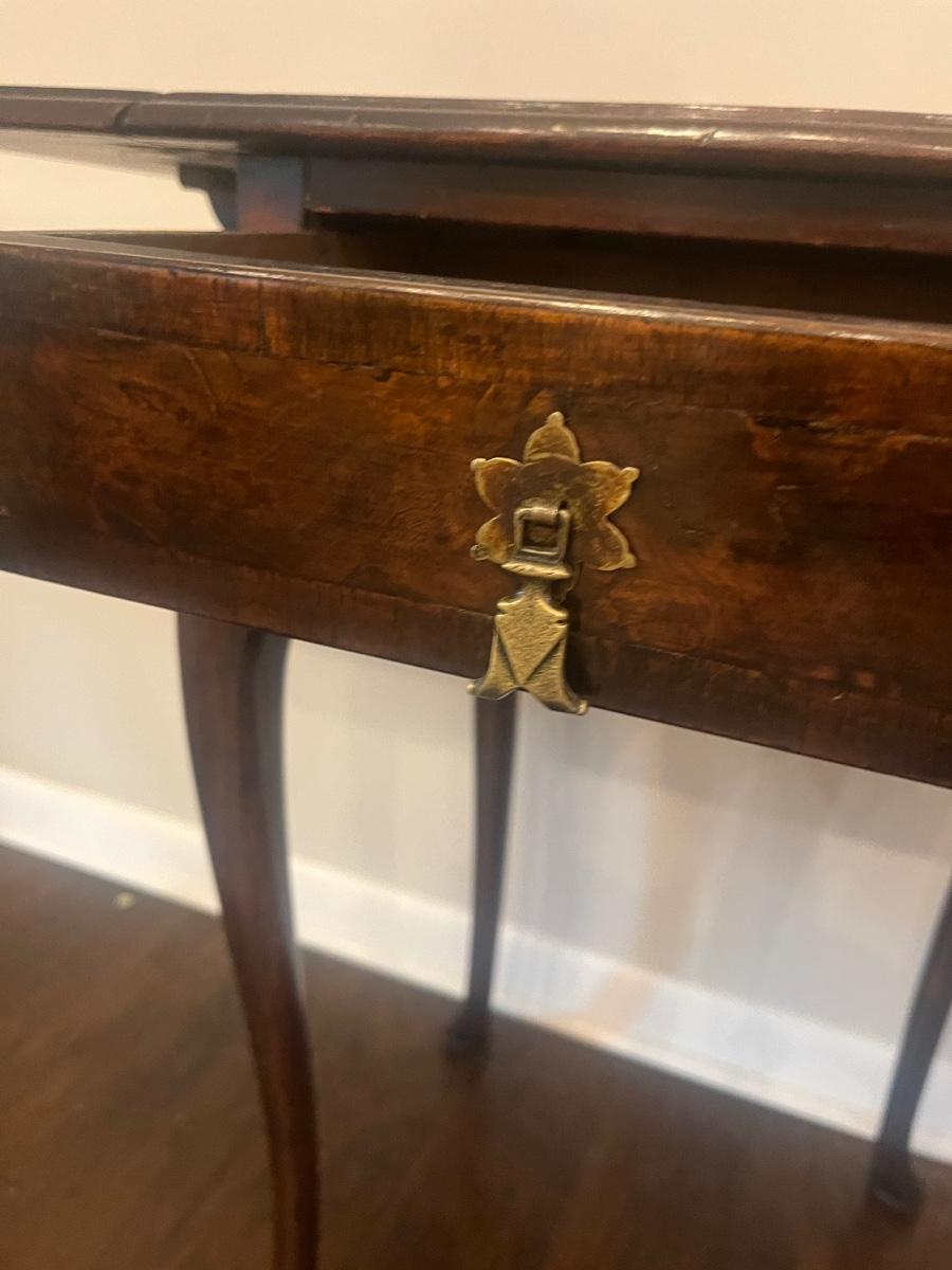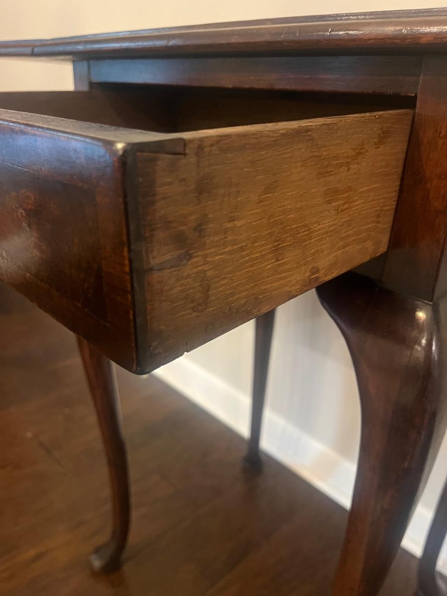 Lot includes an antique drop leaf side table with one dovetailed drawer. Table measures 15" x 19" x 29.5"H when leaves are down and 15" x 35.5" x 29.5"H when leaves are up. Top of table has one piece of veneer missing, see pictures.