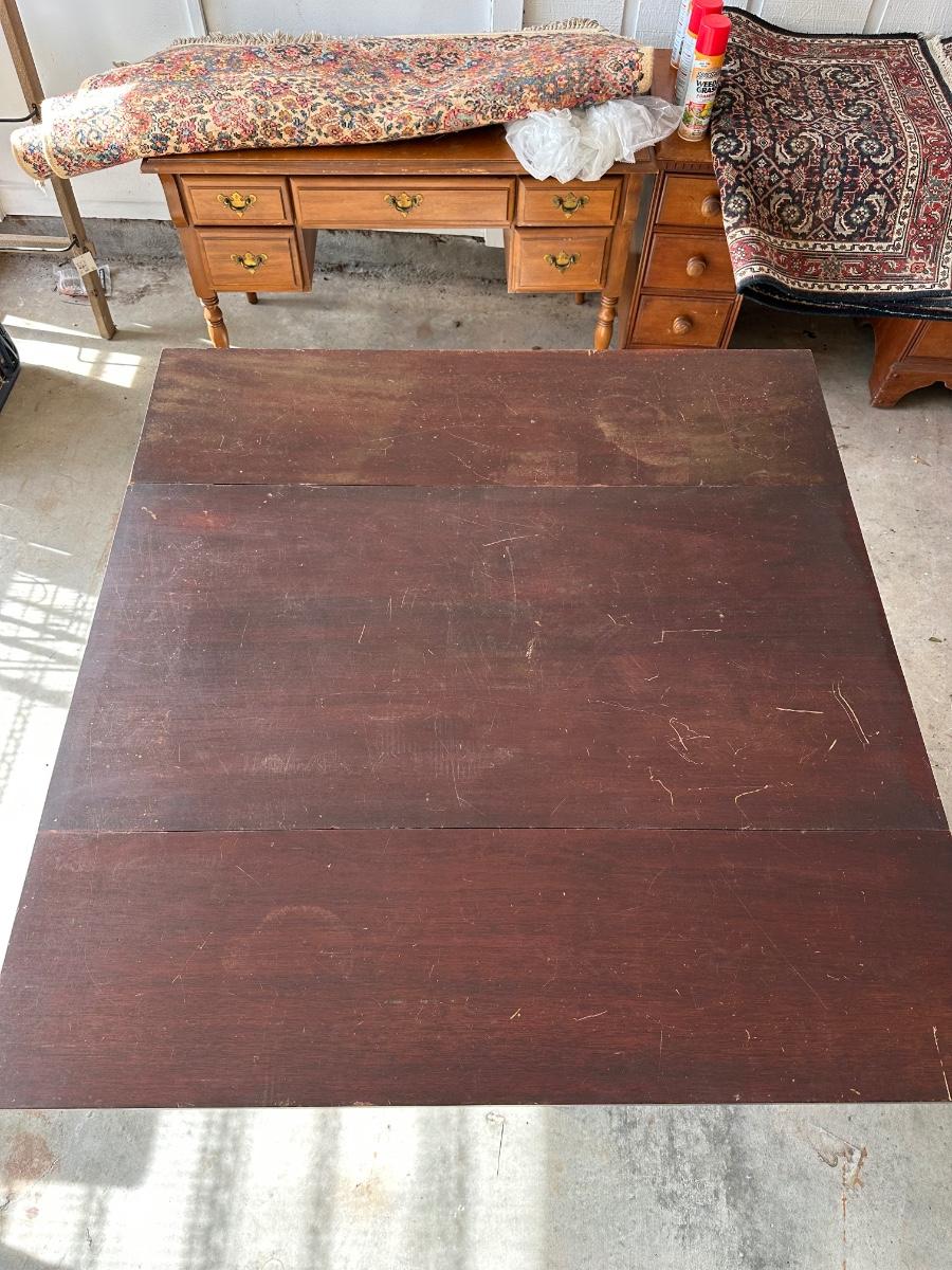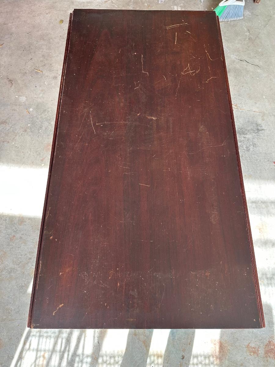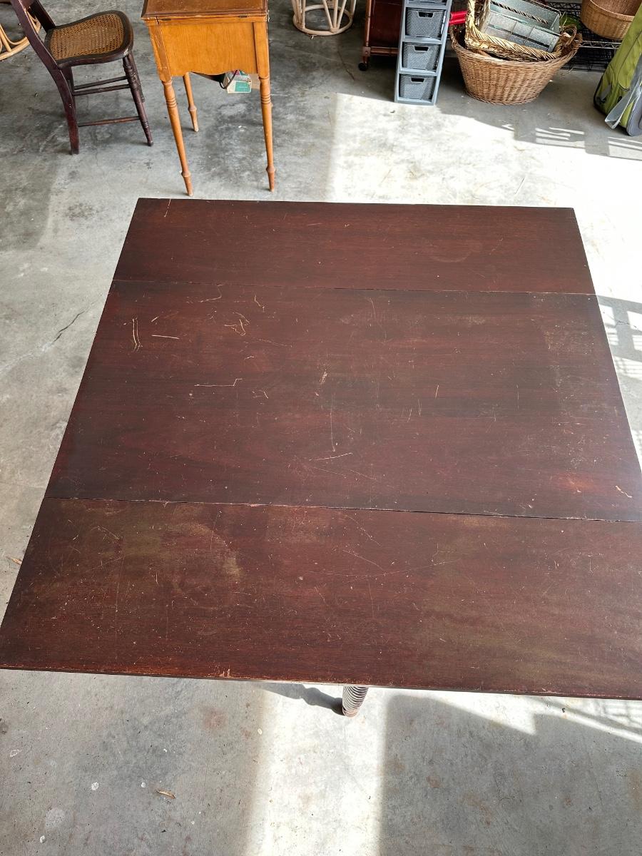 Surface scratches, finish wear, and patina from age and use. Hinges present; leaves operate. Legs need to be tightened/ clamped and wood glued.