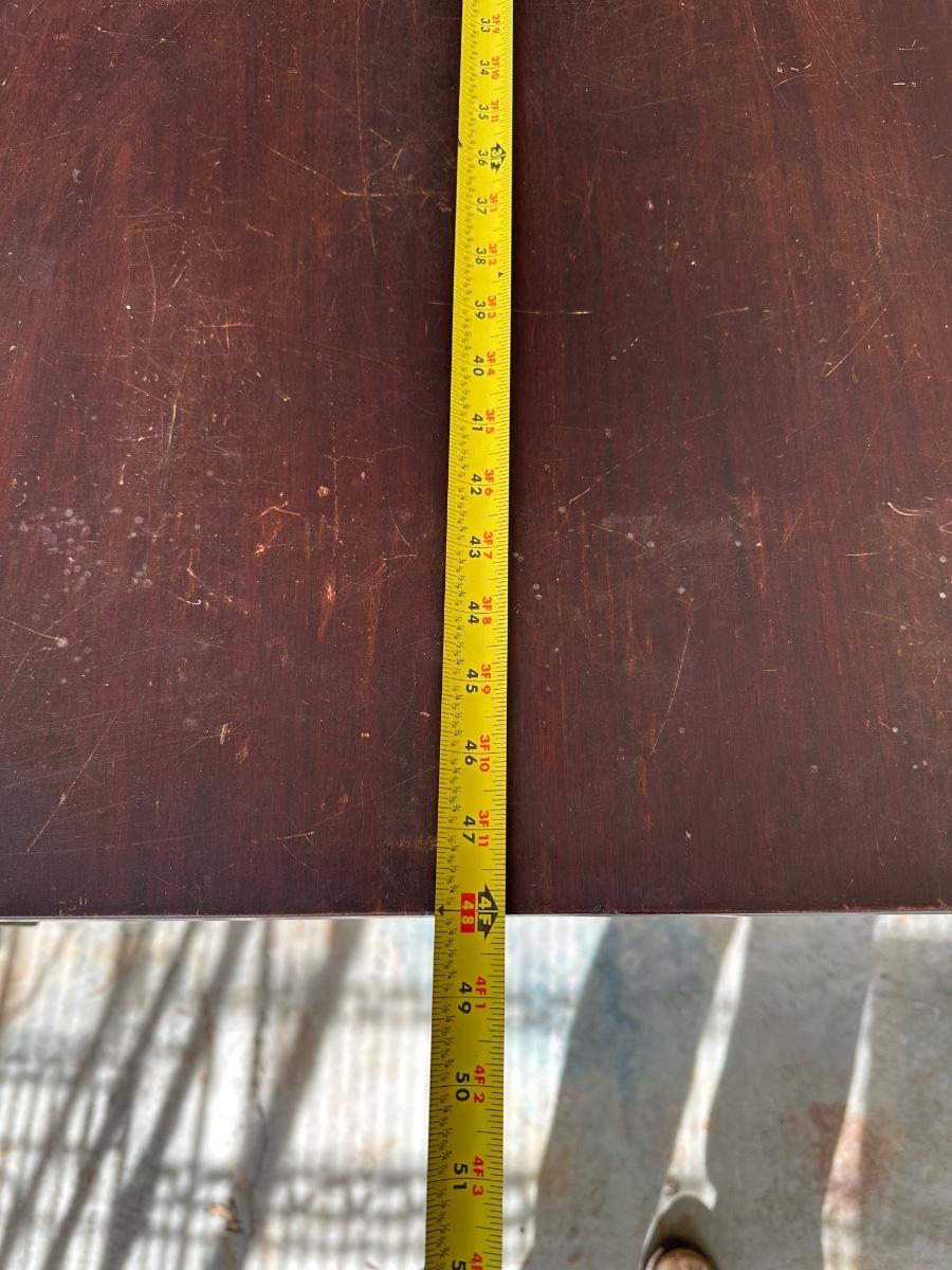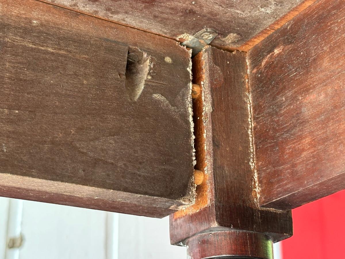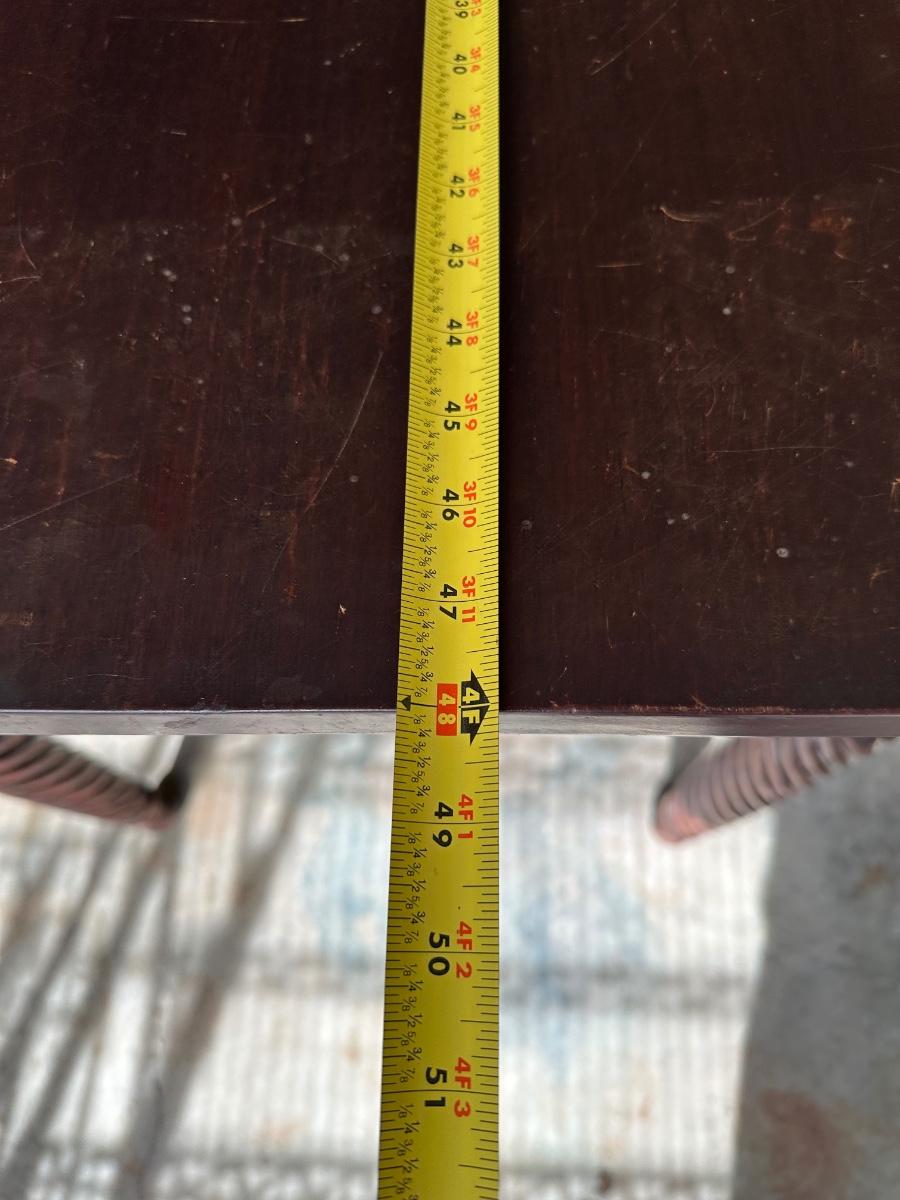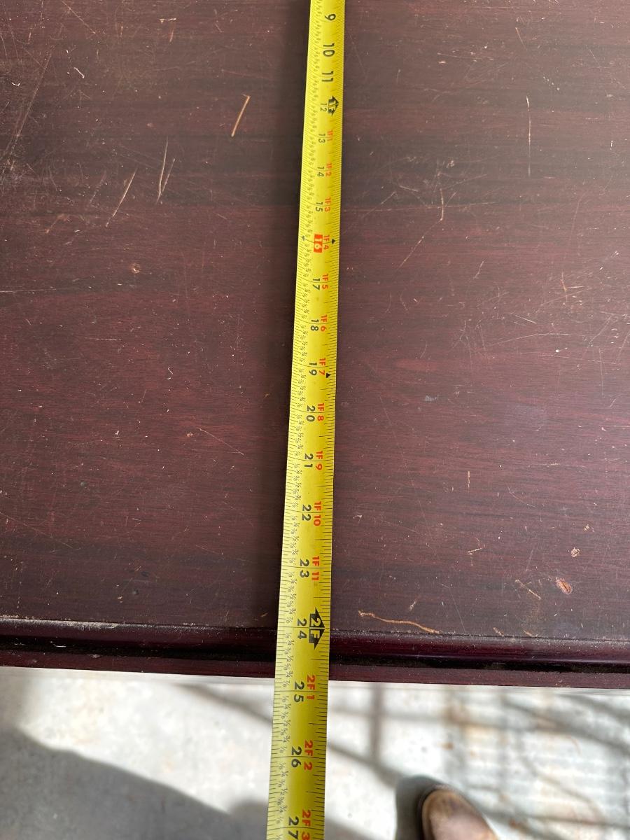 Surface scratches, finish wear, and patina from age and use. Hinges present; leaves operate. Legs need to be tightened/ clamped and wood glued.