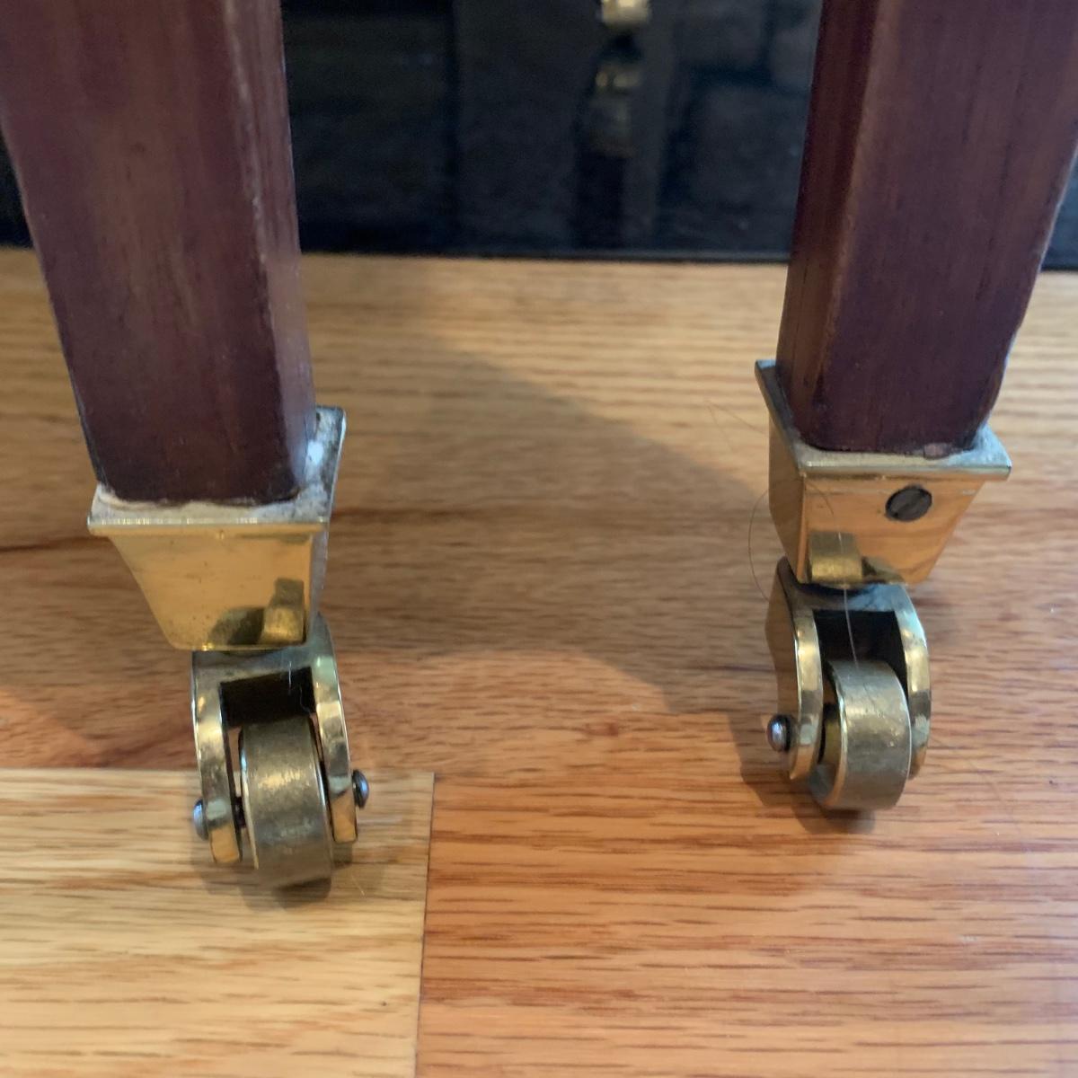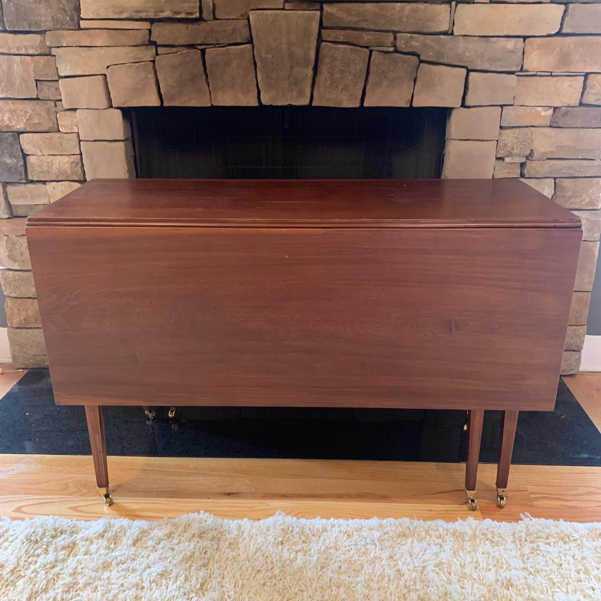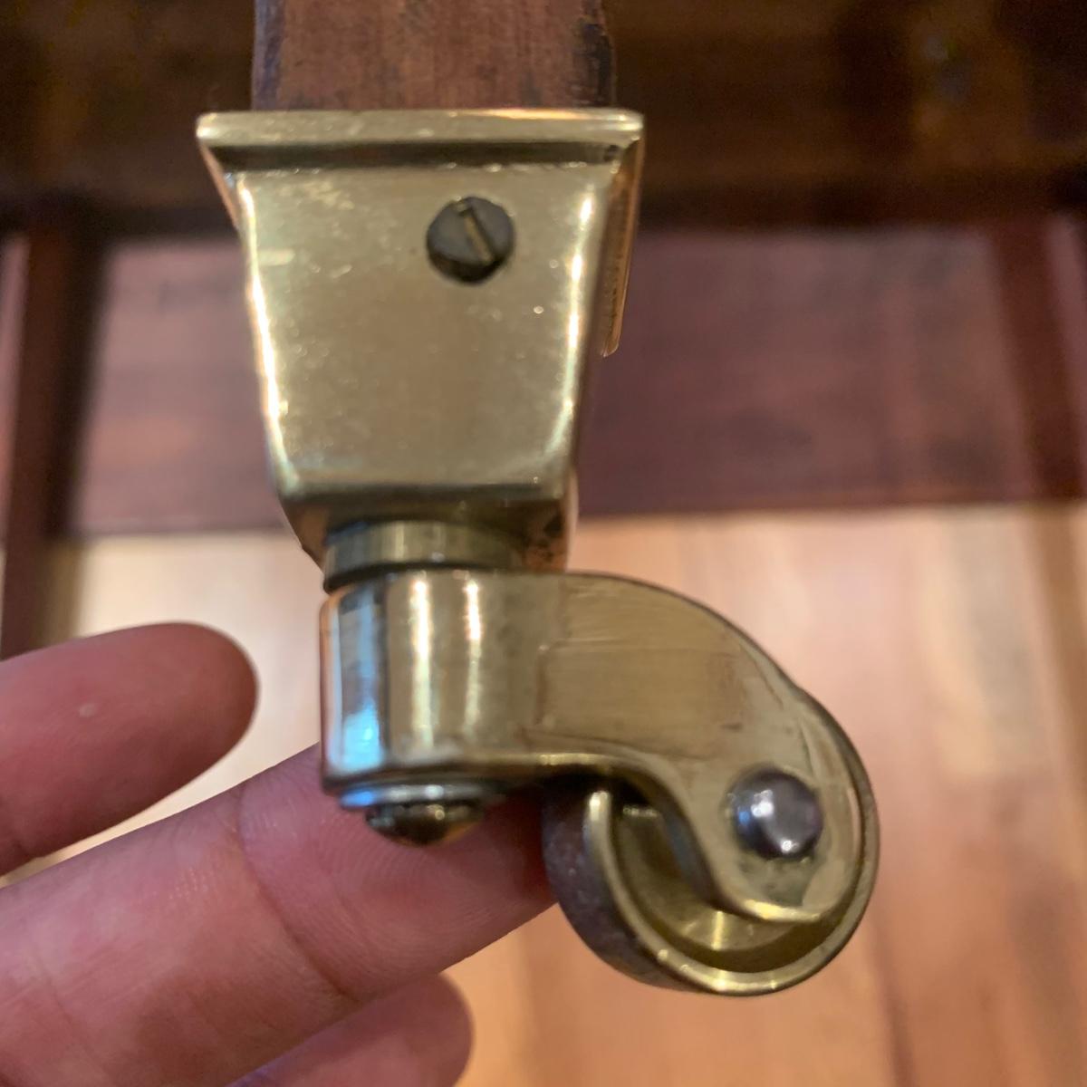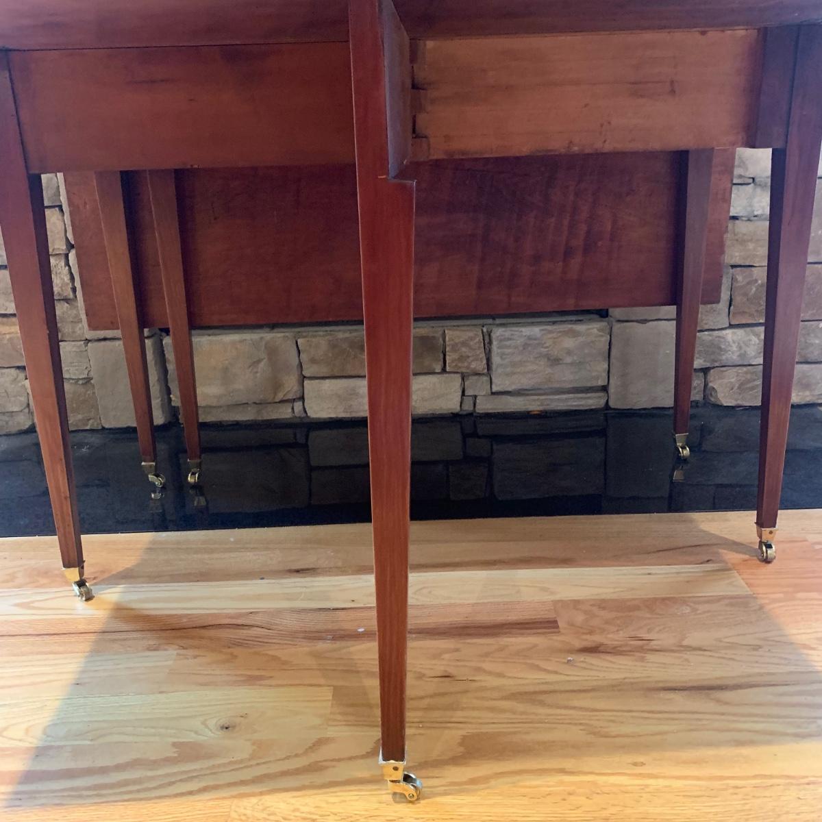 Antique drop leaf table with brass casters. This lovely table measures, 49”L x 44”W x 28.5”H with leaves open. And 44”L x 17.5”W 28.5”H with leaves closed. This table has blemishes and a few scratches but still appears to be in good condition. The casters roll well and leaves secure nicely when in use. This is a beautiful piece.