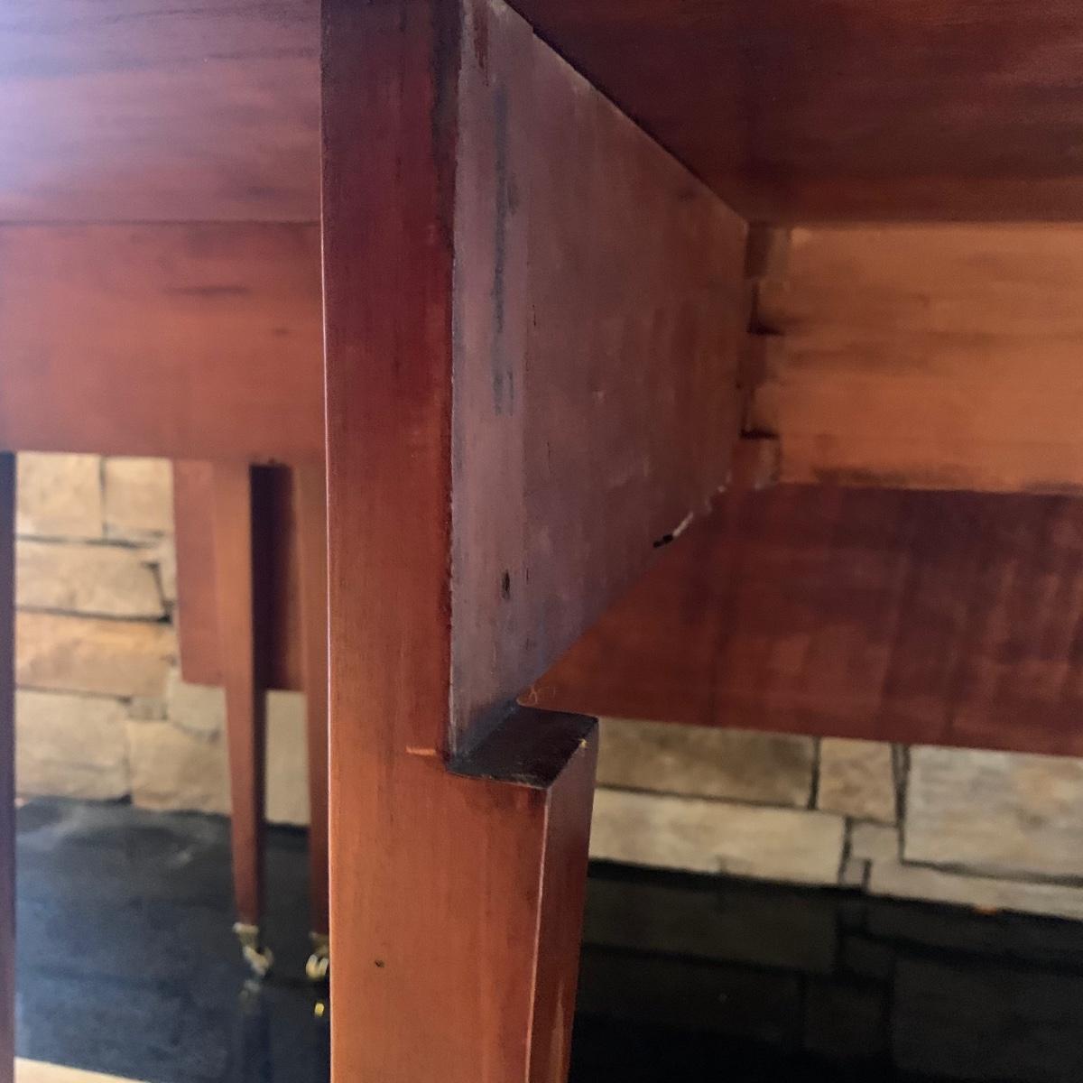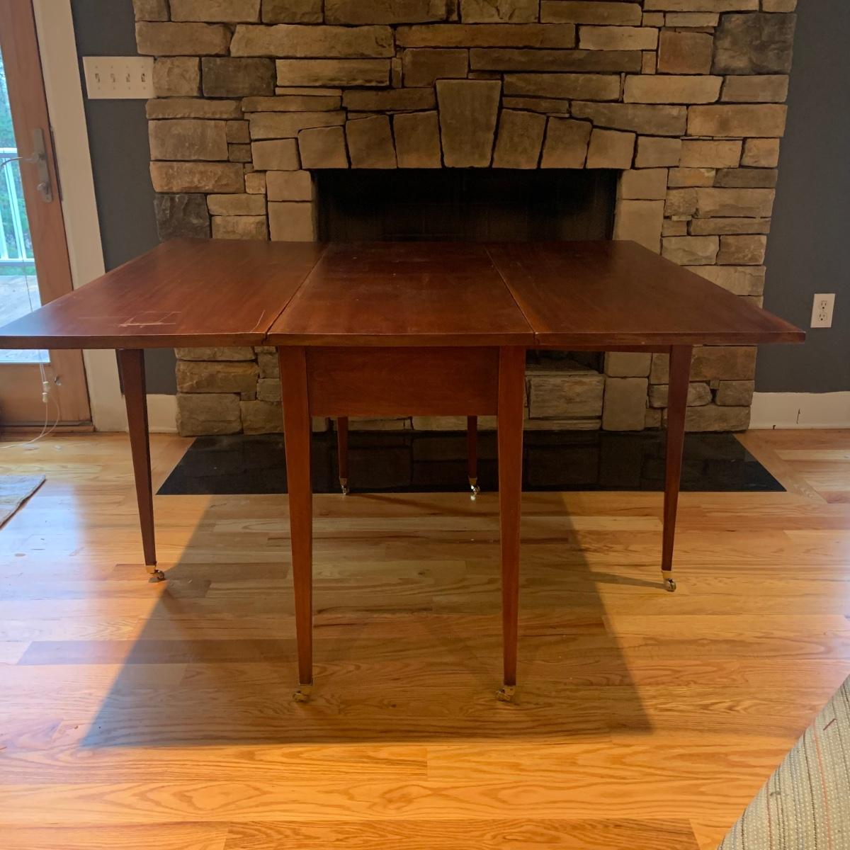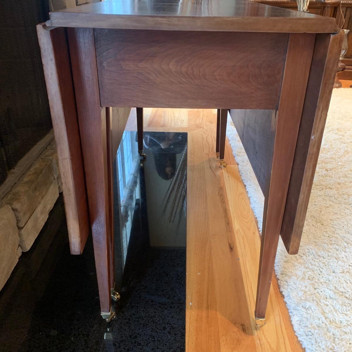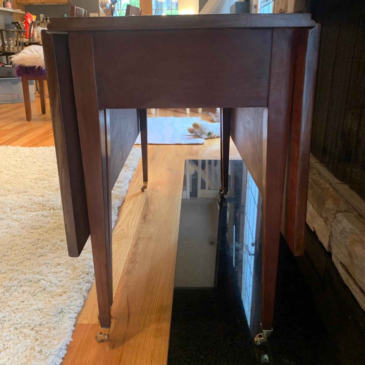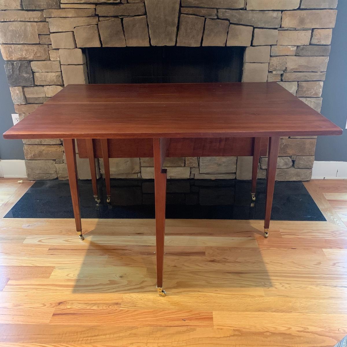 Antique drop leaf table with brass casters. This lovely table measures, 49”L x 44”W x 28.5”H with leaves open. And 44”L x 17.5”W 28.5”H with leaves closed. This table has blemishes and a few scratches but still appears to be in good condition. The casters roll well and leaves secure nicely when in use. This is a beautiful piece.