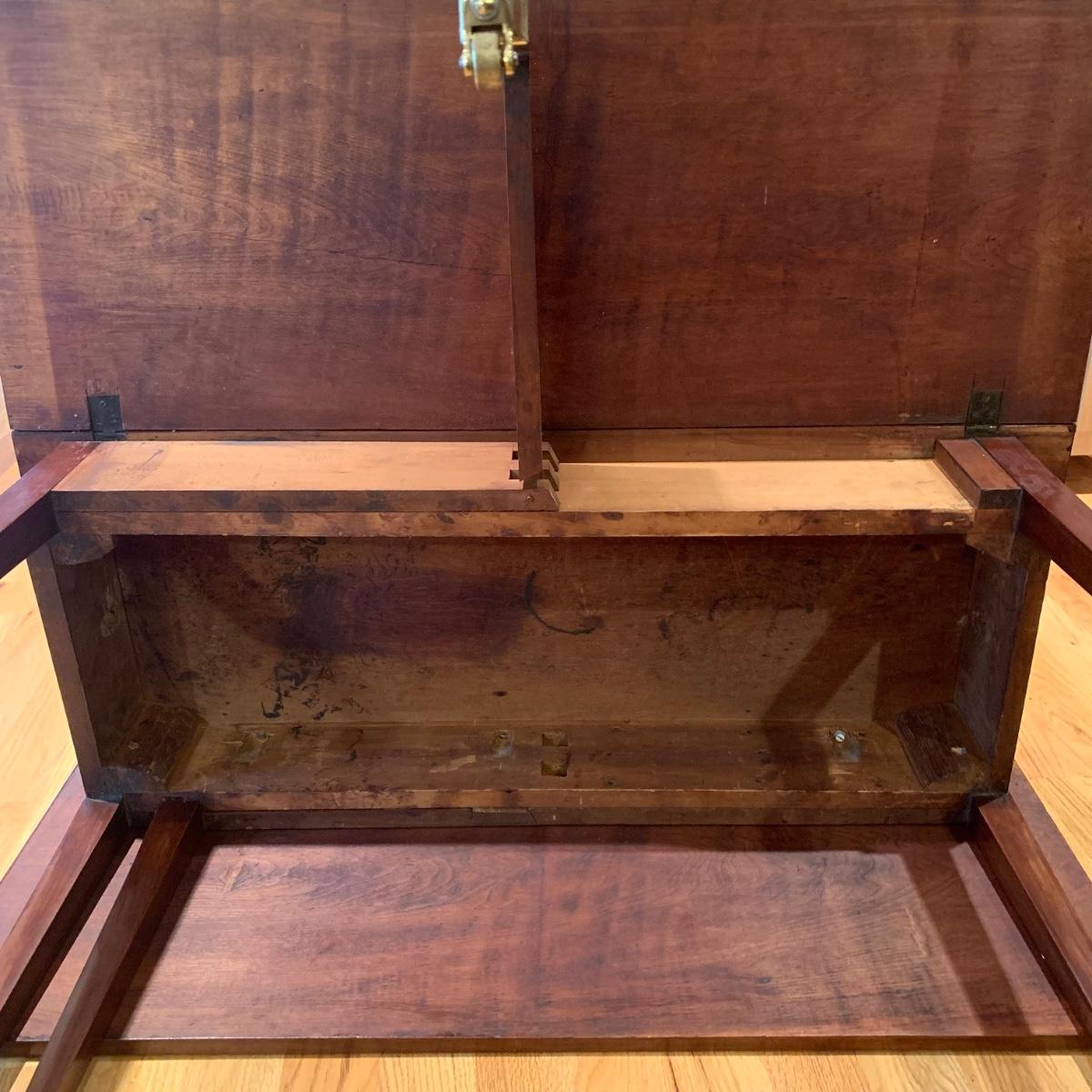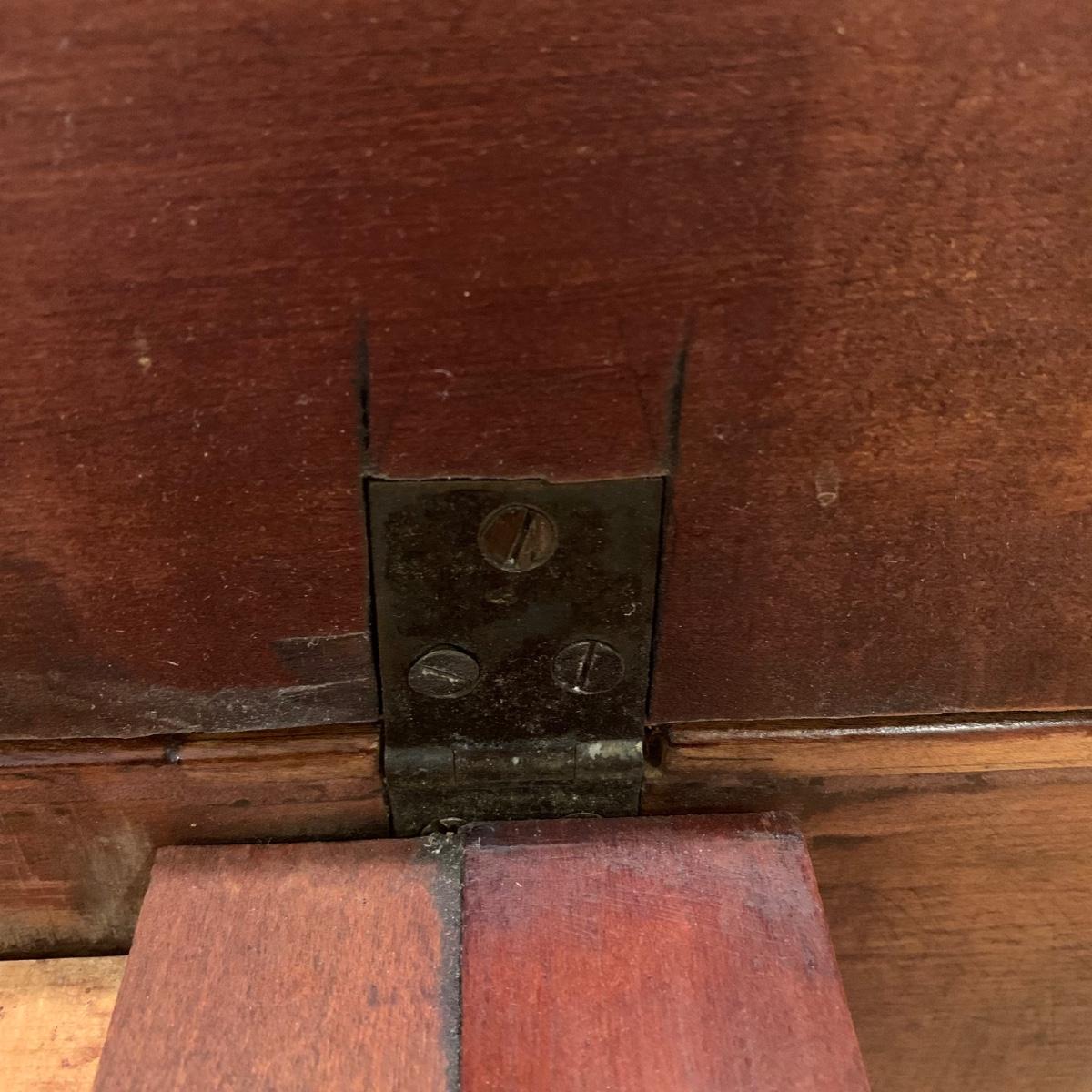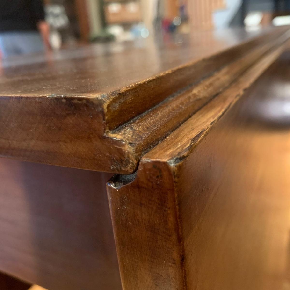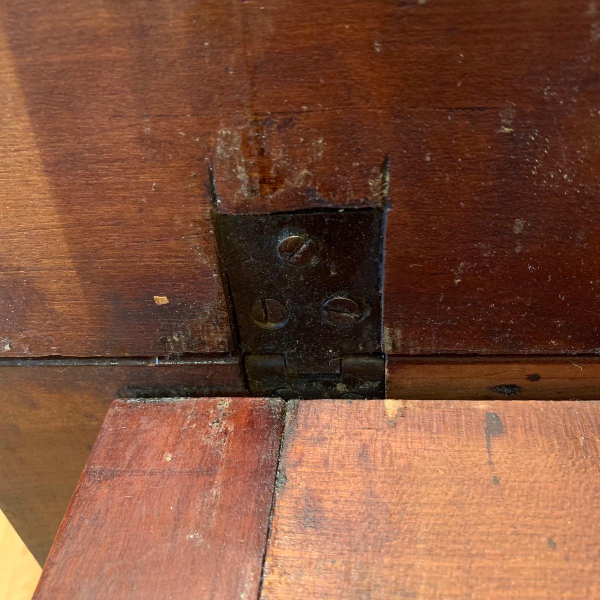 Antique drop leaf table with brass casters. This lovely table measures, 49”L x 44”W x 28.5”H with leaves open. And 44”L x 17.5”W 28.5”H with leaves closed. This table has blemishes and a few scratches but still appears to be in good condition. The casters roll well and leaves secure nicely when in use. This is a beautiful piece.