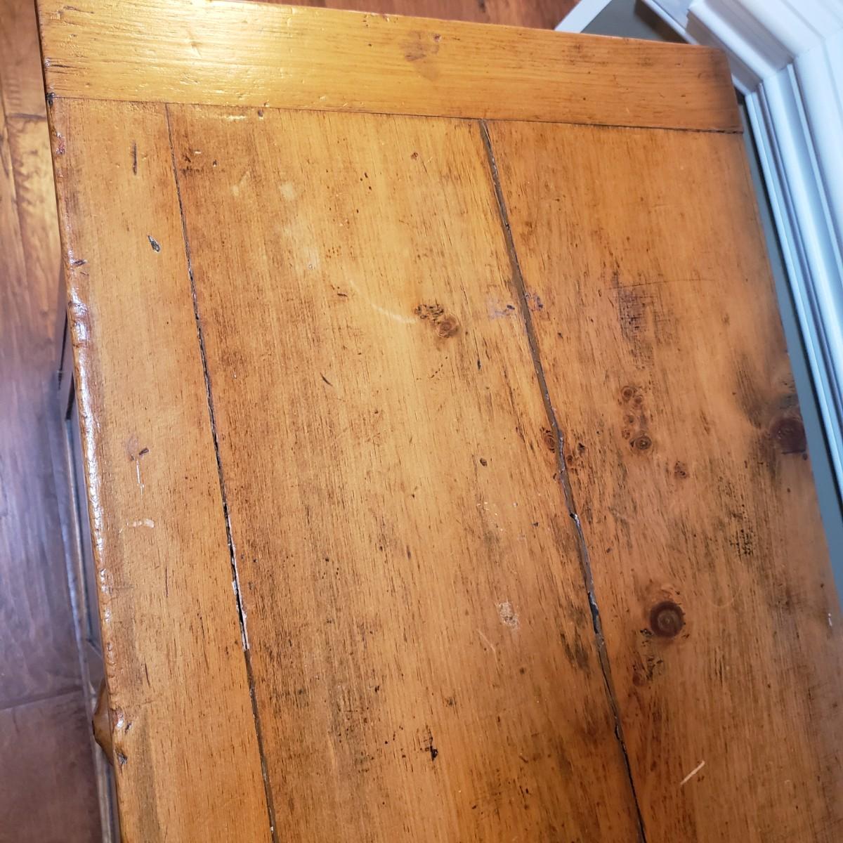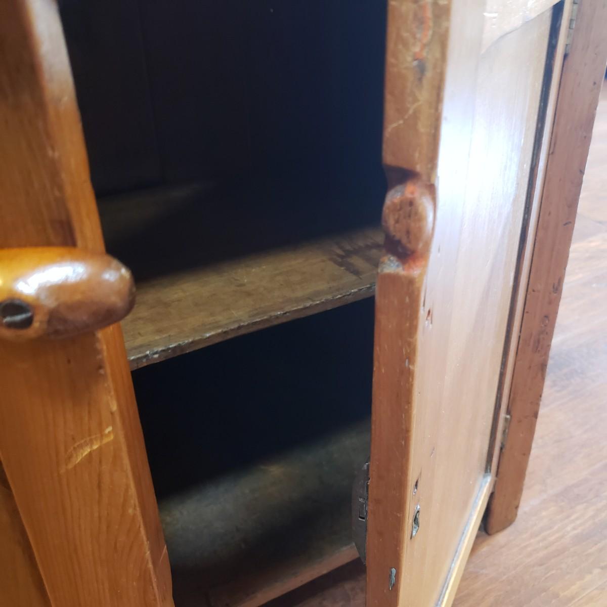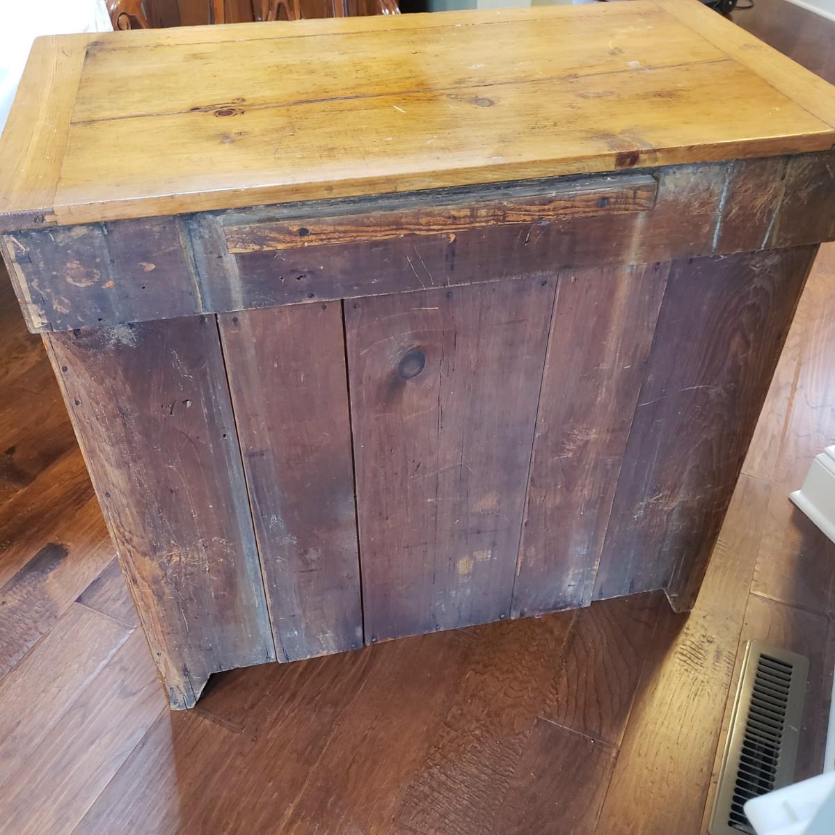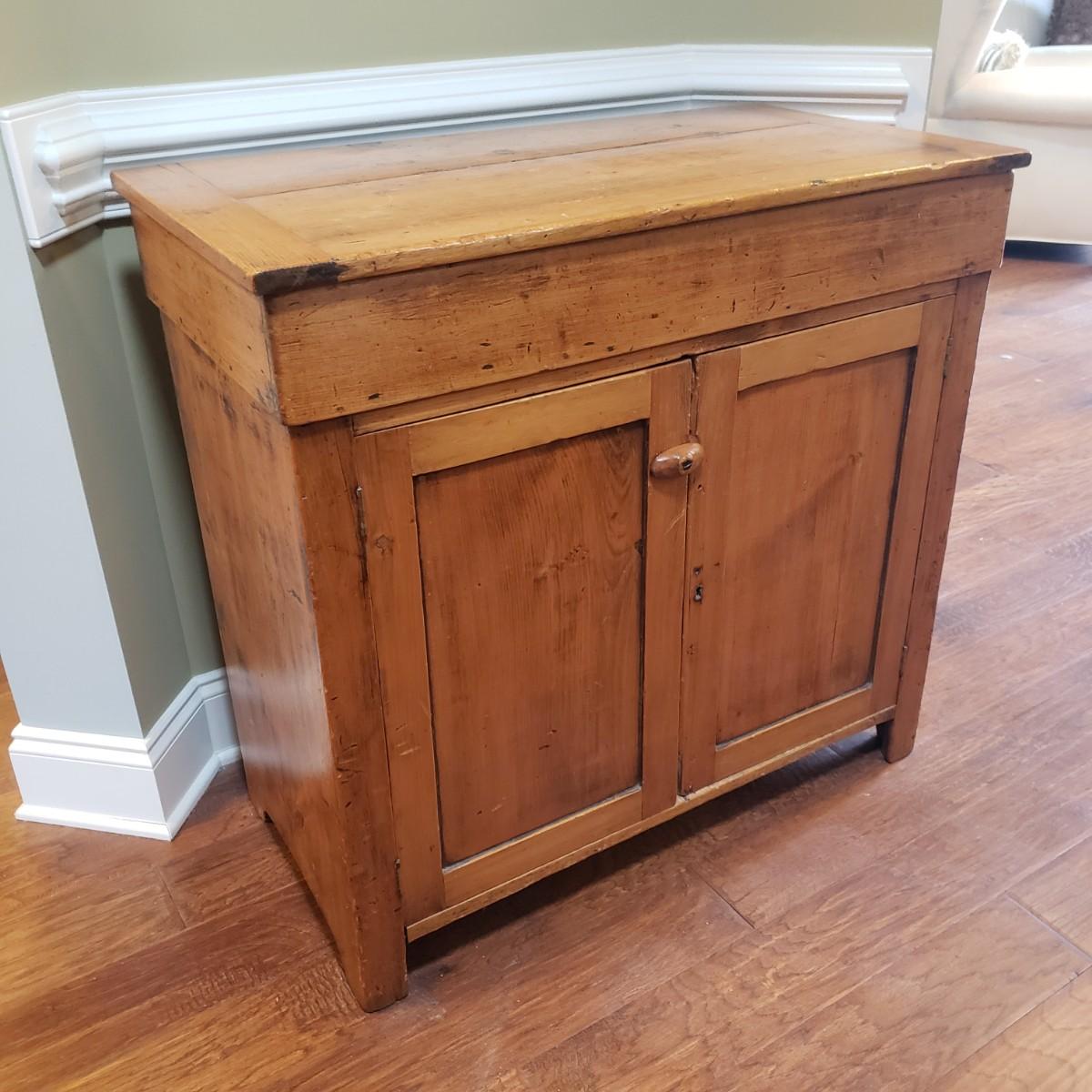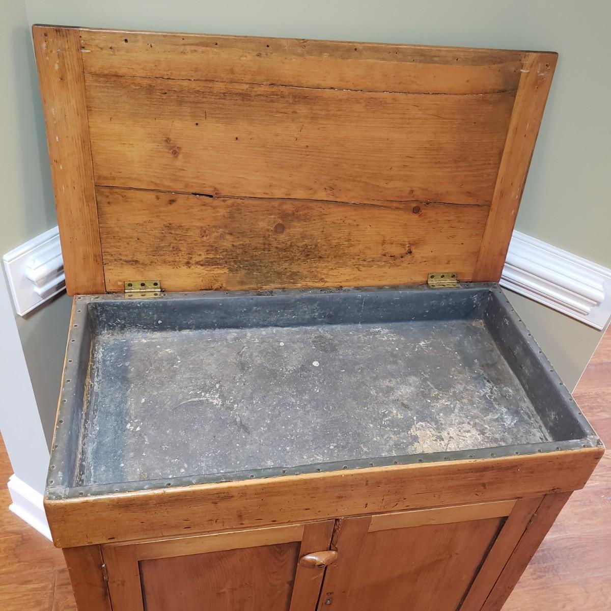 This rustic dry sink measures 34" x 18" x 33"H and appears to be antique. The top lifts up to access the metal dry sink. Under the sink is a wooden handle cupboard. There is a keyhole and lock, but there is no key. The cupboard shelves have wear from age, see pictures. There is cracks across the top, yet appears solid. This item is located on the ground floor. There are two exits from this level, each with 4 steps down leading to driveway. Local pickup only. Winning bidder must bring assistance to help move and load this item due to its weight and/or size.