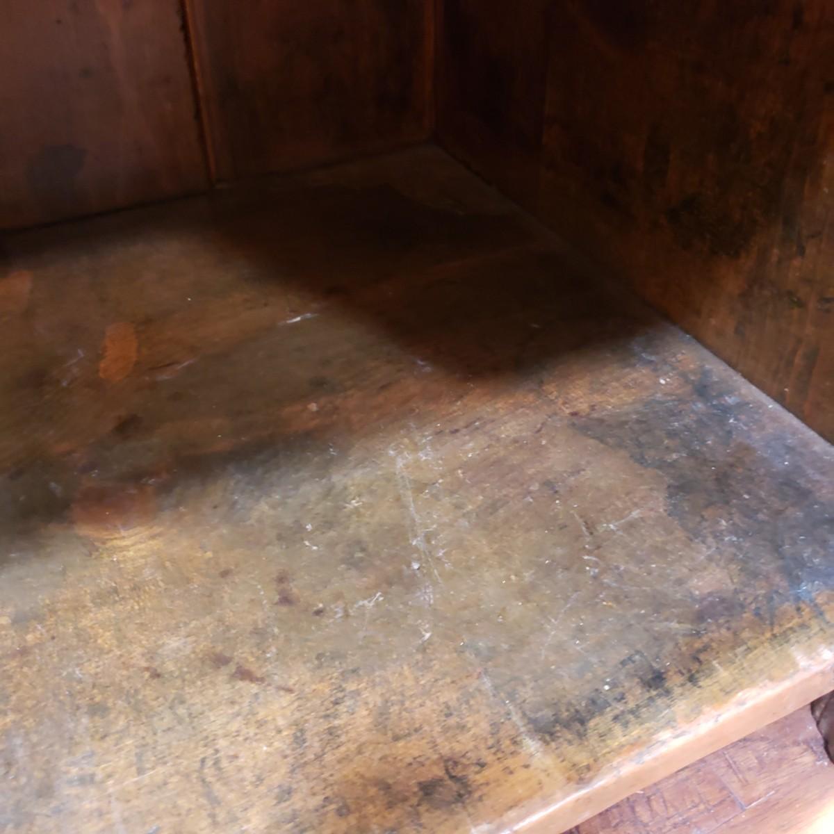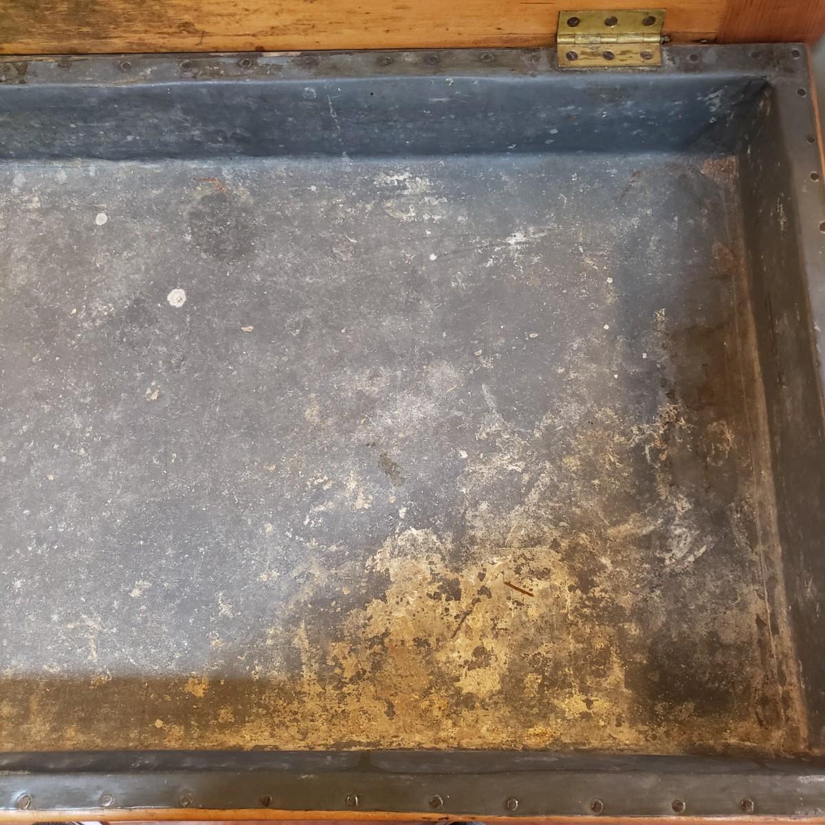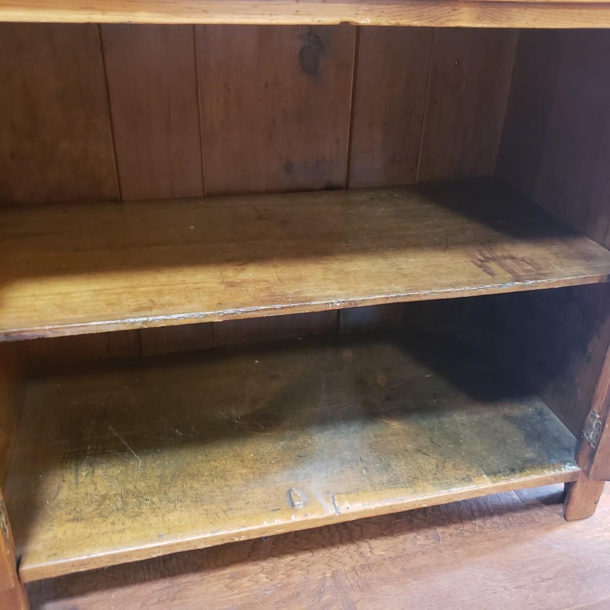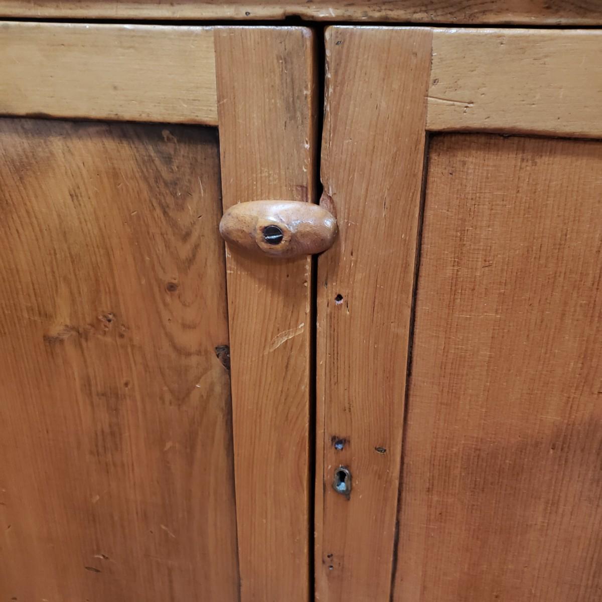 This rustic dry sink measures 34" x 18" x 33"H and appears to be antique. The top lifts up to access the metal dry sink. Under the sink is a wooden handle cupboard. There is a keyhole and lock, but there is no key. The cupboard shelves have wear from age, see pictures. There is cracks across the top, yet appears solid. This item is located on the ground floor. There are two exits from this level, each with 4 steps down leading to driveway. Local pickup only. Winning bidder must bring assistance to help move and load this item due to its weight and/or size.