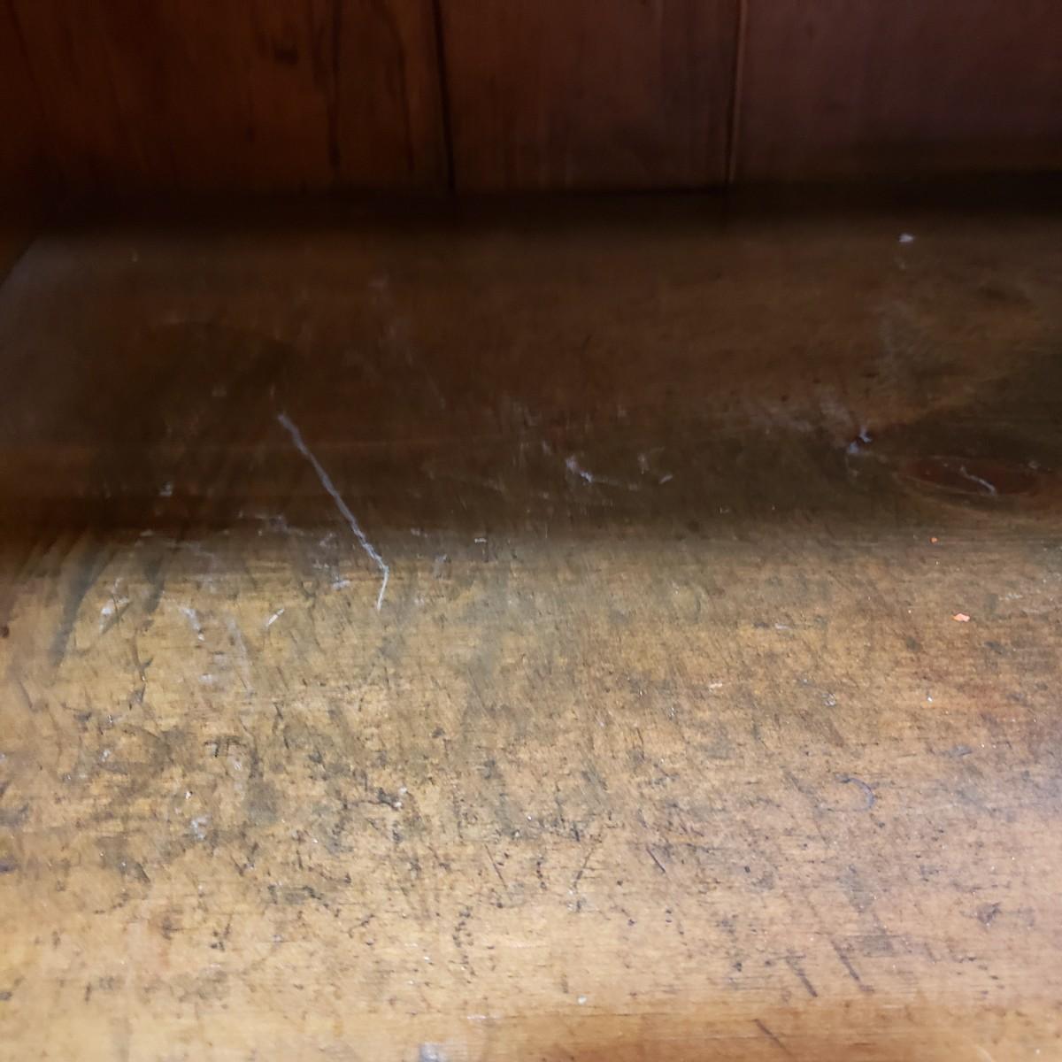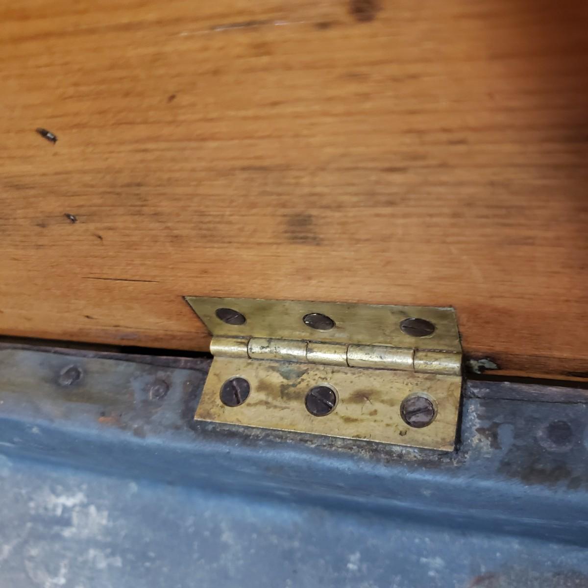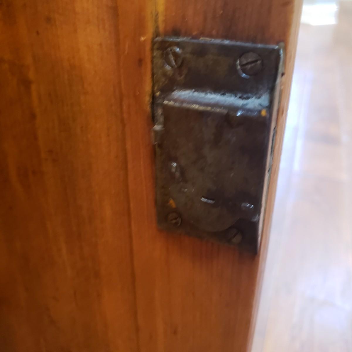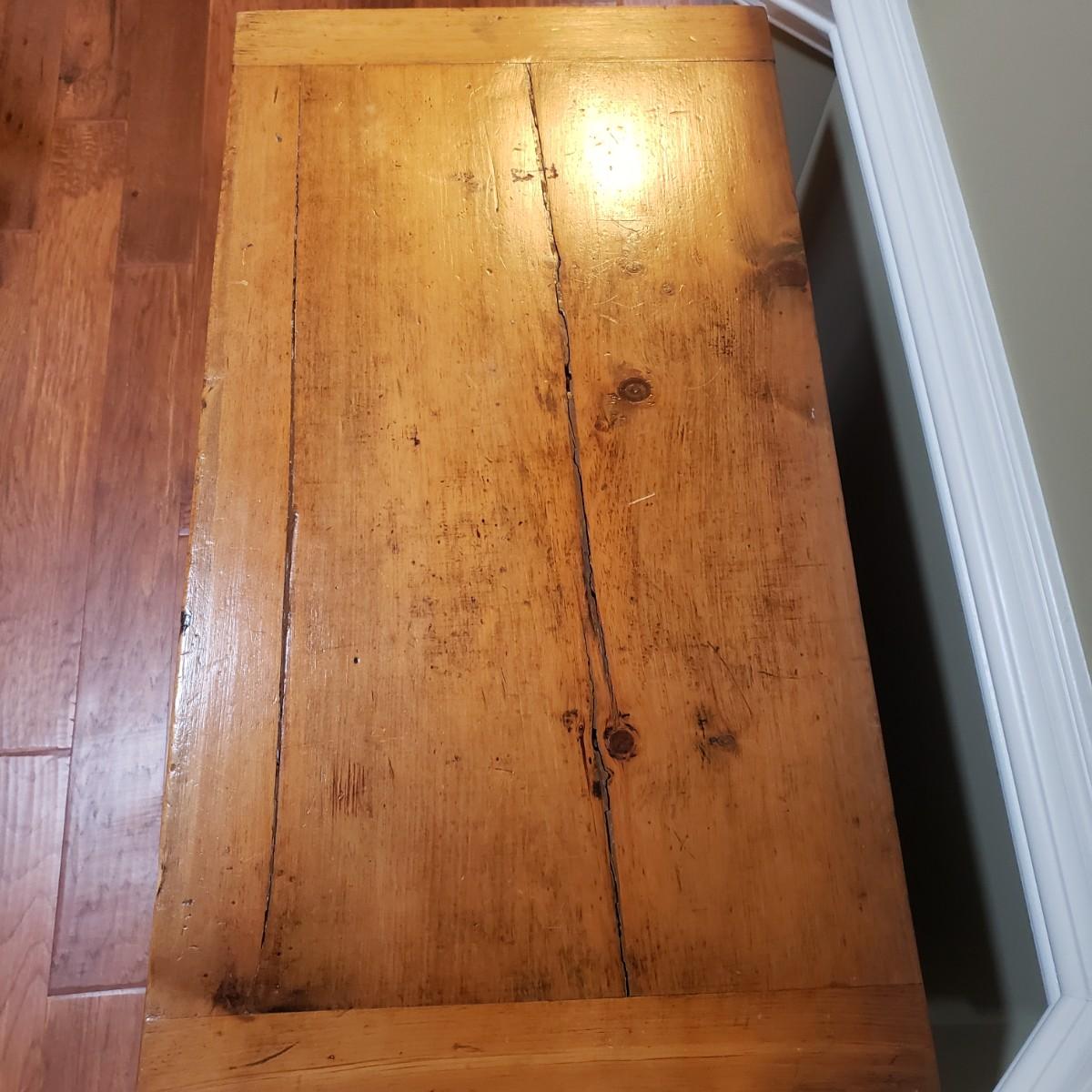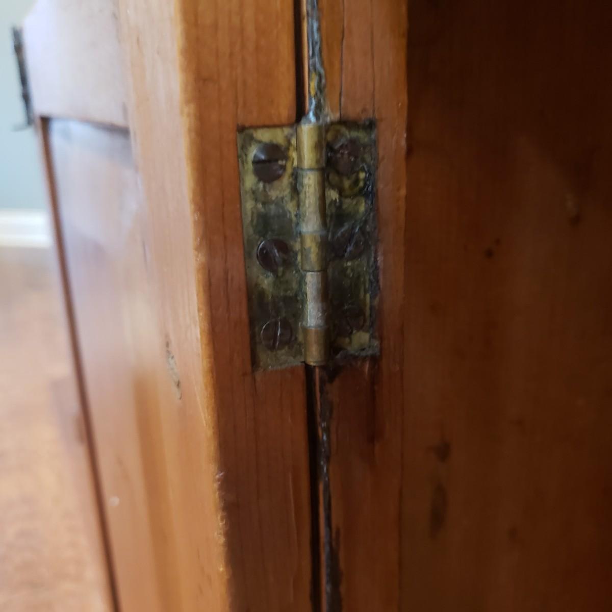 This rustic dry sink measures 34" x 18" x 33"H and appears to be antique. The top lifts up to access the metal dry sink. Under the sink is a wooden handle cupboard. There is a keyhole and lock, but there is no key. The cupboard shelves have wear from age, see pictures. There is cracks across the top, yet appears solid. This item is located on the ground floor. There are two exits from this level, each with 4 steps down leading to driveway. Local pickup only. Winning bidder must bring assistance to help move and load this item due to its weight and/or size.