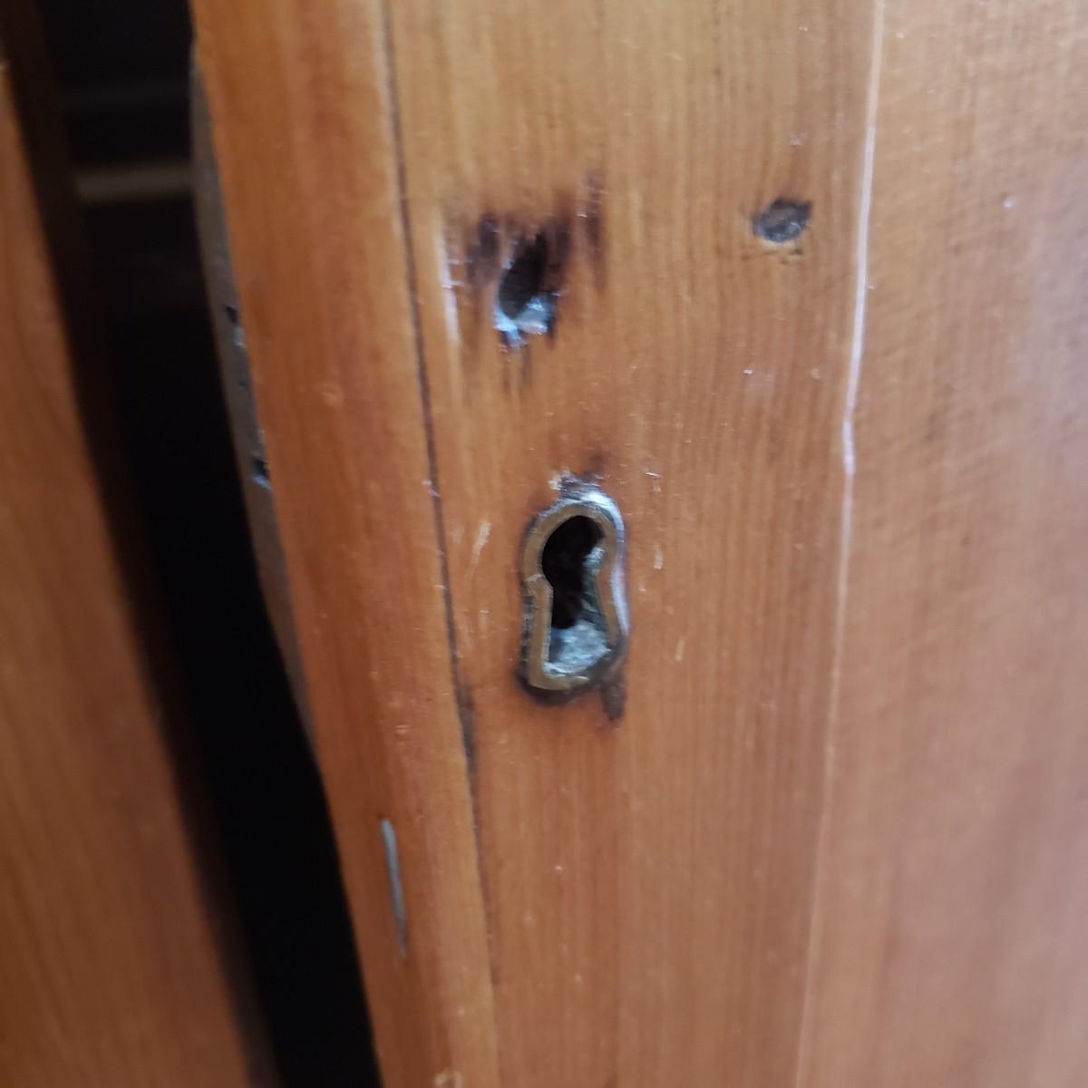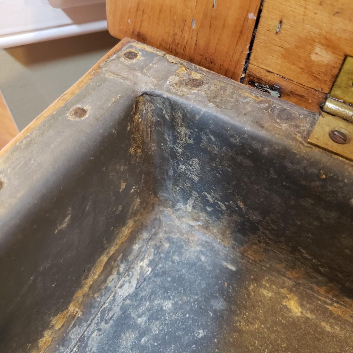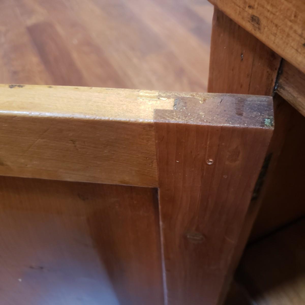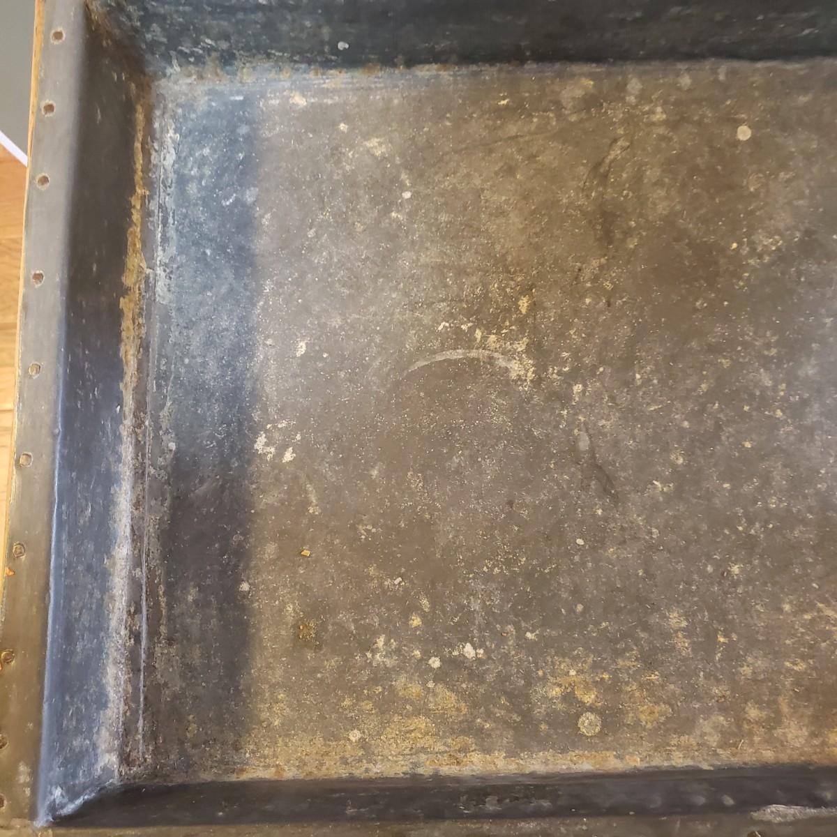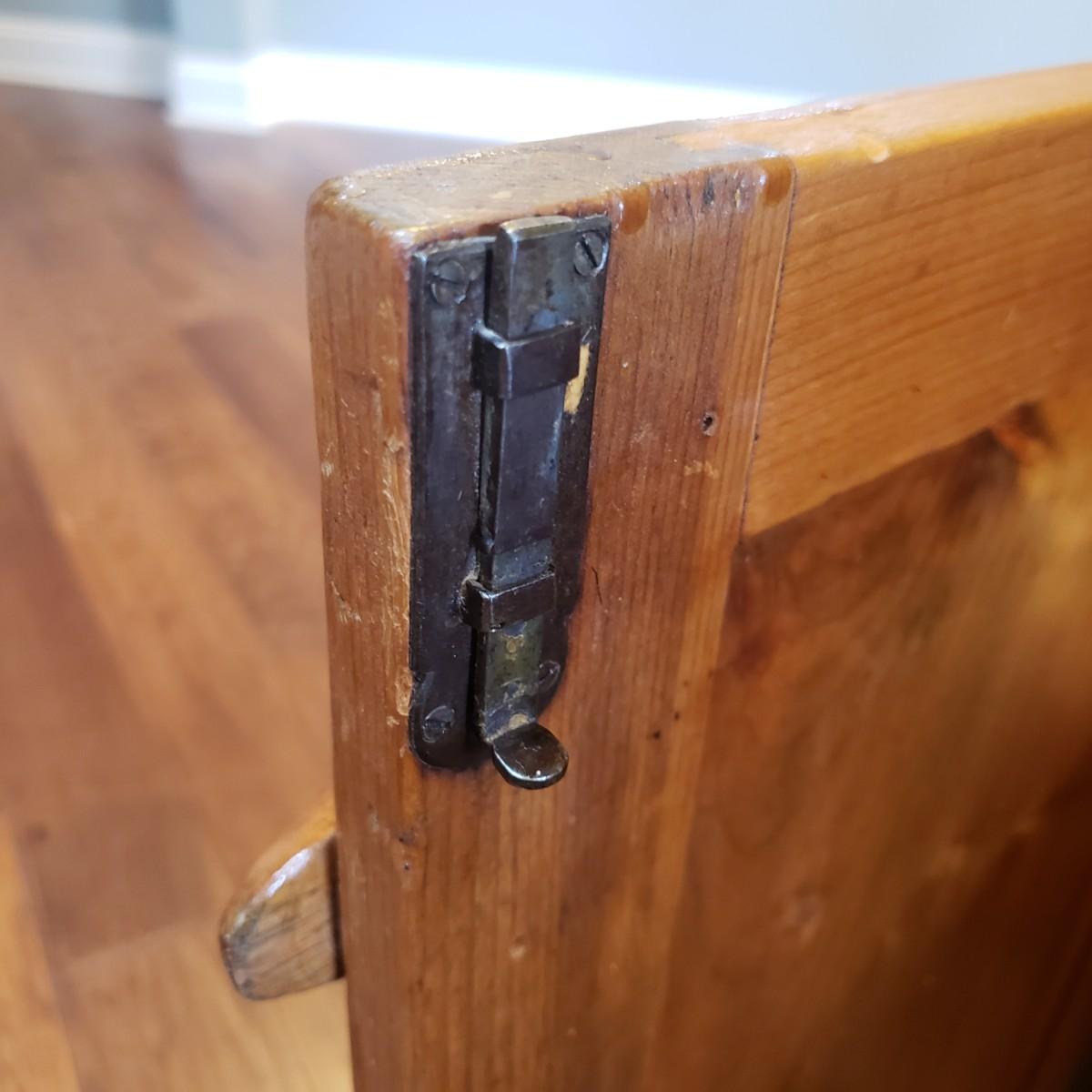 This rustic dry sink measures 34" x 18" x 33"H and appears to be antique. The top lifts up to access the metal dry sink. Under the sink is a wooden handle cupboard. There is a keyhole and lock, but there is no key. The cupboard shelves have wear from age, see pictures. There is cracks across the top, yet appears solid. This item is located on the ground floor. There are two exits from this level, each with 4 steps down leading to driveway. Local pickup only. Winning bidder must bring assistance to help move and load this item due to its weight and/or size.