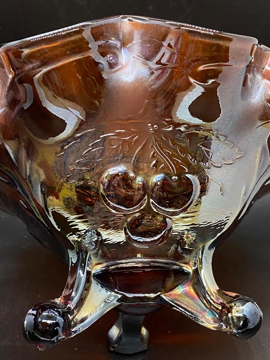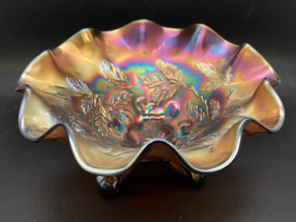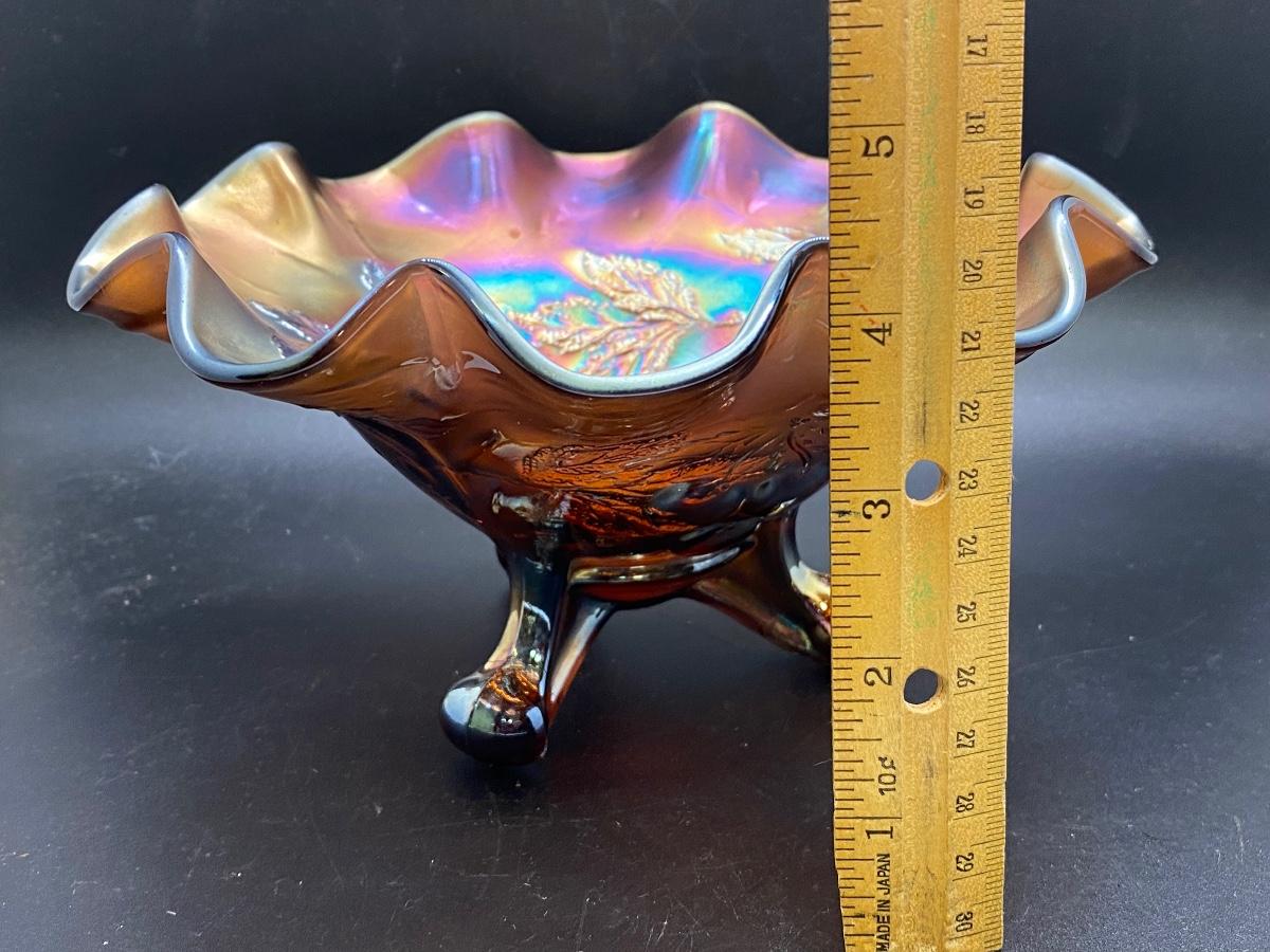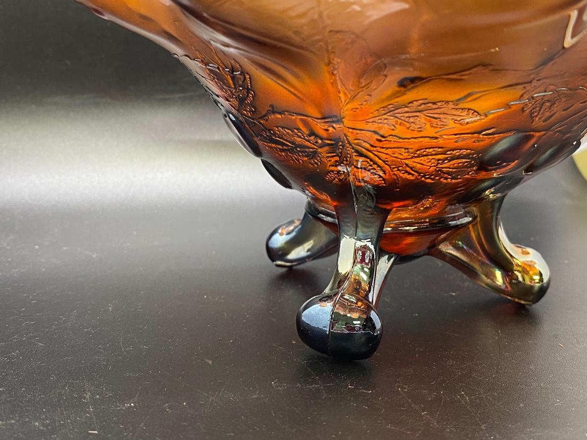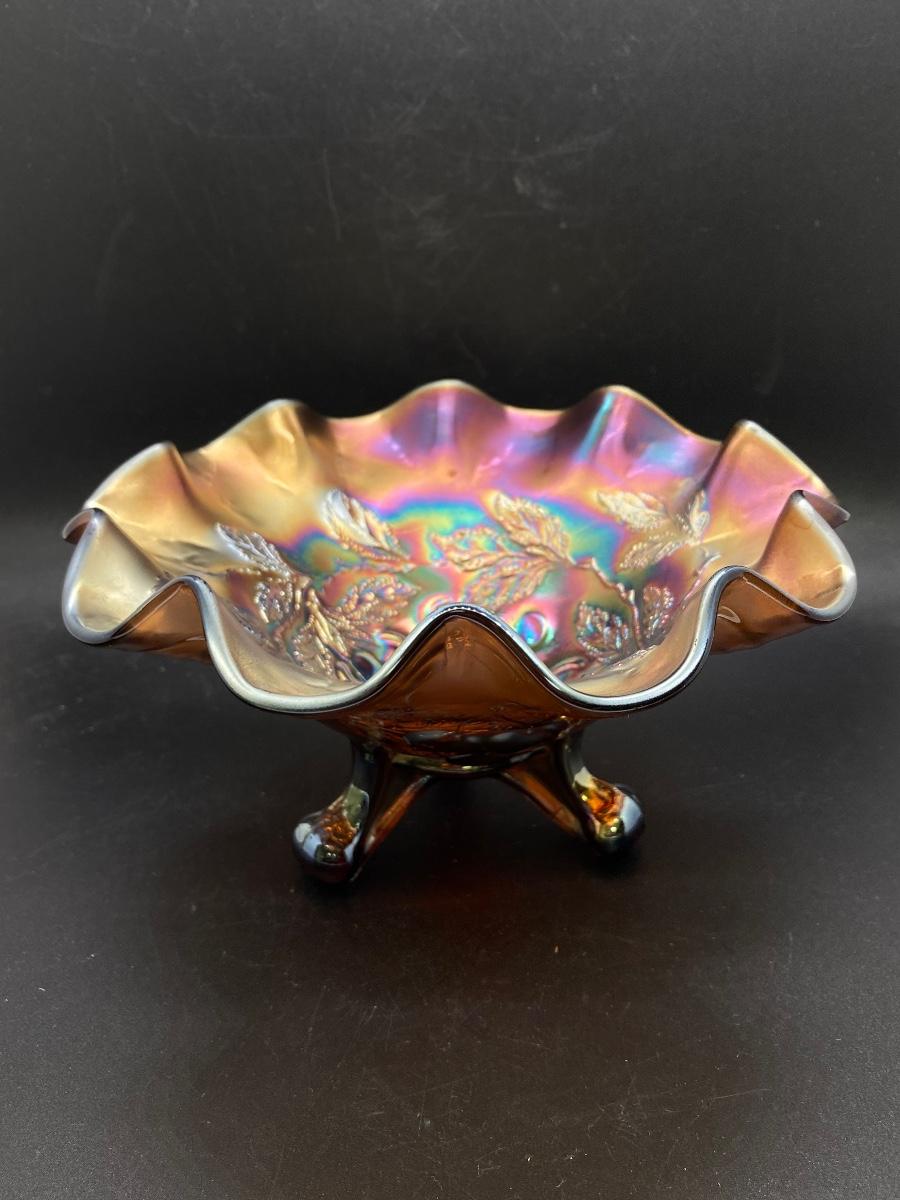 Antique Dugan Marigold Amber Carnival Glass Ruffled Cherries Bowl