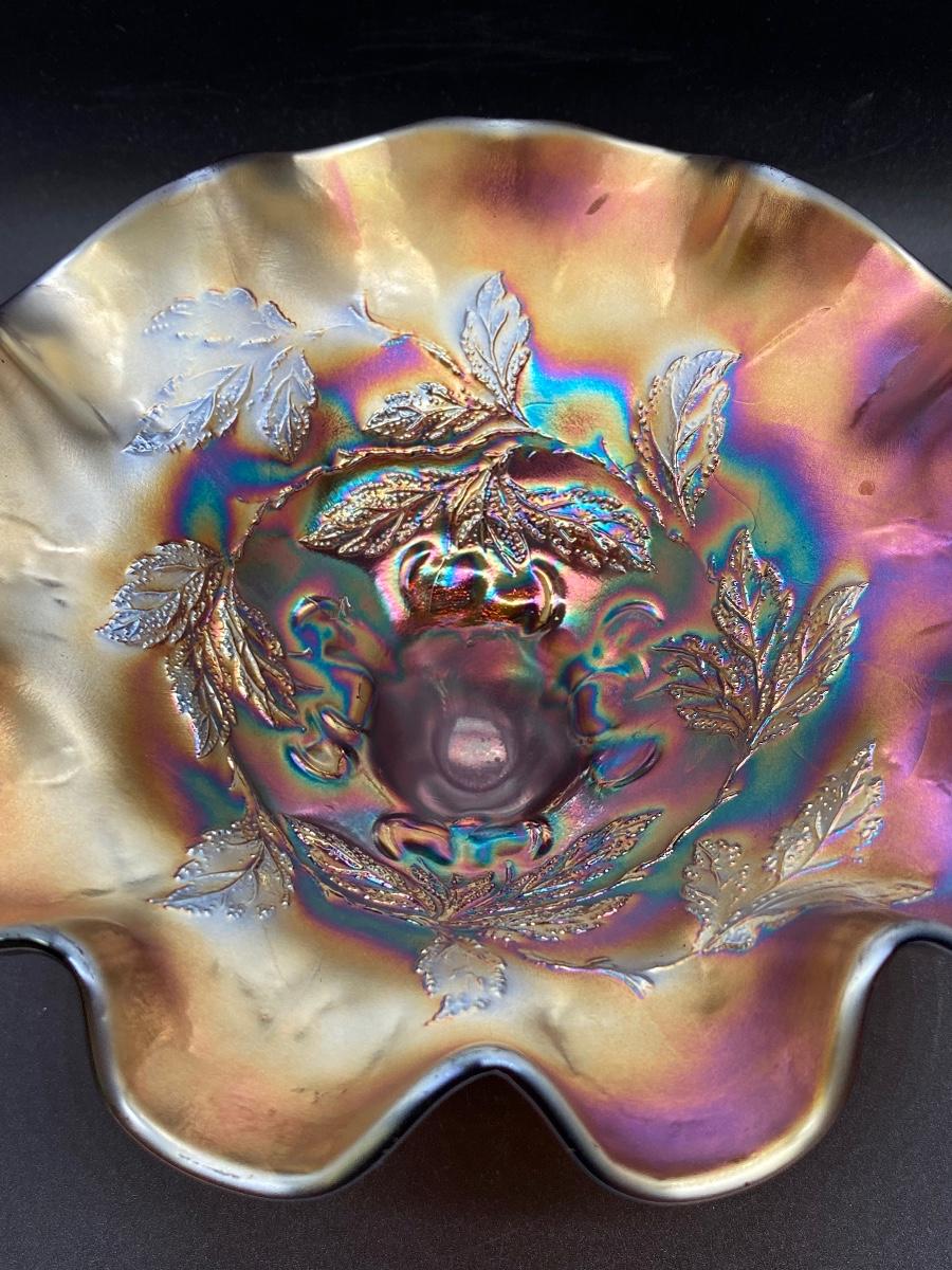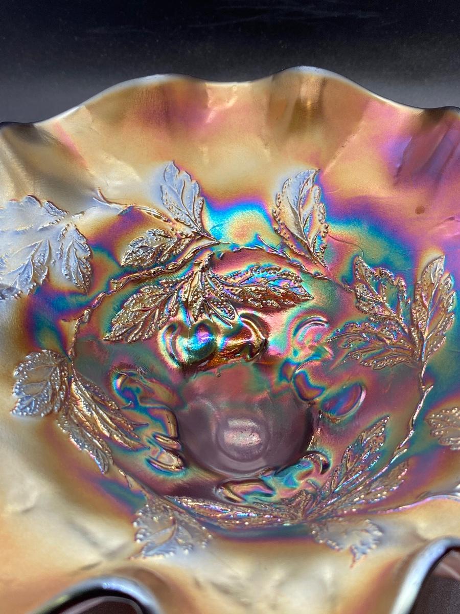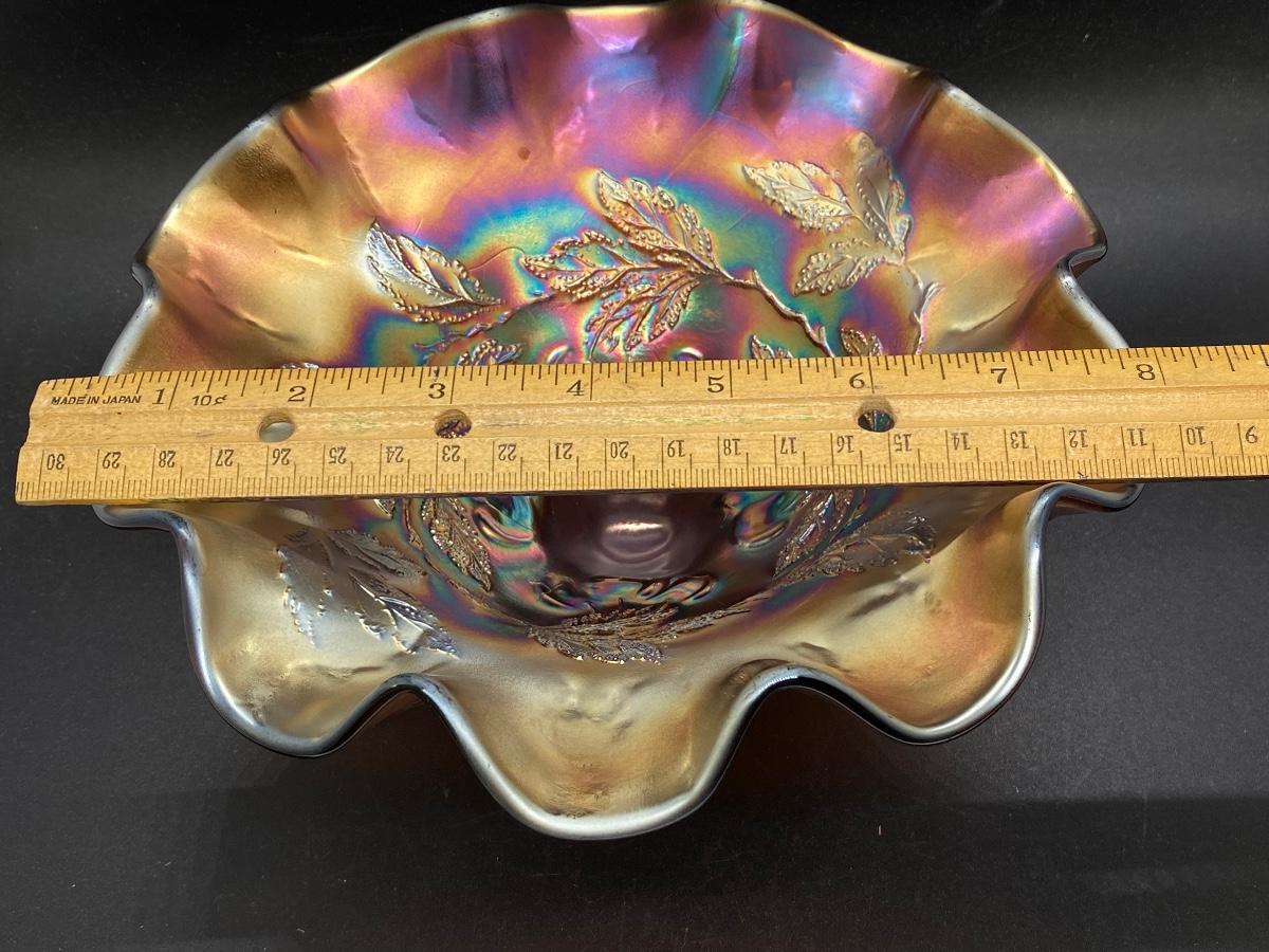 Beautiful marigold carnival glass ruffled bowl from Dugan Glass. Cherries pattern. Footed bowl is about 8" across. Good condition, no chips.