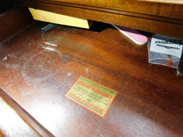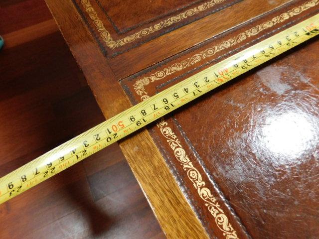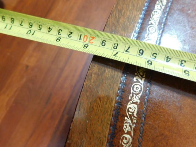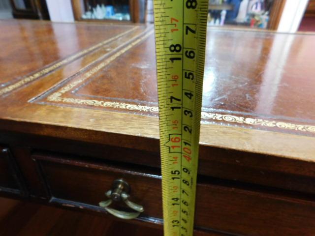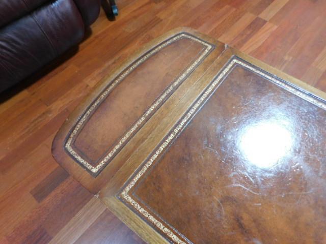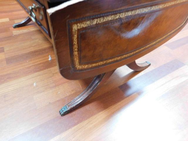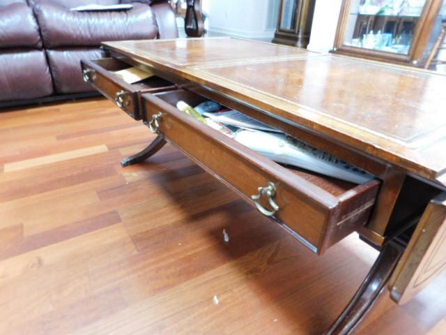 Antique Duncan Phyfe Mahogany Leather Top Double Drawer Drop Leaf Coffee Table expect some wear or scratches to the finish. One stretcher arm is broken underneath table and one leaf corner is chipped as shown.