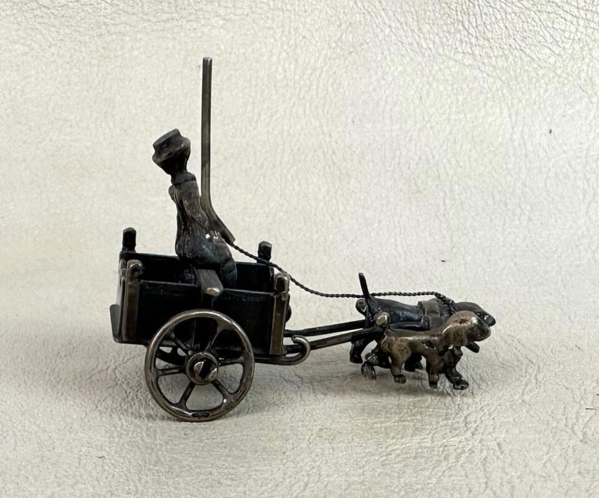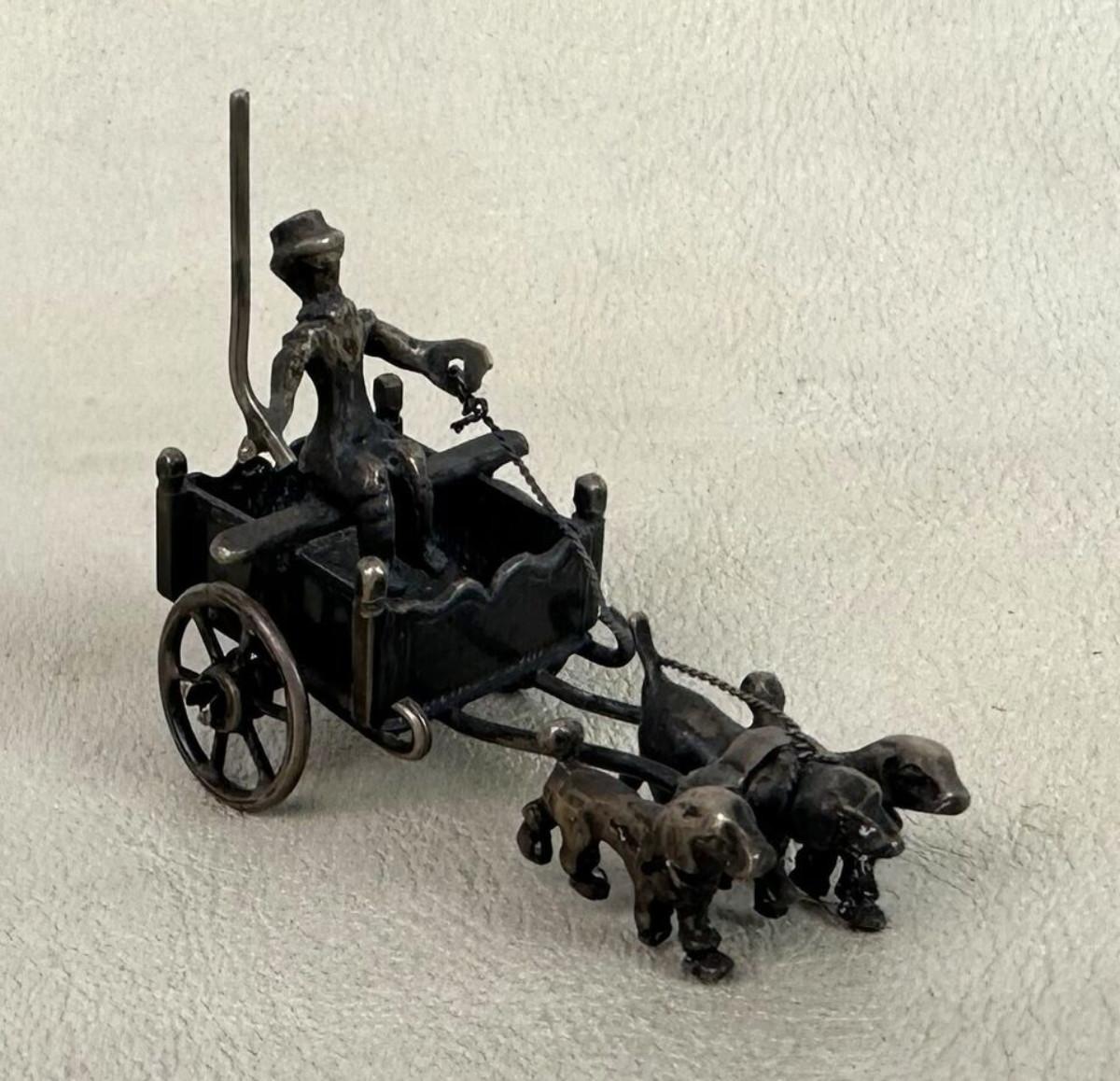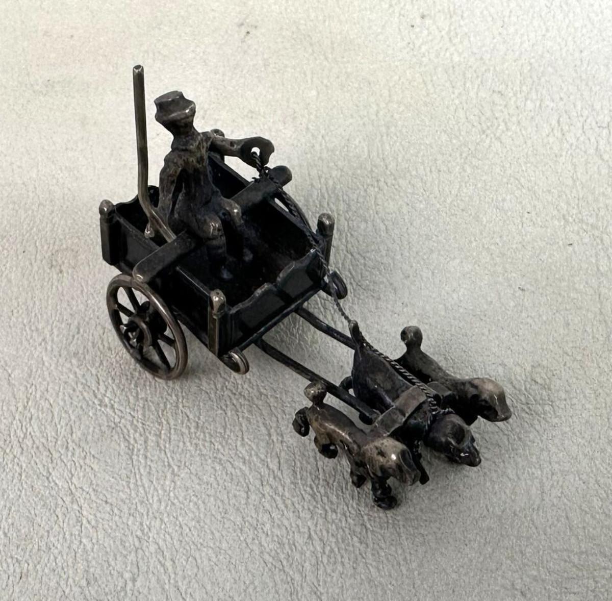 a marvelous antique Dutch silver miniature that we came across at a recent estate with many items from the 19th century...This Dog Cart made in the Netherlands bears the older sword hallmark used on smaller pieces (1814-1904)*..we have left the age patina as is...you will note that one of the dogs is out of alignment..a bend not a break..easily straightened by any jeweler or silversmith..Unusual in that there are three dogs...Measures 48mm x 38mm...1 7/8" x 1 1/2"h..